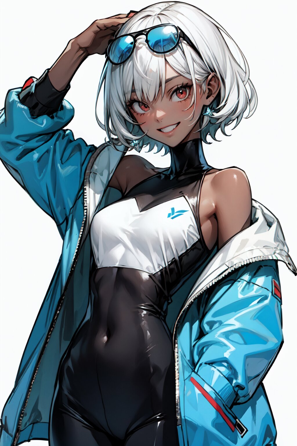 absurdres,detailed and intricate, (best quality),(1boy),(happy smile:1.2),(dark skin), BREAK,(sunglasses on head:1.1), TECHware,transparent clothes,clear cloth,Jacket bare shoulders, BREAK,white hair, BREAK,red eyes, BREAK,dynamic Angle, dynamic pose,