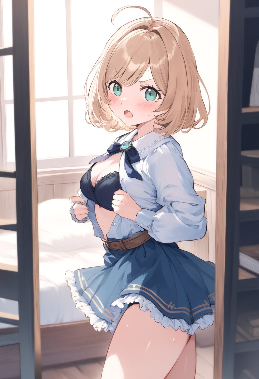 rating:general, best quality, amazing quality, great quality, very aesthetic, aesthetic, absurdres,1girl,short stature,medium breasts,slender,green eyes,blonde hair,medium hair,{{straight hair}},asymmetry bangs, swept bangs,ahoge,long sideburns,witch,half undress,Changing clothes,Black bra,Black Panties,change of blouse,(undressing clothes:1.3),open mouth,Flowing sweat,swet,sweat,blush,angry,anger vein,flustered,frown,inn room,bed room,profile,side view,from side,looking at viewer, best quality, amazing quality, very aesthetic, absurdres