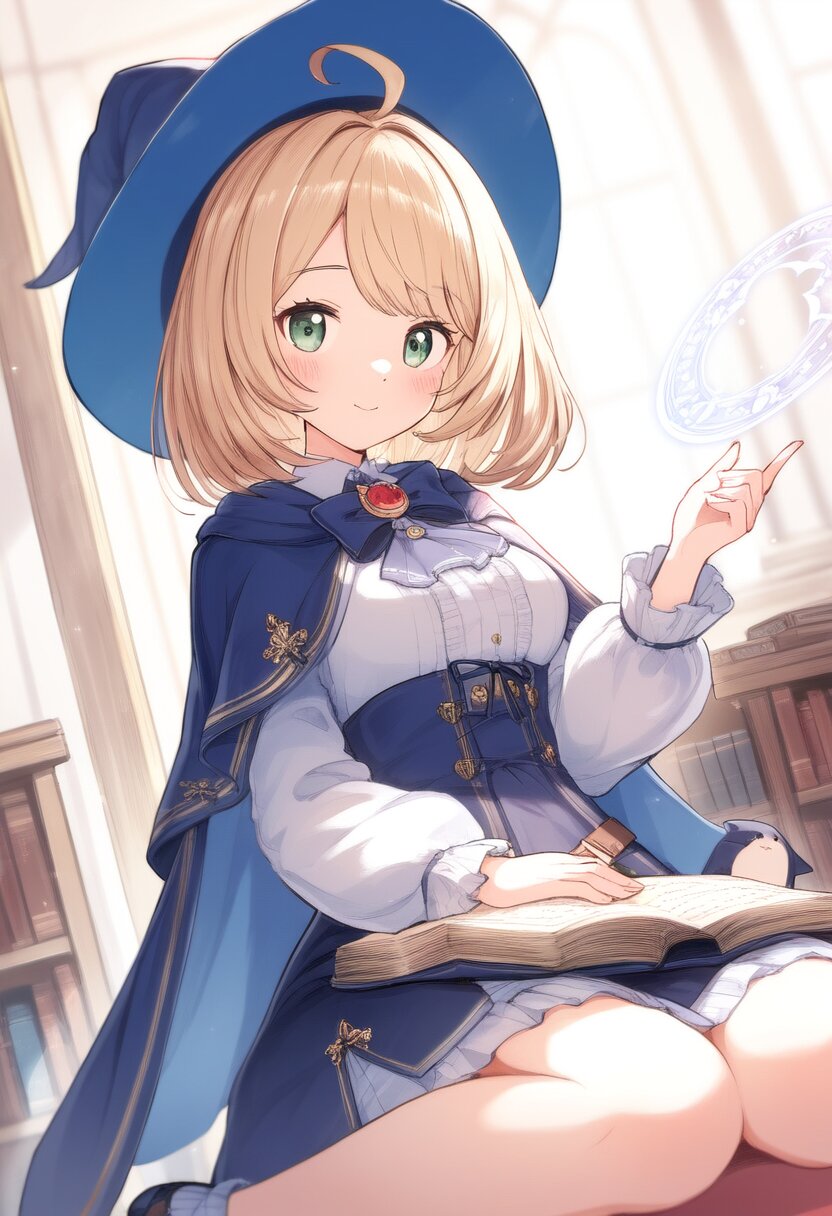 rating:general, best quality, amazing quality, great quality, very aesthetic, aesthetic, absurdres,girl,,short stature,medium breasts,slender,green eyes,blonde hair,medium hair,{{straight hair}},asymmetry bangs, swept bangs,ahoge,long sideburns,witch, witch dress,Indigo hat,Indigo cape,rose brooch ribbon,long sleeves,rod,holding book,sitting,wariza,magic circle,cat,library,Stuffed Shark,dutch angle, best quality, amazing quality, very aesthetic, absurdres