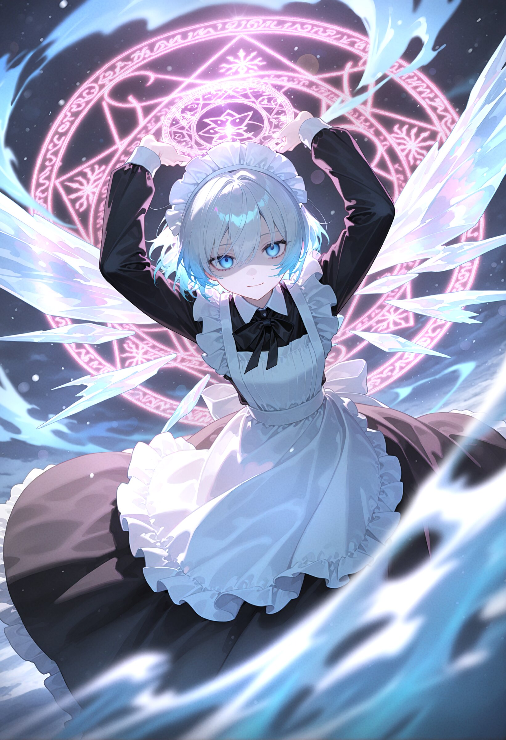 (face:1.3) from behind, thrust out one's hip, looking another, looking at viewer,, in winter, (absurdres absolutely resolution:1.2),texture, official art, ultra detailed, unity 8k wallpaper, dark theme, An Australian medieval-style village surrounded by beautiful mountains., 1girl, (ultra-detailed), solo, maid, pale skin, pale aquamarine hair, (beautiful empty eyes, light smile, shaded face:1.0), long sleeves classic maid uniform, long skirt, maid headdress, maid apron, luminous effect lens flare lotion shiny-glistening cute girl solo foreshortening, (fisheye lens angle:1.4), (blizzard aura, ice wings, snowflakes:1.1), (ultra detailed floating glowing magic circle:1.2), (high saturation) depth of field, bokeh, masterpiece, best quality, amazing quality, very aesthetic, absurdres, you can add tag scenery, (volumetric lighting), To make the background more distinctive. professional art lots of details, , overexposure, shiny-glistening, (watercolor style:1.2), (pastel color style:1.2) <lora:noline (1):-0.5> <lora:sdxl2-flat2-512b:0.15> <lora:facelightup_xl_v10:0.5>