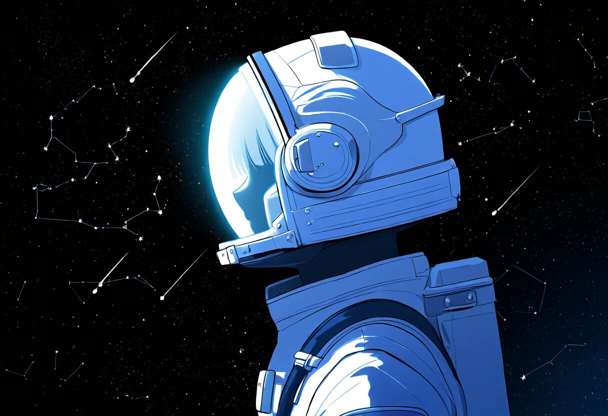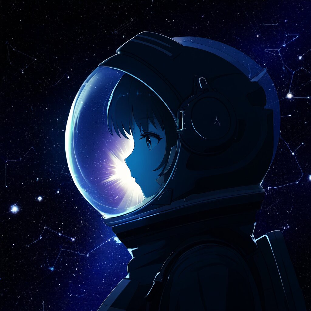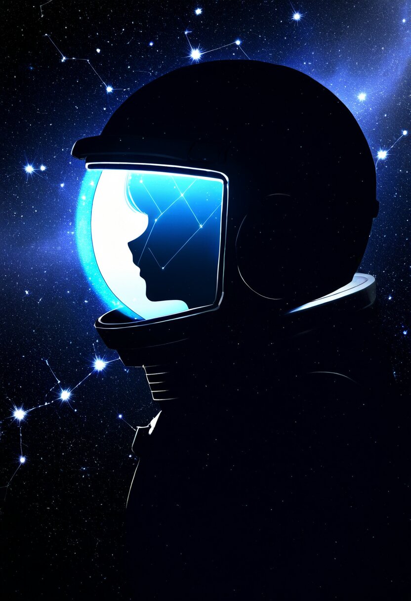 1girl, solo, {{{silhouette:1.4}}}, pale color, partically colored, monochrome two-tone, monochrome, space helmet, astronaut, full armor, spacesuit, {{{from side, profile}}}, {{{{portrait}}}}, {{{{{constellation, light particles, glowing, luminescence, glowing particles background}}}}}, space, effect, glowing, luminescence, glowing particles background
