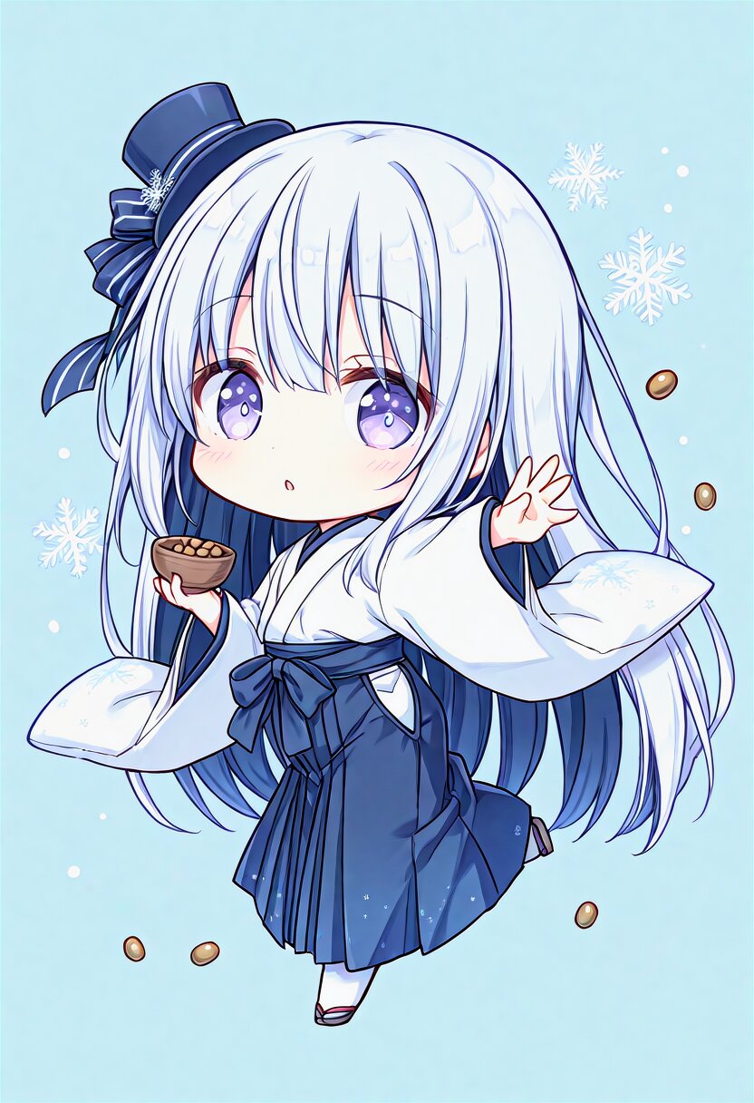 best quality, (pale color:0.6), blue theme, portrait, simple background,snowflakes background, (chibi:1.3), (chibi girl:1.2), solo, (facing the front:0.8), looking at viewer, parted lips,(Expressionless:0.8), big eyes,(half-closed eyes:0.8), (tareme:0.9),pale purple eyes, (silver hair:1.1), (dark blue hair colored inner hair:0.8), long hair,very long hair, eyebrows visible through hair, darkblue hakama, hakama skirt,miko, mini hat,strapping ribbon, throwing pose,, (throwing beans:1.2), holding beans in one hand, small wooden square bowl in one hand, from side, <lora:noline-16oa:-1.5> <lora:chibi_paru:-1.0> <lora:sdxl2-flat2-512b:-1.0>
