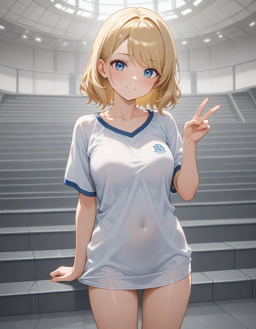 <lora:hyper_sdxl_8_step_lora_f16:1>,, 1girl, v, university, Auditorium, BREAK 18 years old, girl, short hair, wavy blonde hair, swept bangs, medium breasts, slender, frosty blue eyes, thin clothing, blush, BREAK masterpiece, amazing quality, best quality, very aesthetic, ultra-detailed, 8K, newest, Japanese, vivid,