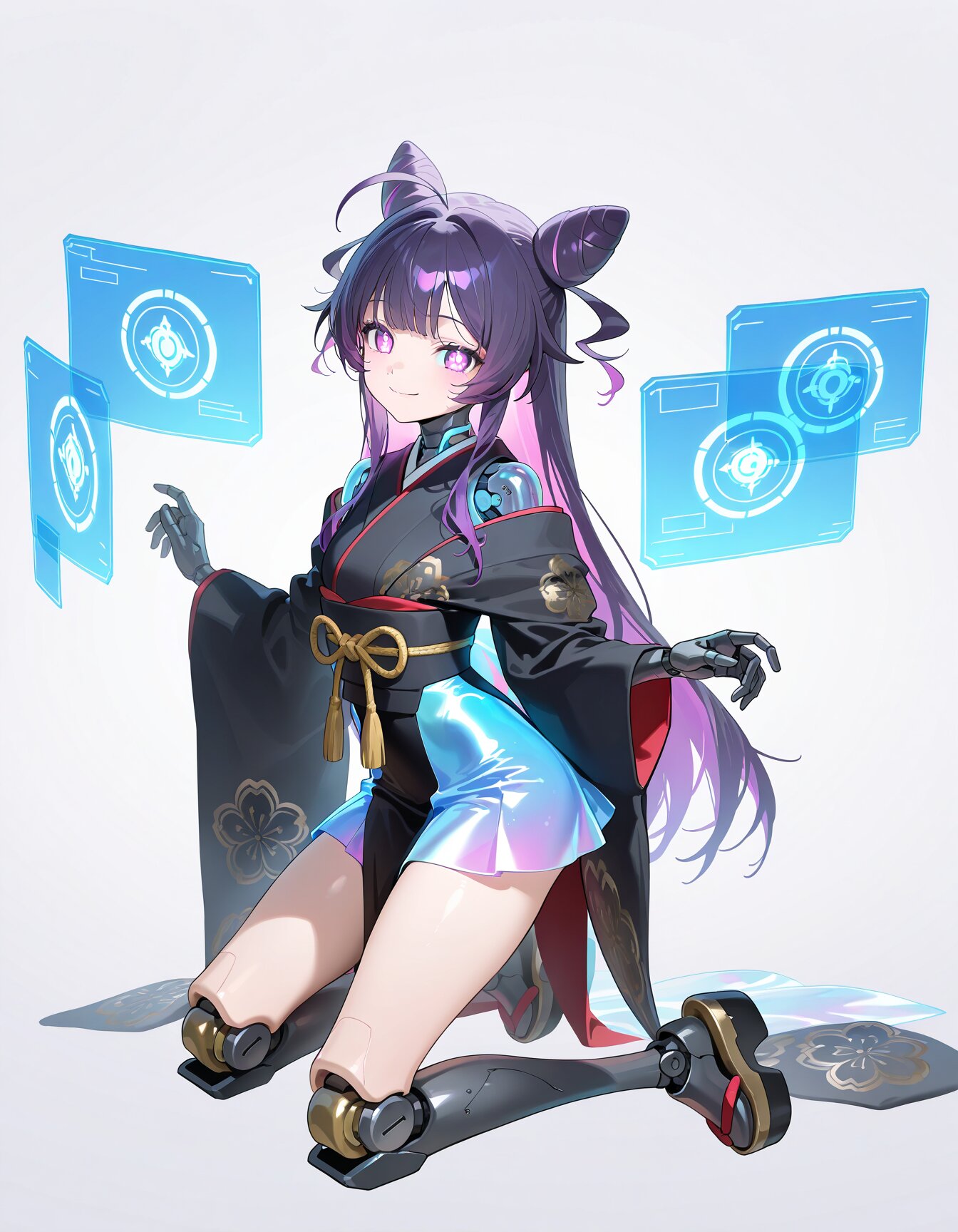 from side, looking at viewer, long shot, looking at viewer 1girl android, shoulder length hair, cone hair bun wispy bangs ahoge shiny and strong hair, black kimono, japanese ornate dress, (blissful smile:1.0), 19yo, purple hair ,, beautiful gold eyes, mechanical arms, mechanical eyes, mecanical legs, glowing beauty of machinery, holographic interface, holographic clothing, (simple background:1.0) light leak, kneeling masterpiece, best quality, amazing quality, very aesthetic, absurdres professional art lots of details, , overexposure, shiny-glistening, (watercolor style:1.0), (pastel color style:1.0) <lora:noline (1):-0.5> <lora:sdxl2-flat2-512b:0.15> <lora:facelightup_xl_v10:0.5>
