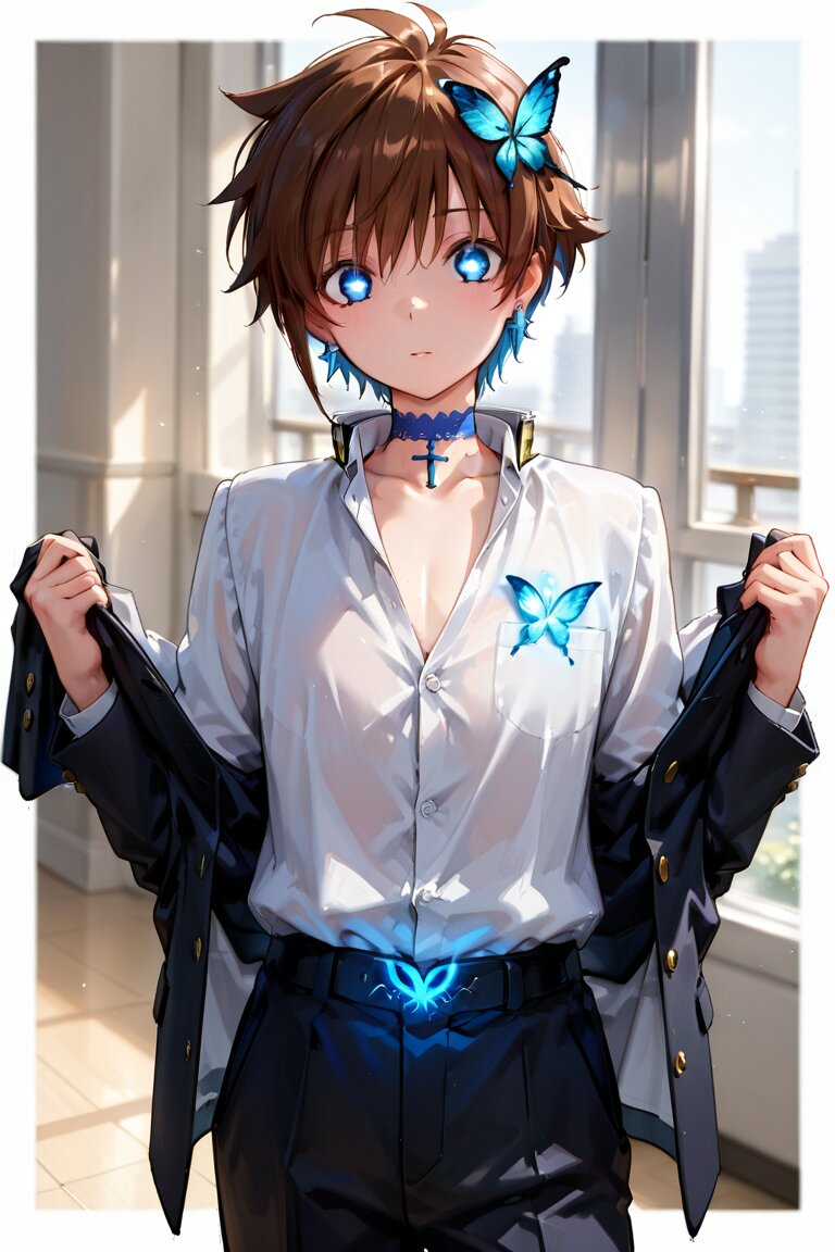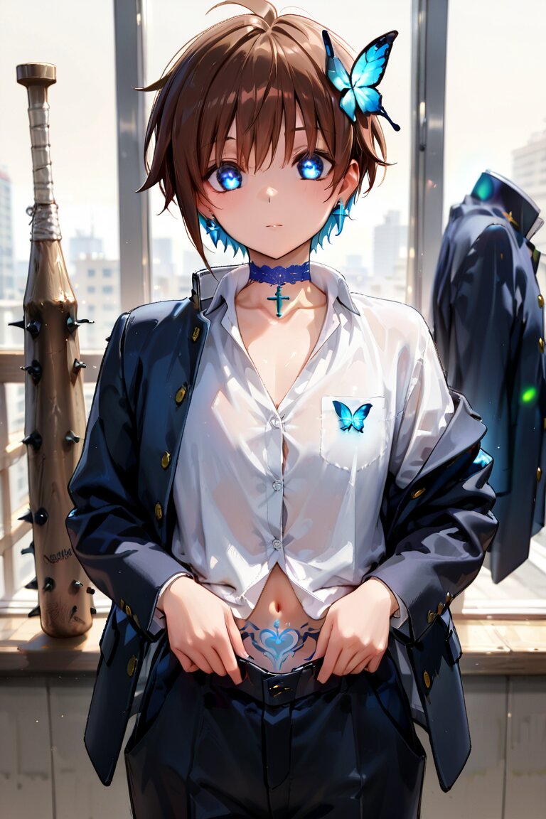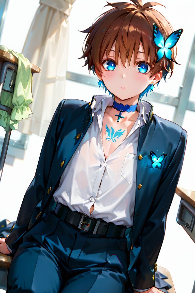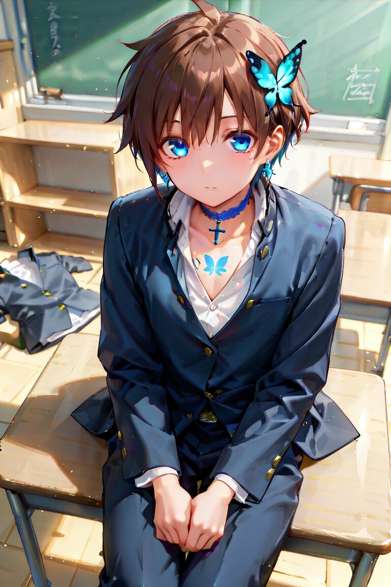 Masterpiece, Top Quality, Sketch, Androgynous Beauty (Cute angle, Cute and childish) (Boys: 0.5) Young big eyes, (rito_yuuki, Yuuki Rito, Brown hair, Brown eyes, Spiky hair: 0.7), (Shiny black hair, Nakano Ichika hairstyle: 0.3), (Blue jewel eyes: 0.5) Very short hair, (Blue butterfly hair accessory), (Blue shiny cross earrings, Blue inner hair) (Cross lace choker: 1.2), , Blue pattern on chest, Shiny chest, Blake, (Jet black gakuran, uniform), Boys uniform, (Thick black gakuran jacket, (Closed jacket: 0.6)), (White button-up shirt, (Closed white collared shirt)) Blake, (Blue glowing pubic hair tattoo shining through gakuran pants (Inscribed on the lower half of the gakuran pants), (Chest tattoo: 0.5), bat mark, glowing desire mark) Blake (unworn clothes, a green long dress for a woman in her hands) and an unused long-skirted dress shyly held in both hands: 1.4) ,Sit at a desk in the classroom