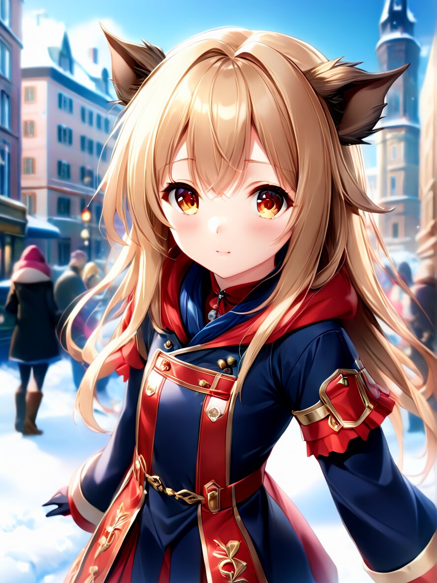 absurdres, incredibly absurdres, huge filesize, highres, best quality, high quality, professional quality, intricate, extremely detailed CG, ultra detailed, detailed, illustration, outdoor, modern, Europe, winter, 1girl, cute petite girl, amber eyes, light brown hair, long hair, wild boar's ears, winter clothes,