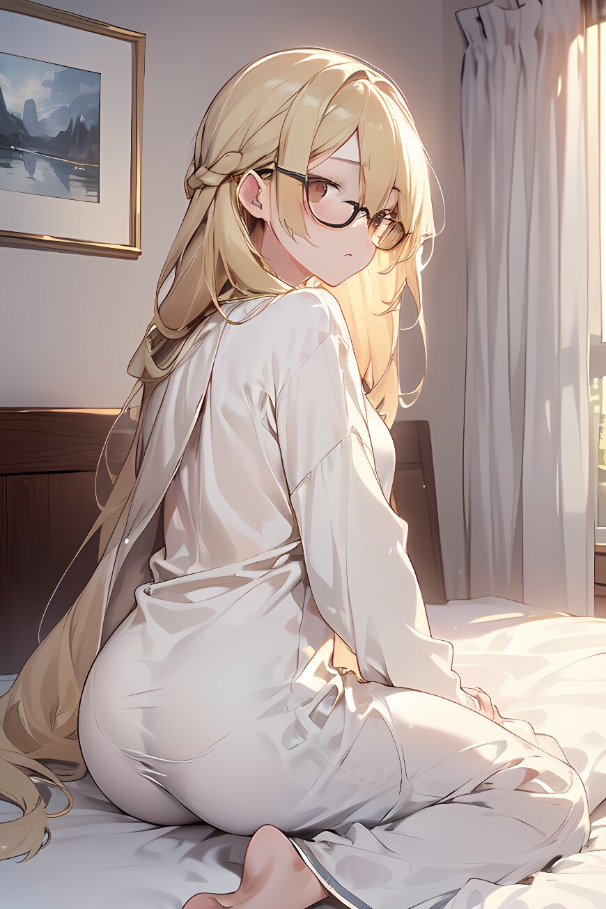 1 lady, long hair, blonde hair, glasses, sleepy, white pajamaas, sitting on bed, (looking back, morning), ,Art Style 2.0