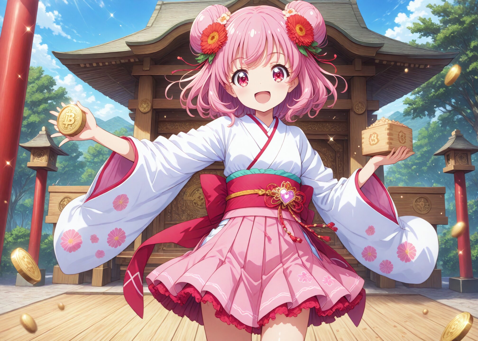 <lora:Nob10_ill_Hikari_v1:1> looking at viewer, red_eyes, wearing hakama, pink hakama:1.2), <lora:Any_Nov_btclogo_Bara_v1:0.7> btclogo, coin, throwing, open mouth, shrine, holding, outdoors, looking at viewer, motion blur, aiming at viewer, smile, blue sky, stage, wooden stage