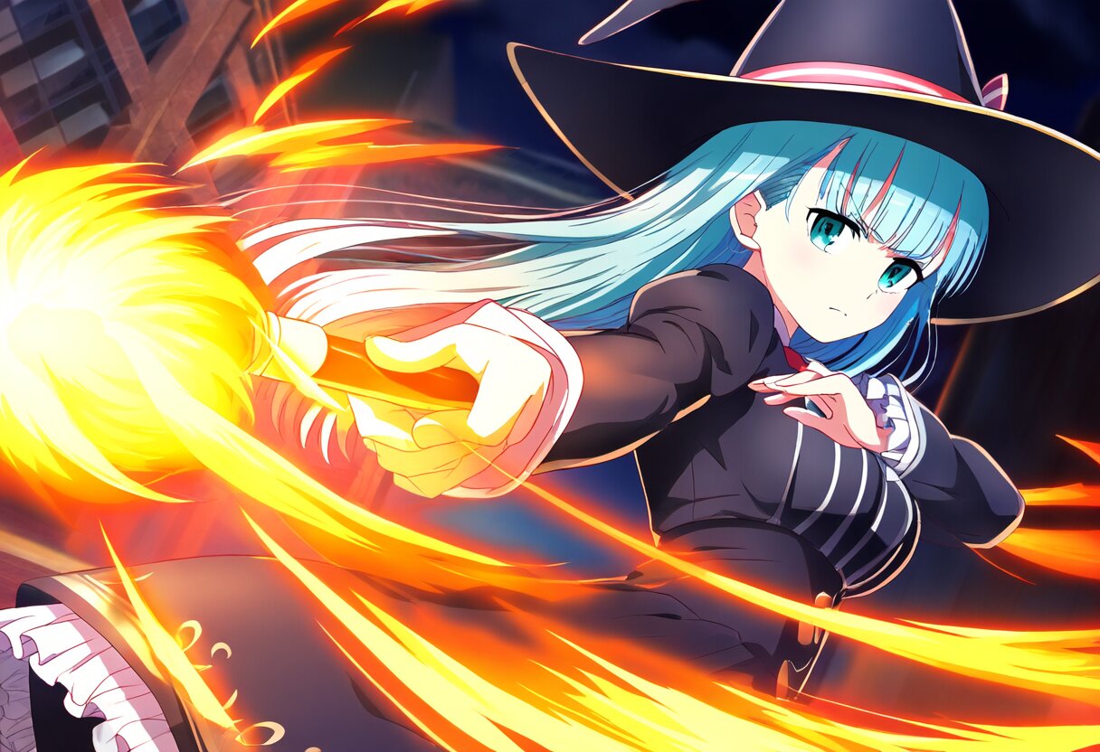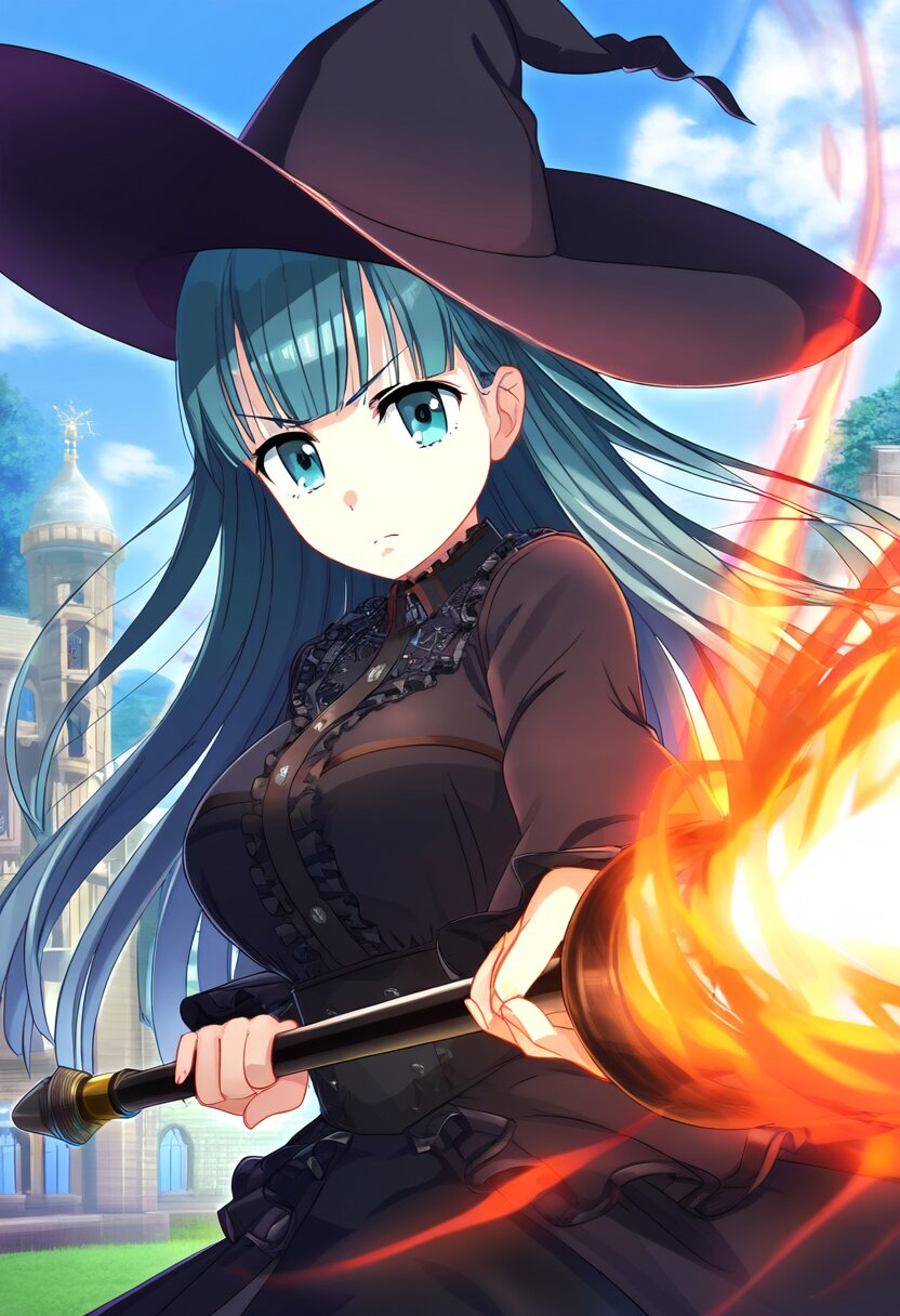 {{{highly detailed}}}, {{official style}}, {{game cg}}, {{{{getsuyoubi no tawawa}}}}, 1girl, solo, aqua eyes, {{{long hair, straight hair}}}, aqua hair, blunt bangs, {{serious}}, medium breasts, wearing a cute frilled dress, black dress, cute design hat, witch's hat, fighting stance, with magic wand, battle, outdoors, red magic square, flame magic, manipulating flames, no humans, {{{masterpiece}}}, {{{best quality}}}, {{{very aesthetic}}}, {{{ultra-detailed}}}, {illustration}, {{{extremely detailed}}}, {{{an extremely delicate and beautiful}}}