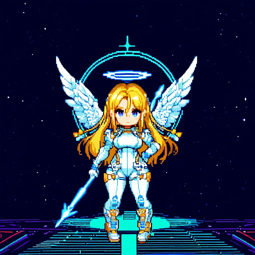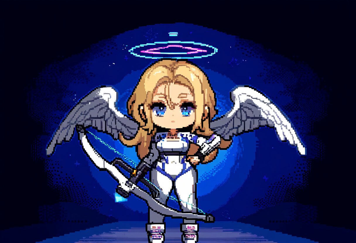 {{{highly detailed}}}, {{{interspecies}}}, {{{beautiful detailed}}}, {{{{{pixel art, dithering}}}}}, {{kawaii}}, {{{{chibi}}}}, {{cyberpunk}}, {{{holding a bow, playing a bow, bow and arrow}}}, 1girl, solo, blue eyes, very long hair, straight hair, blonde hair, hair between eyes, large breasts, standing, cowboy shot, serious, {{{angels, halo, white bodysuits, mechanical wings}}}, starry sky, night, outdoors, facing the front, looking at viewer, straight-on, close to viewer, full body, solo focus, {{{masterpiece}}}, {{{best quality}}}, {{{very aesthetic}}}, {{{ultra-detailed}}}, {illustration}, {{{extremely detailed}}}, {{{an extremely delicate and beautiful}}}