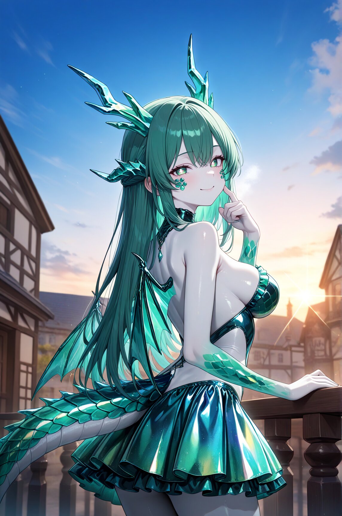 Dragon girl, very petite girl, very short cute girl, 10 years old, child, loli face, round face, provocative smile, left hand poking cheek, right hand behind, looking back, more creative, vivid, anime illustration, expressionless, masterpiece, highest quality, high resolution, more details, more accurate, HDR, 8K, Hikari, long hair girl with crystal emerald green iridescent body, emerald green iridescent long hair, white skin, gravure idol body, very revealing, open chest, transparent body, captivating the viewer complete, emerald green iridescent scales on cheeks, dragon horns, dragon wings, dragon tail, slanted eyes, big eyes, emerald green iridescent pupils, powerful eyes, pupils looking up, CG realistic eyes, a small shining blue star in the center of the pupil, dawn sky, morning, impressive old European style town background, CG realistic otherworldly background, CG realistic nebula, beautiful CG sunny sky, beautiful CG synthetic sunlight, neon appearance, iridescent neon, neon iridescent frilly skirt that reaches above the knees, neon body, beautiful breasts, slightly large breasts, absolute territory, chest emphasis, no cheeks, masterpiece, best quality, newest, very awa