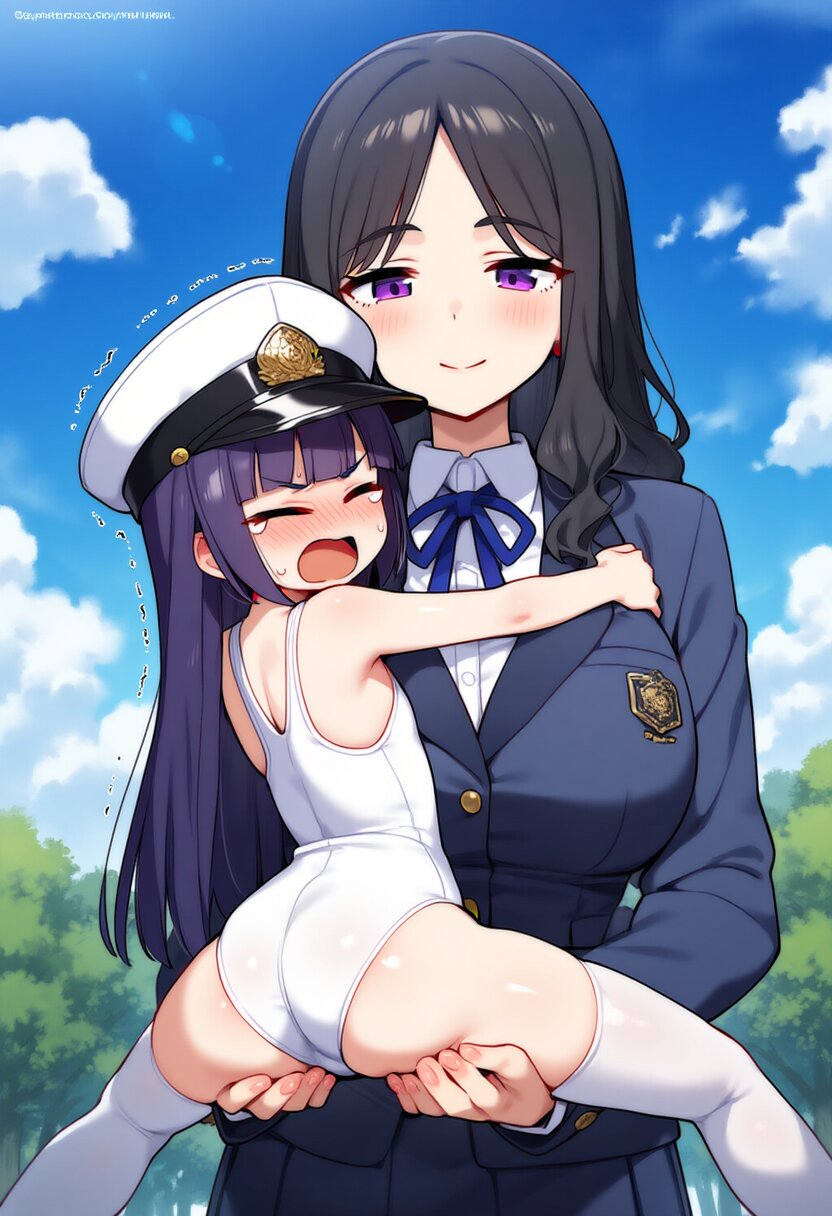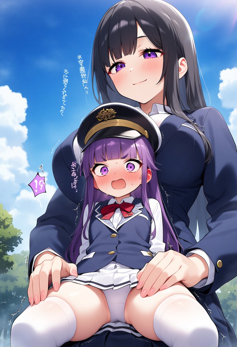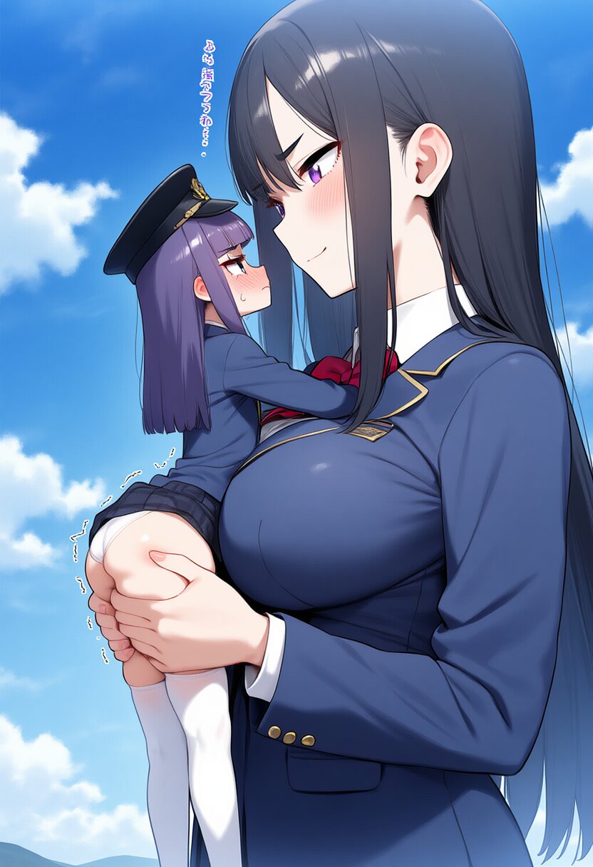 rating:sensitive, {ai-generated}, ai-assisted, {{{Japanese anime coloring}}}, {{year 2024}},2girls,yuri,looking at each other,midday,outdoor,{in sunny mid−air},from below, masterpiece, best quality, ultra detailed, perfect fingers, high resolution, absurdres, perfect anotomy, detailed background, unity 8k wallpaper