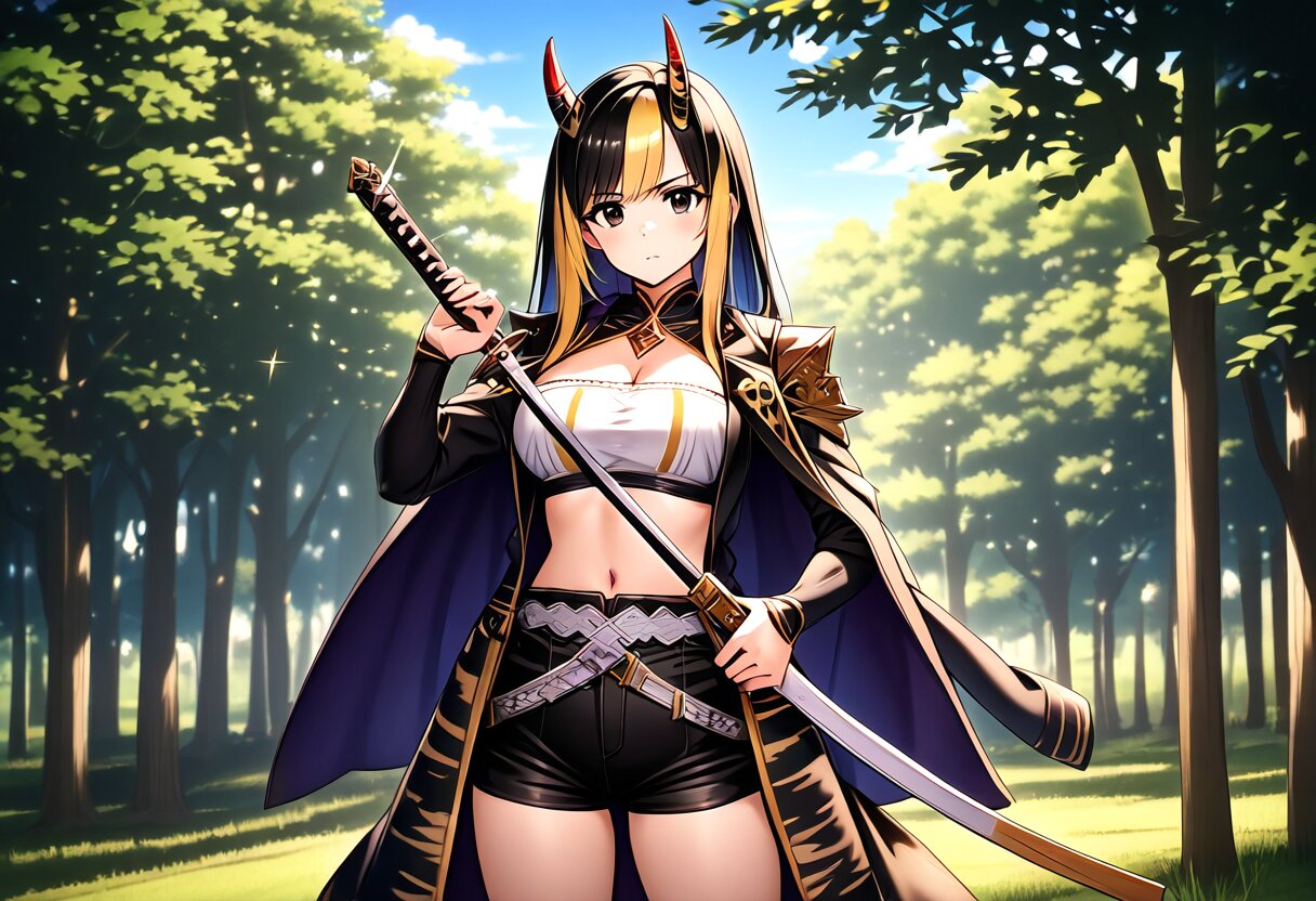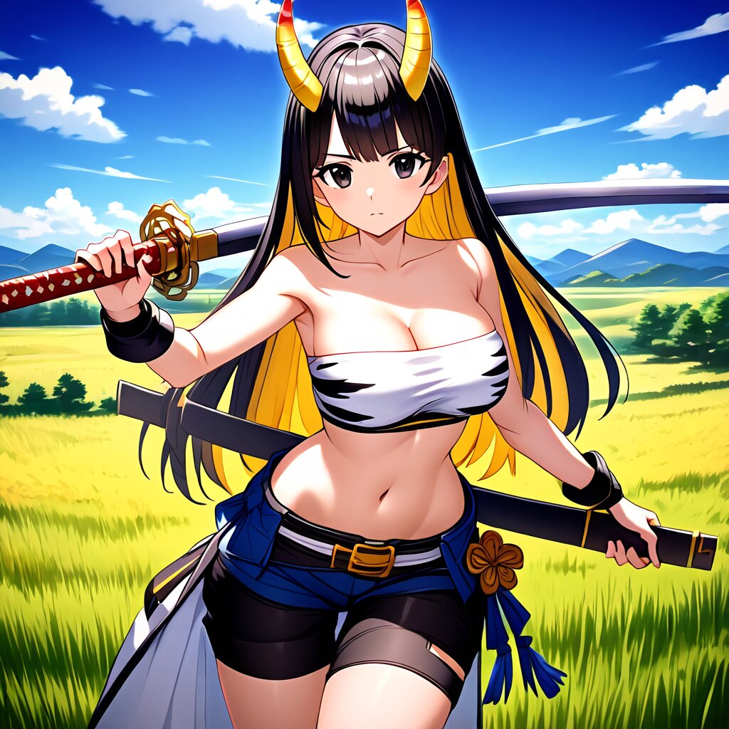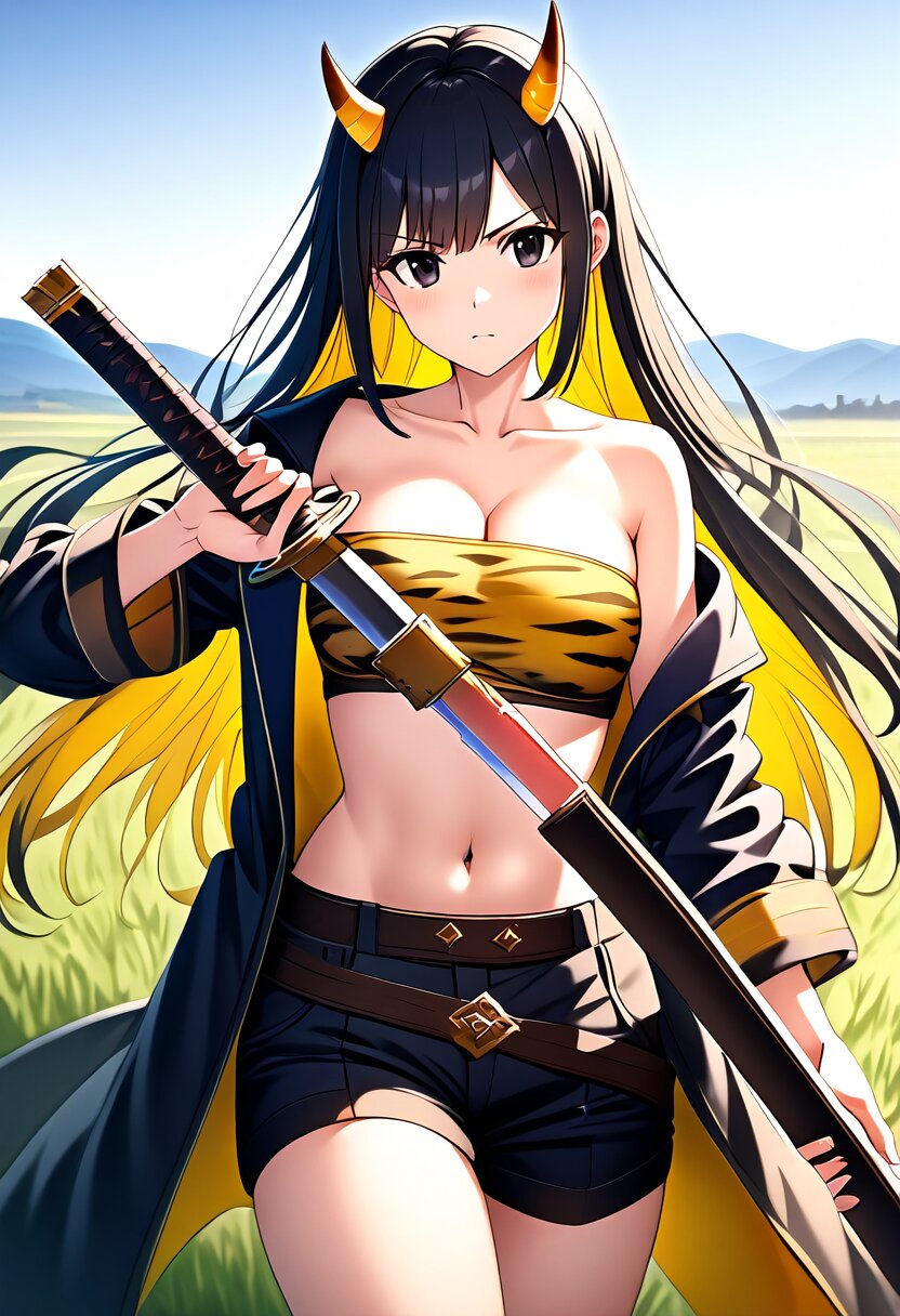 {{{highly detailed}}}, {{official style}}, {{game cg}}, style of ai-generated, {{cygames style, princess connect!}}, {{slender}}, 1girl, solo, black eyes, serious, {{two-tone hair, yellow hair, black hair}}, long hair, straight hair, swept bangs, large breasts, cowboy shot, oni horns, yellow tiger-striped bandeau, yellow tiger-striped shorts, {{holding a giant katana}}, grasslands, outdoors, {{{masterpiece}}}, {{{best quality}}}, {{{very aesthetic}}}, {{{ultra-detailed}}}, {illustration}, {{{extremely detailed}}}, {{{an extremely delicate and beautiful}}}