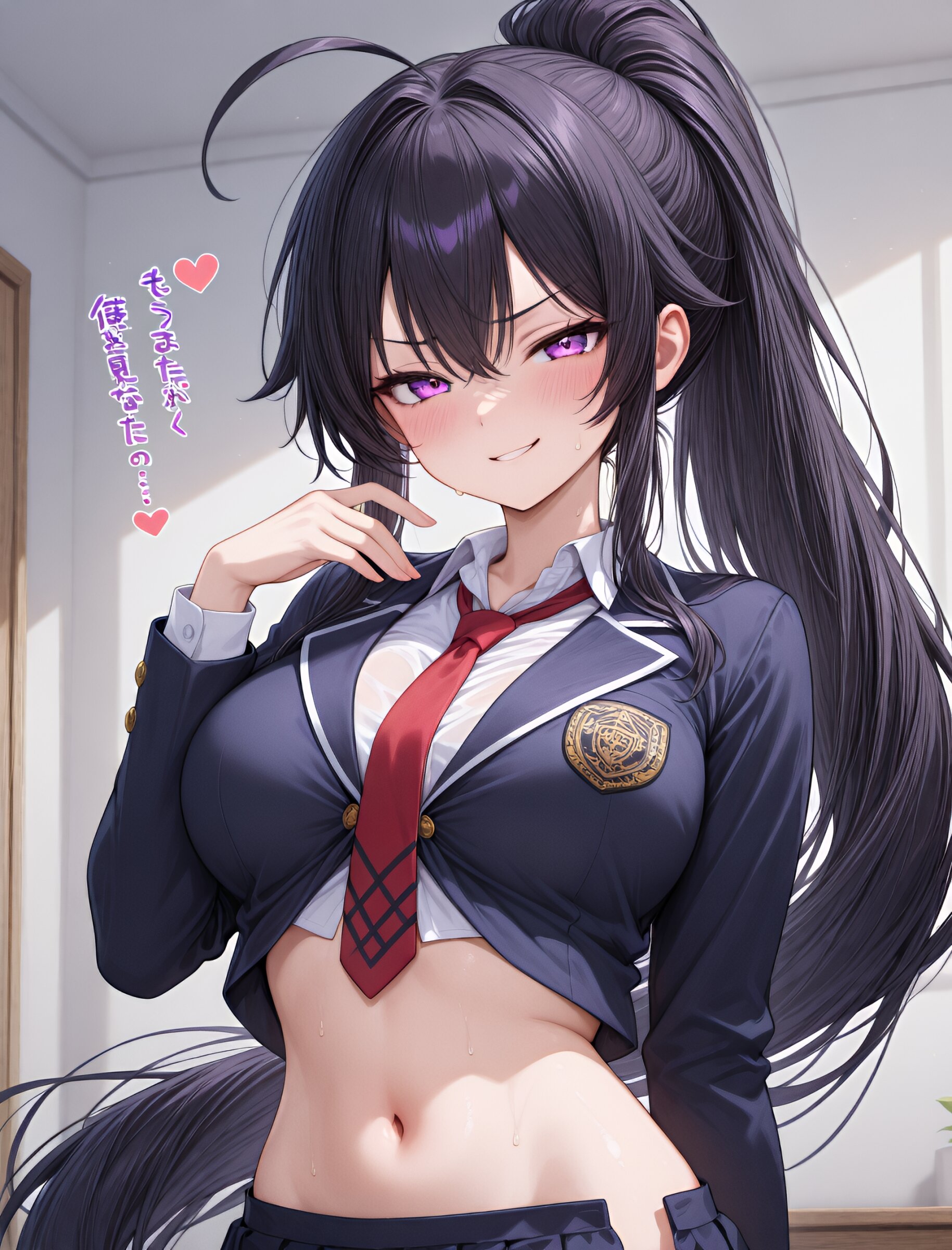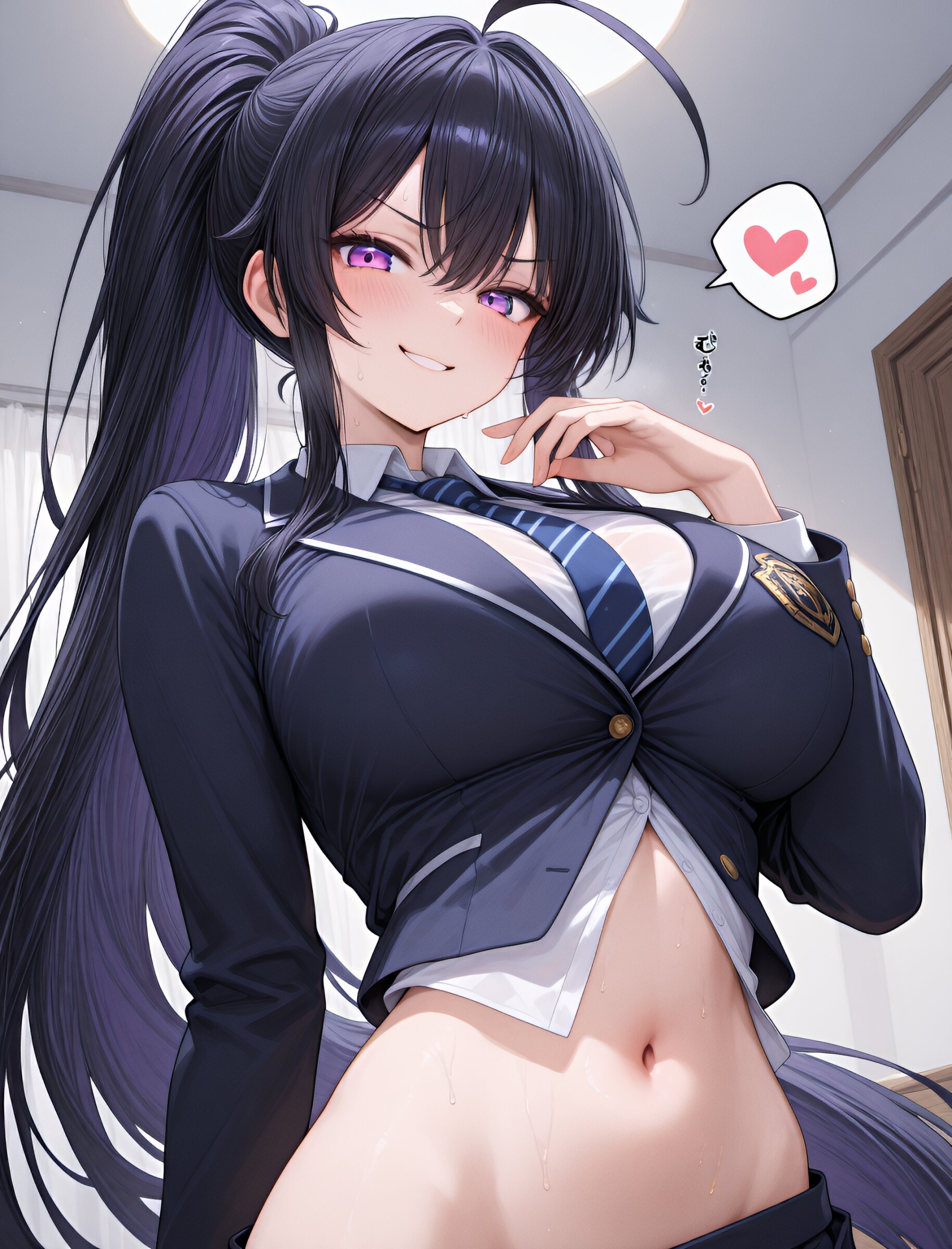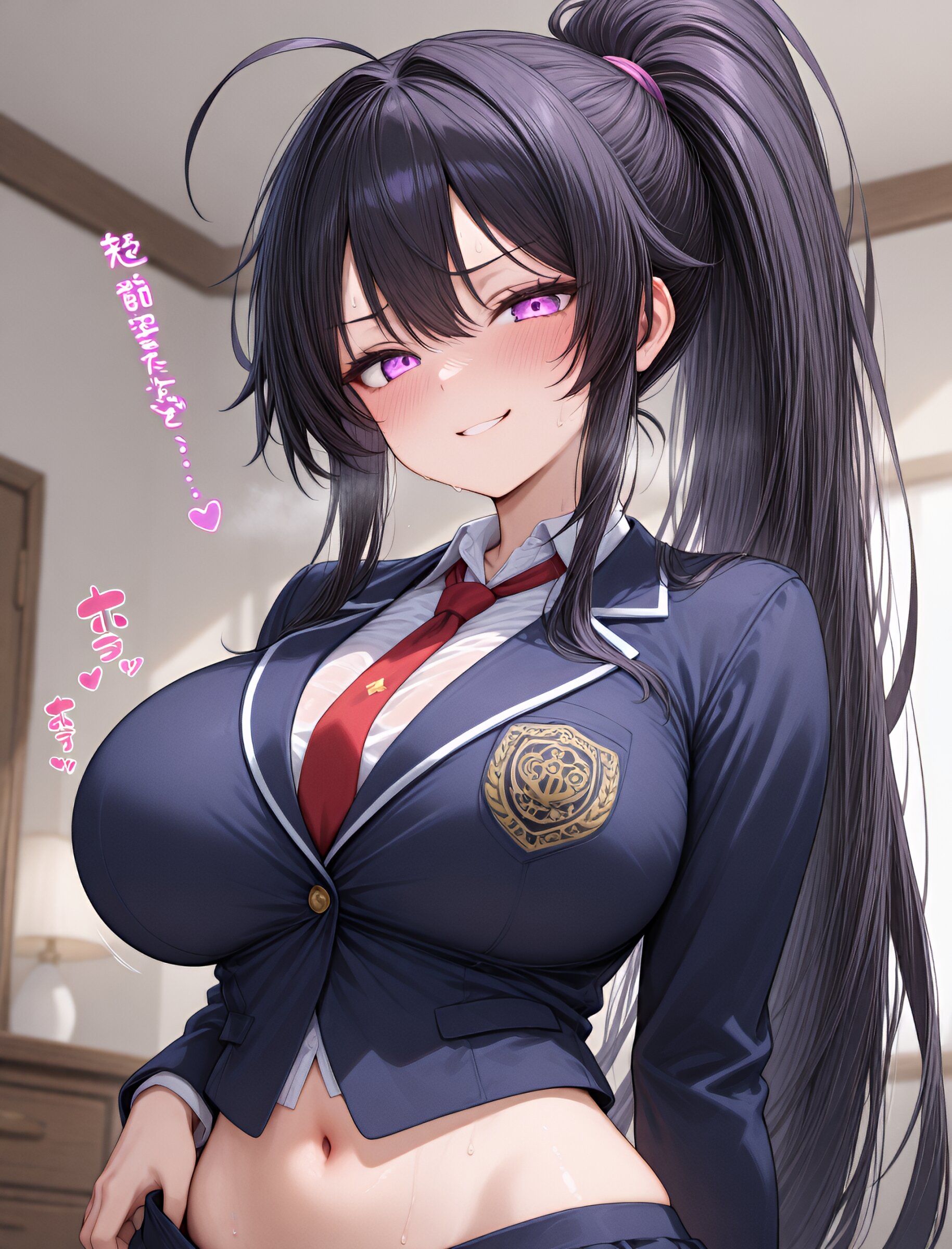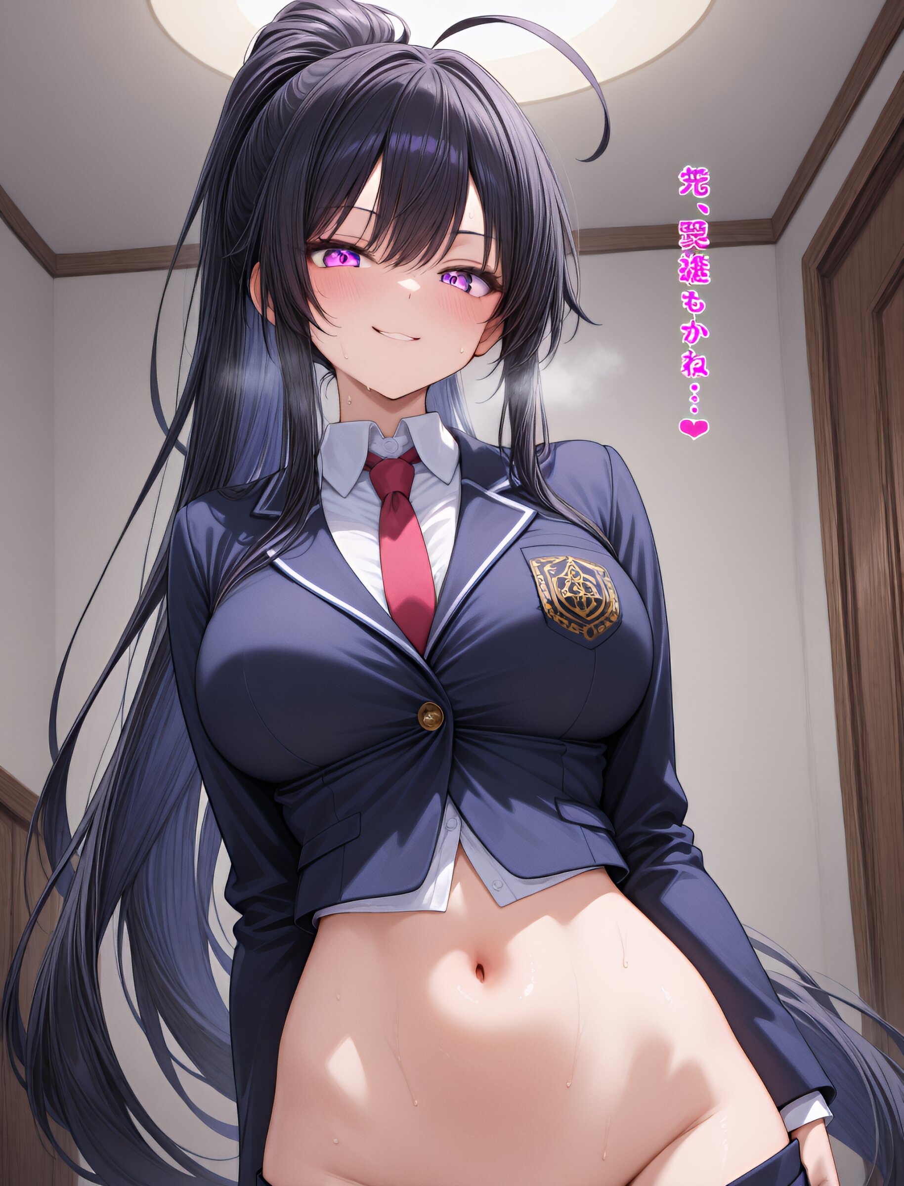 (upper body:2.2),solo,glowing and smooth skin, delicate and soft facial features, radiant smile, charming and feminine pose, low-angle view:0.7, absurdly long black hair, ahoge, high ponytail, bangs, very narrow purple eyes,(long legs:1.6),large breast and hips,(bedroom eyes), (deeply flushed face:1.2),(sweat glistening),(her face deeply flushed from the sex),(sweatdrop:1.3),(smirk:1.3),(navel), (black school blazer:1.3),(tie),(shirt),(long sleeve),(skirt),(skirt pull),(open cloth:1.1),(layer of clothes),(collared shirt),standing, (overflowing with heart symbols 💕 💕 💕:1.2),(onomatopoeia),(sound effects), (crimax:1.5),(looking at viewer),(in living), dynamic angle,masterpiece,best quality,very aesthetic, <lora:noobai_ep11_stabilizer_v0.11_fp16:0.7> <lora:StS-Illustrious-Detail-Slider-v1.0:2.> <lora:sdxl-hairdetailer_02:2>