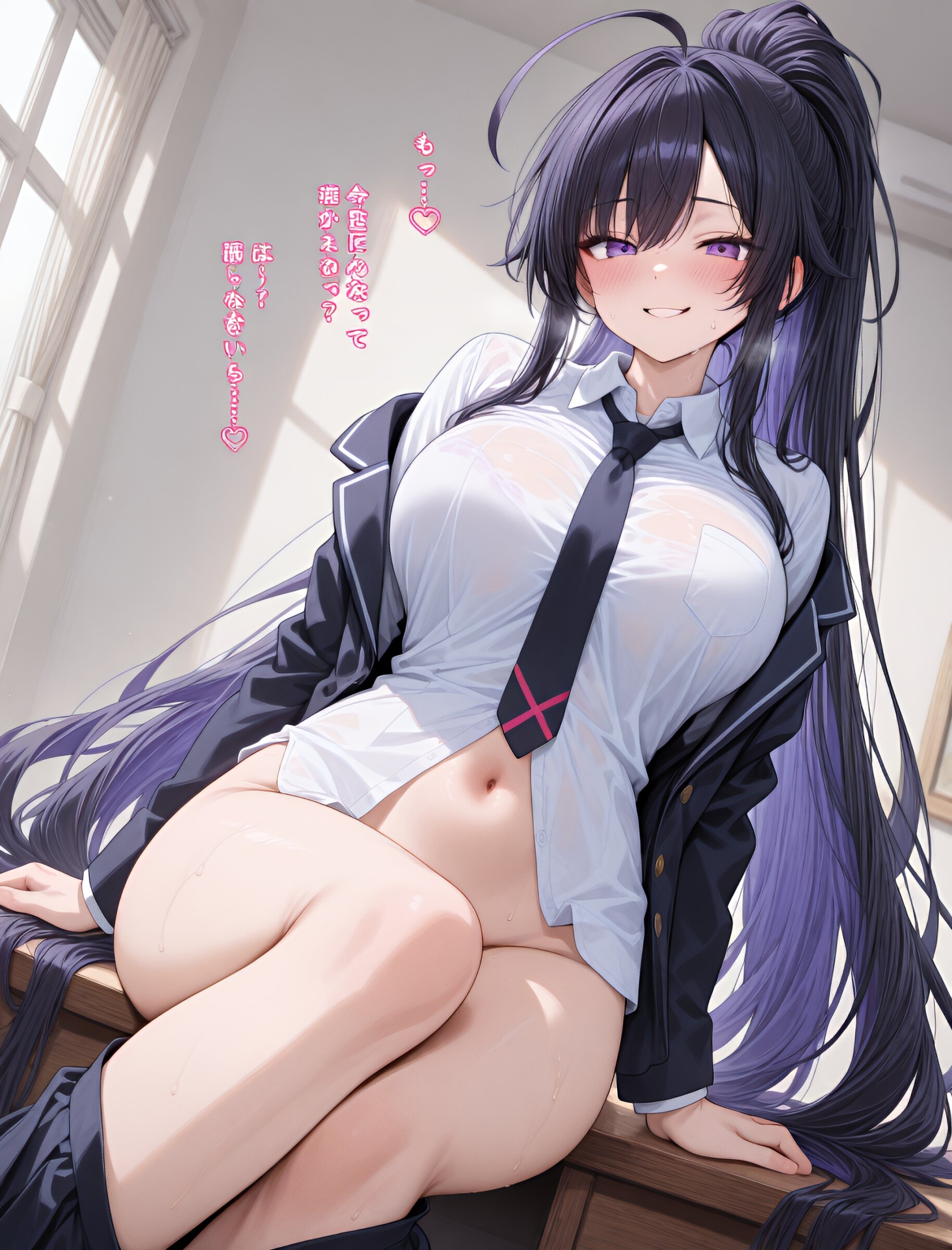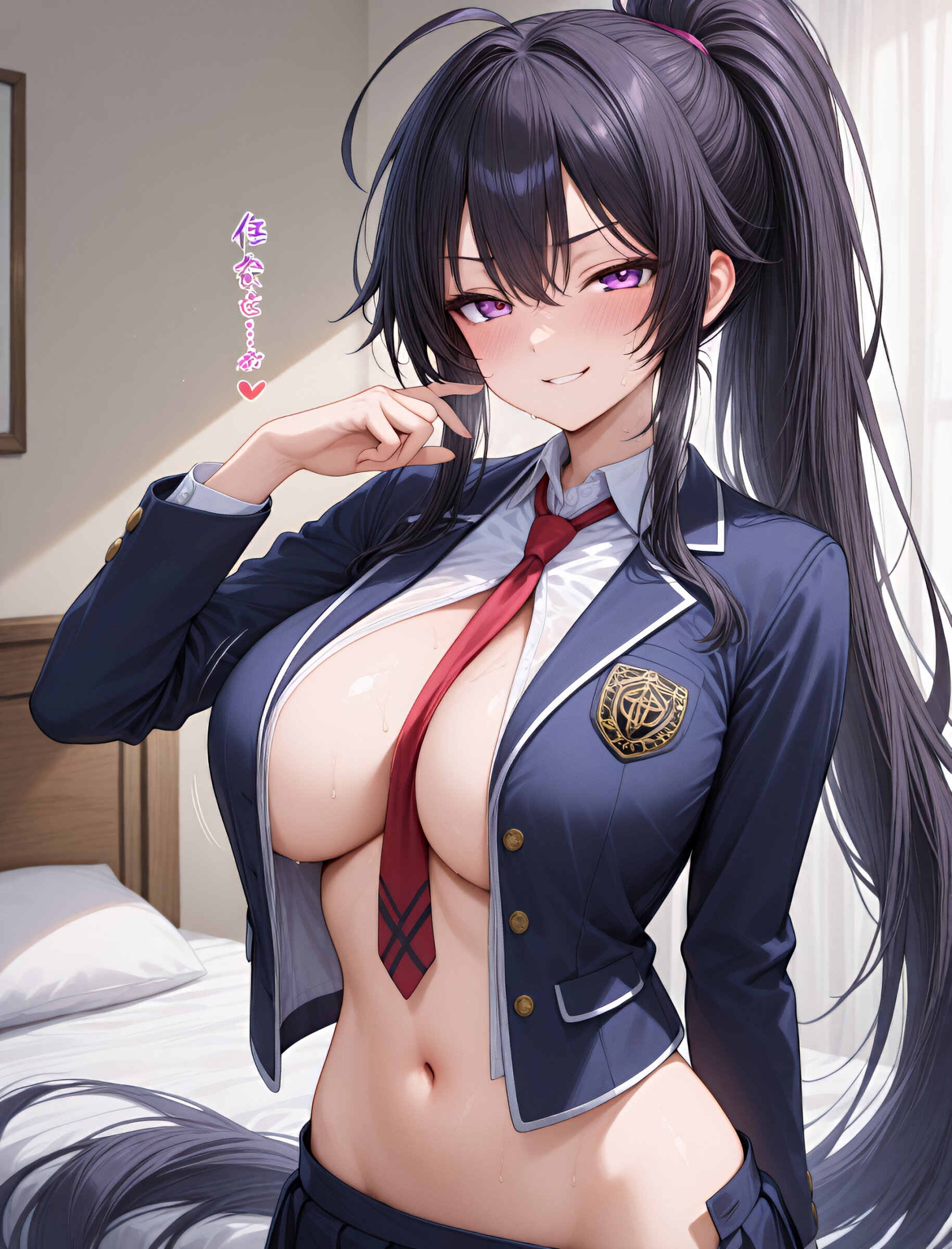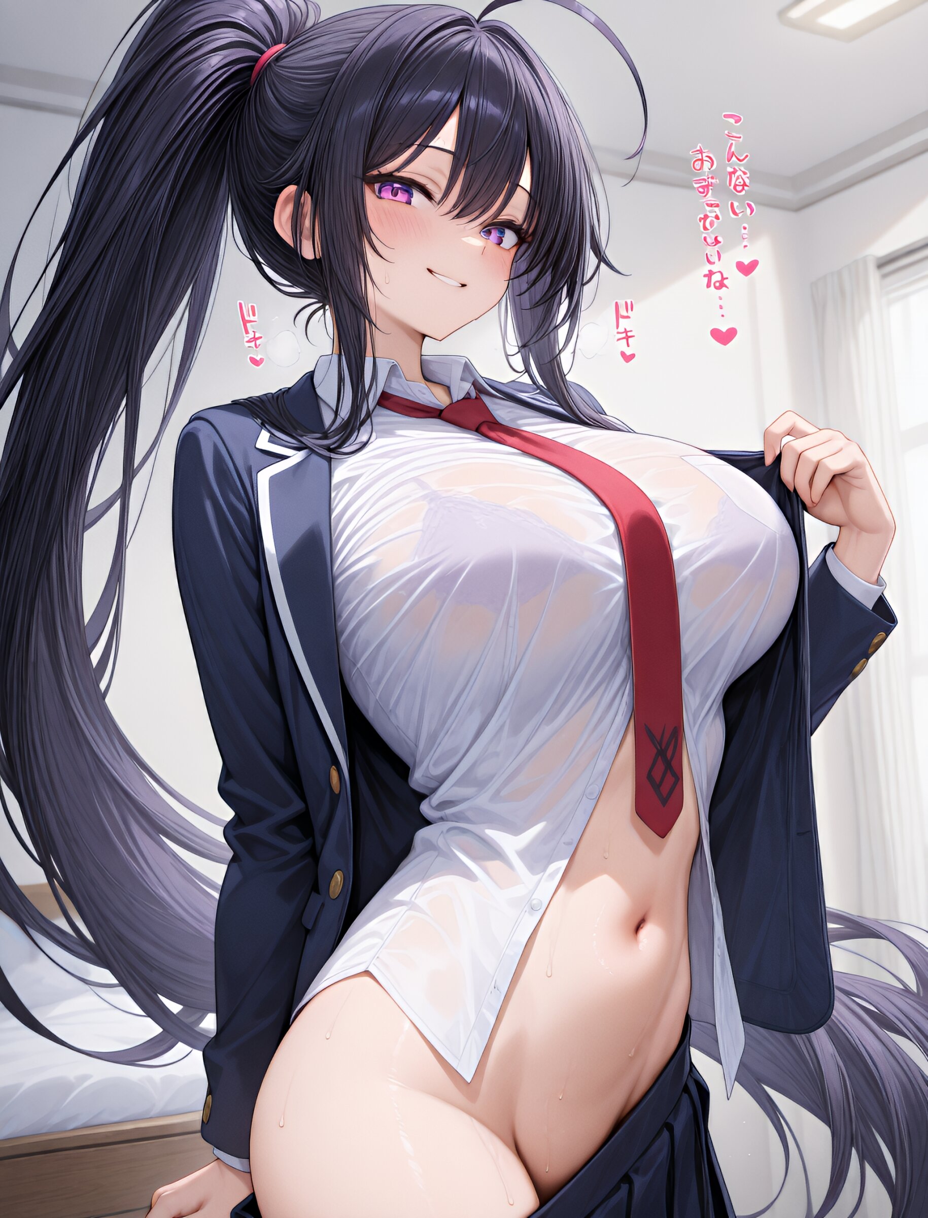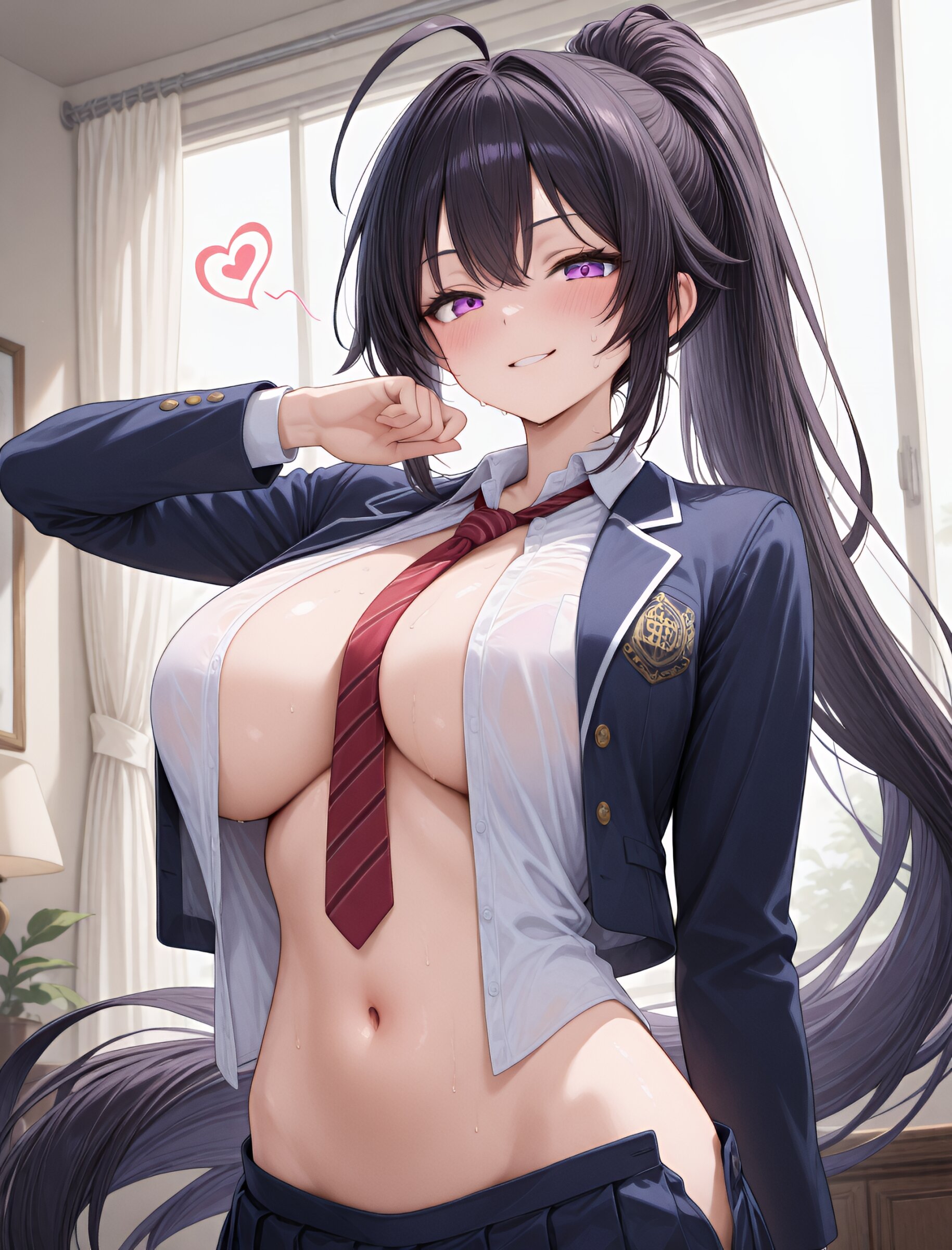 (upper body:2.2),solo,glowing and smooth skin, delicate and soft facial features, radiant smile, charming and feminine pose, low-angle view:0.7, absurdly long black hair, ahoge, high ponytail, bangs, very narrow purple eyes,(long legs:1.6),large breast and hips,(bedroom eyes), (deeply flushed face:1.2),(sweat glistening),(her face deeply flushed from the sex),(sweatdrop:1.3),(smirk:1.3),(navel), (black school blazer:1.3),(tie),(shirt),(long sleeve),(skirt),(skirt pull),(open cloth:1.1),(layer of clothes),(collared shirt),standing, (overflowing with heart symbols 💕 💕 💕:1.2),(onomatopoeia),(sound effects), (crimax:1.5),(looking at viewer),(in living), dynamic angle,masterpiece,best quality,very aesthetic, <lora:noobai_ep11_stabilizer_v0.11_fp16:0.7> <lora:StS-Illustrious-Detail-Slider-v1.0:2.> <lora:sdxl-hairdetailer_02:2>