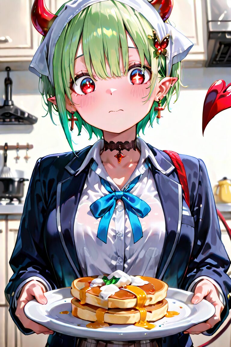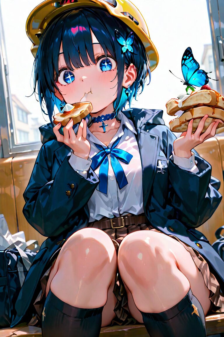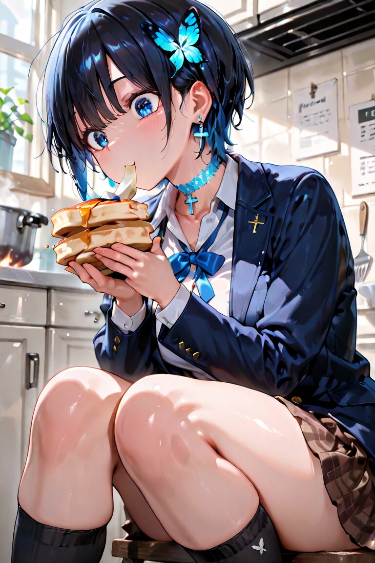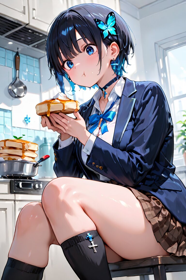 (Top quality, masterpiece, high quality (Victorian dress), ) 1 person, solo, 17 years old, young big eyes, (shiny black hair, Nakano Ichika's hairstyle), very short hair, (blue butterfly hair accessory), shiny cross earrings, blue hair, (cross lace choker: 1.0), blue jewel eyes, (blue ribbon around neck), BREAK Girl eating pancakes, (close-up of oversized pancakes) BREAK (black very thigh-high socks), (very long black socks cover the thighs, and super long black socks decorate the beautiful legs of a plump, voluptuous woman) thick blazer jacket, white button-down shirt, (brown pleated skirt), brown plaid skirt), BREAK Background is kitchen, pancake mix and cooking utensils