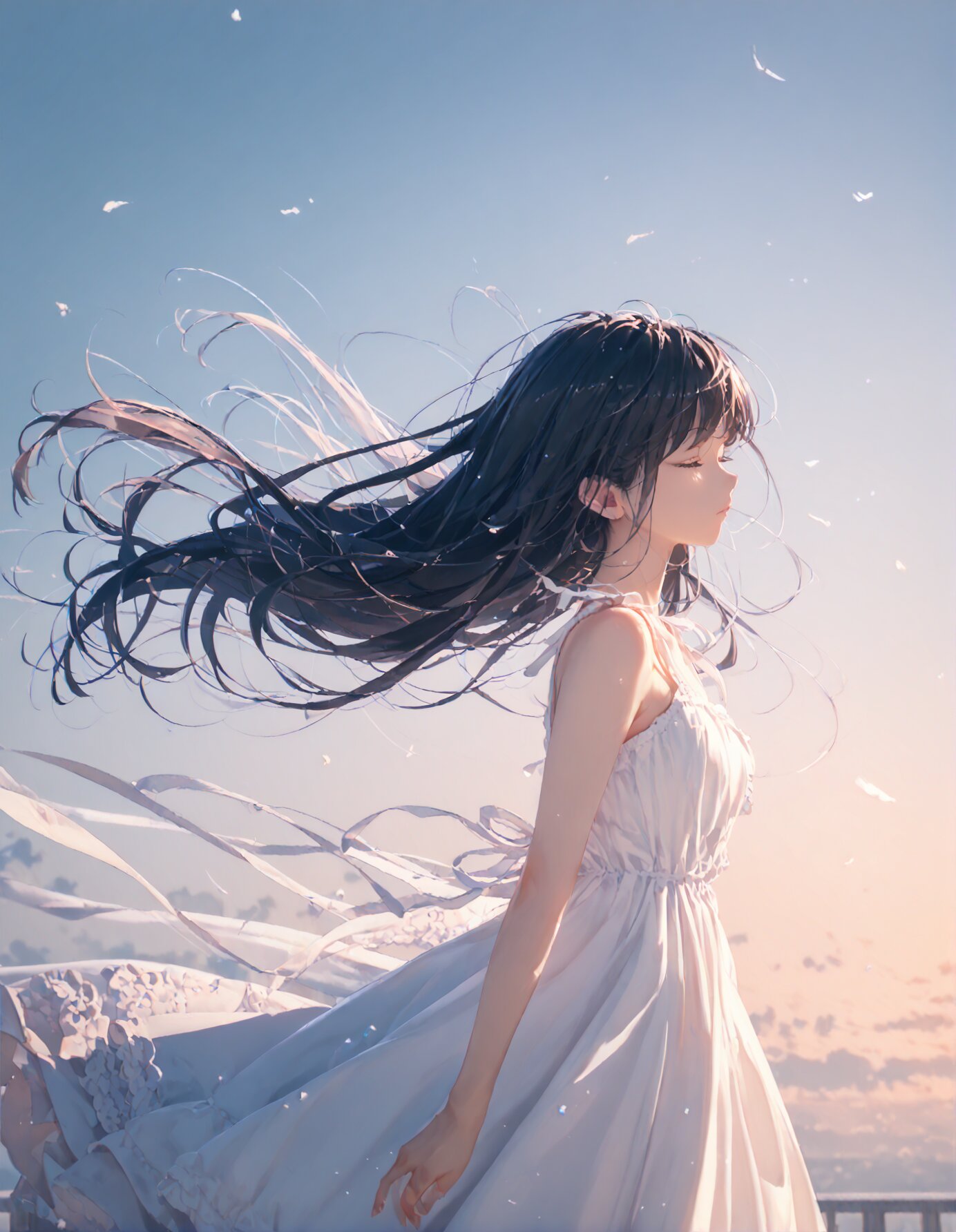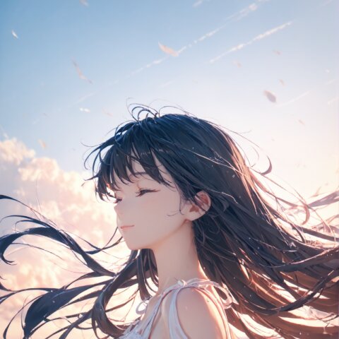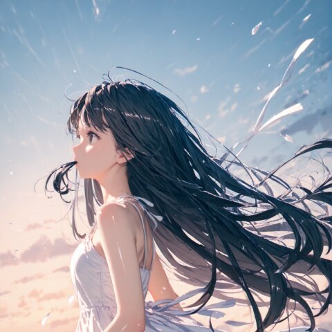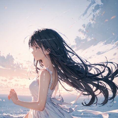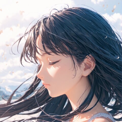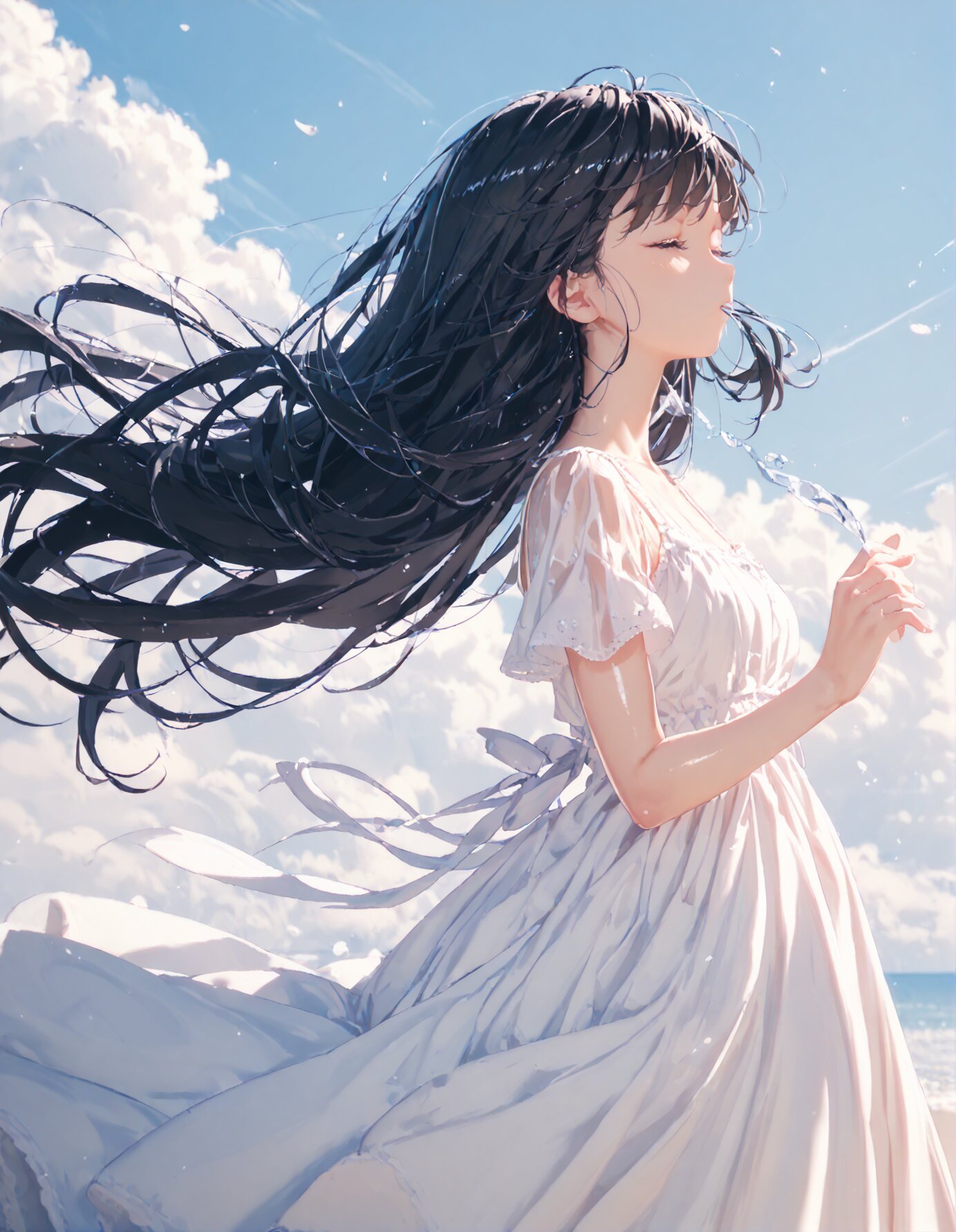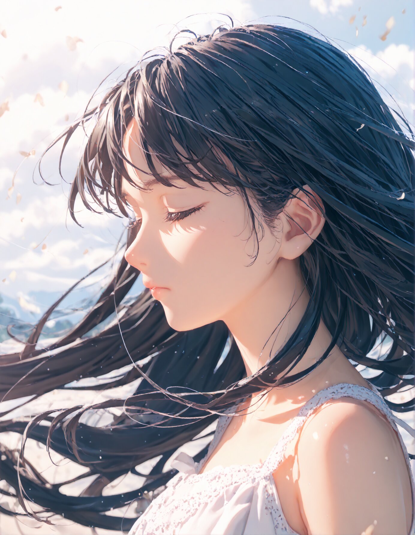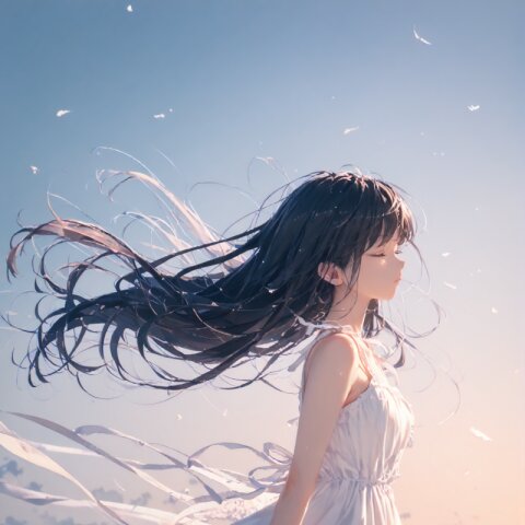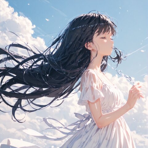 (score_9, score_8_up, score_7_up), best quality, ultra hi res, (Summer Memories:1.3), 1 beautiful girl, Portrait, a little side view, detailed face, look away, closed eyes, light smile, (shiny beautiful black hair), straight long hair, (Beautiful hair blowing in the wind), white one-peace dress, Very beautiful summer plateau scenery, A strong wind is blowing, rating_safe,