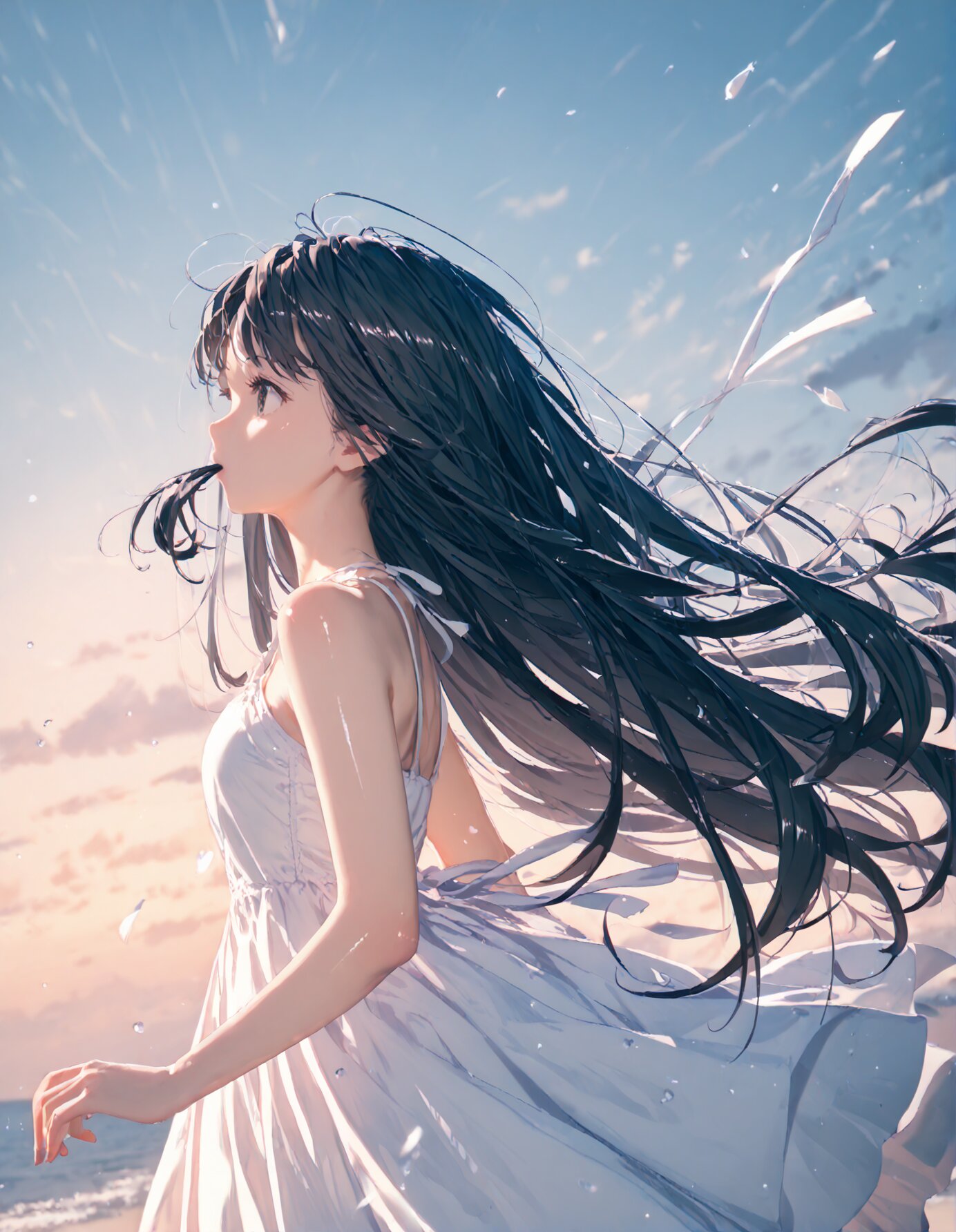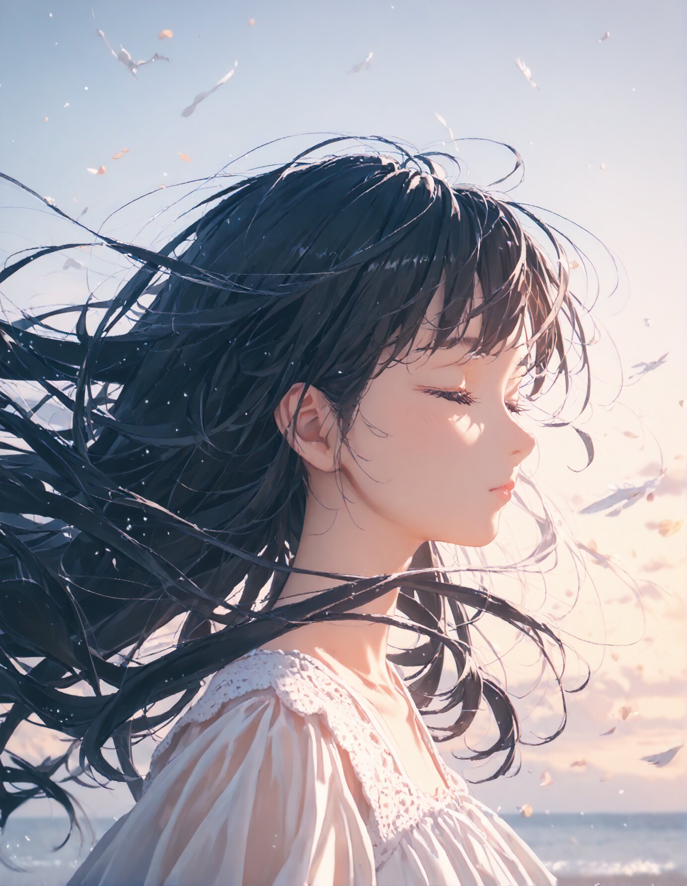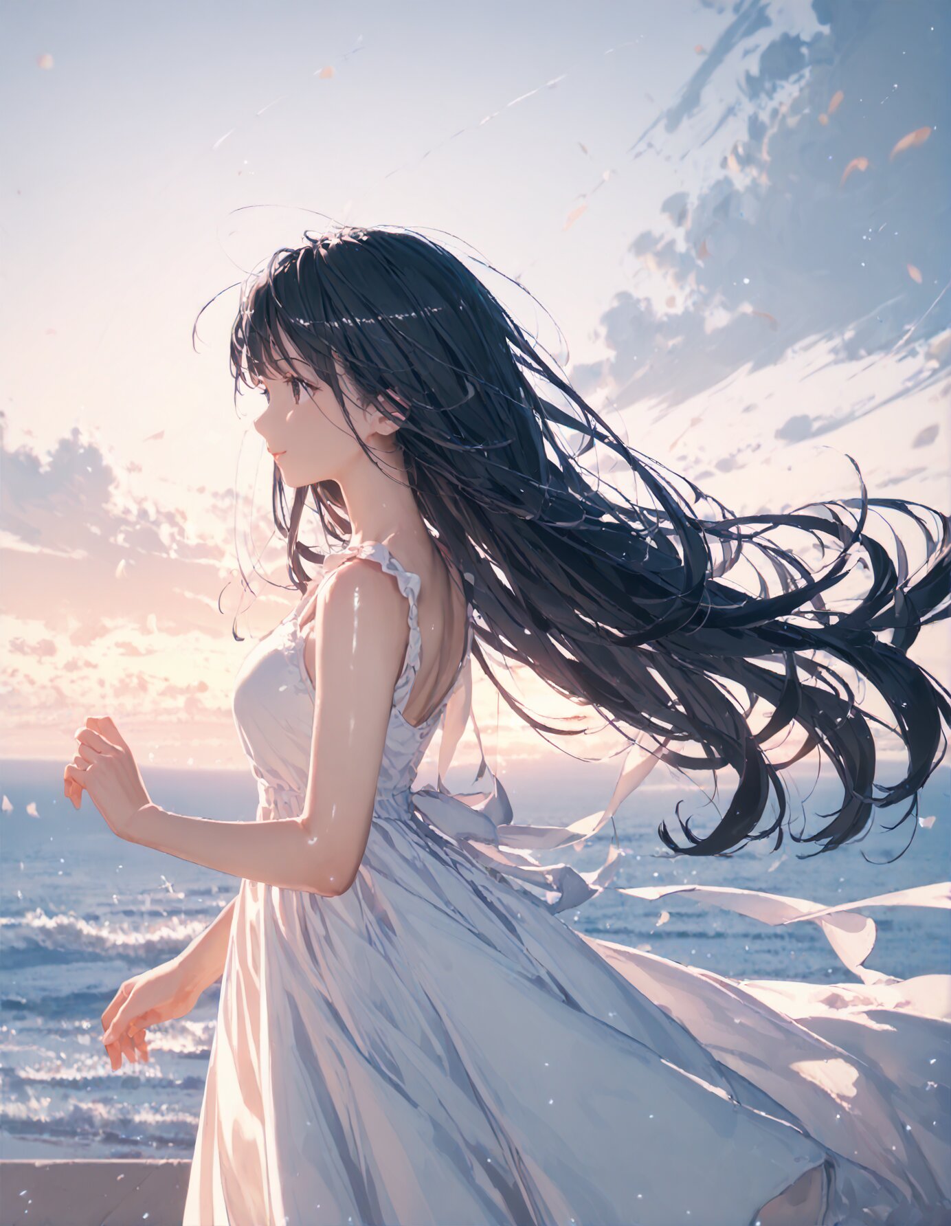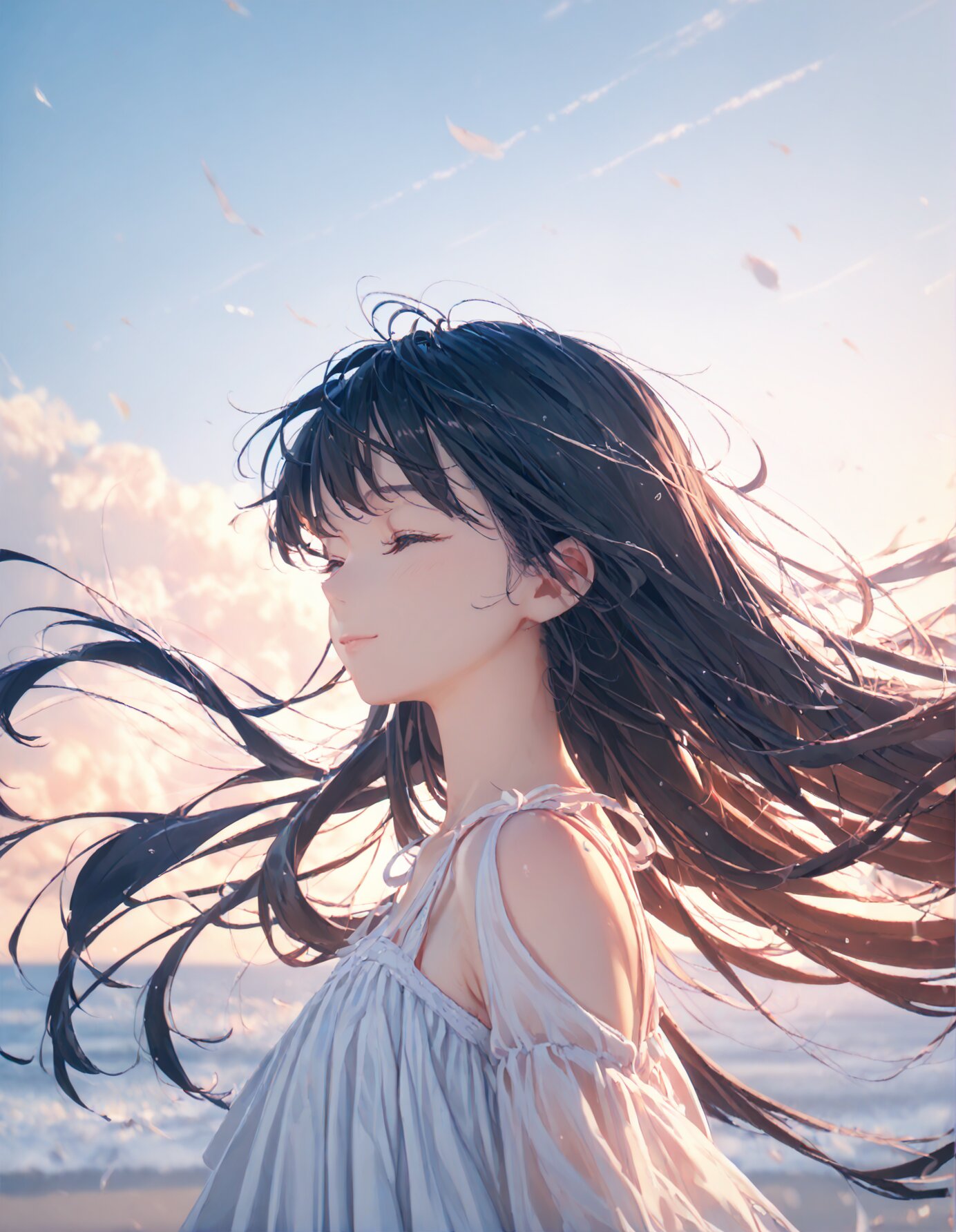 (score_9, score_8_up, score_7_up), best quality, ultra hi res, (Summer Memories:1.3), 1 beautiful girl, Portrait, a little side view, detailed face, look away, closed eyes, light smile, (shiny beautiful black hair), straight long hair, (Beautiful hair blowing in the wind), white one-peace dress, Very beautiful summer plateau scenery, A strong wind is blowing, rating_safe,