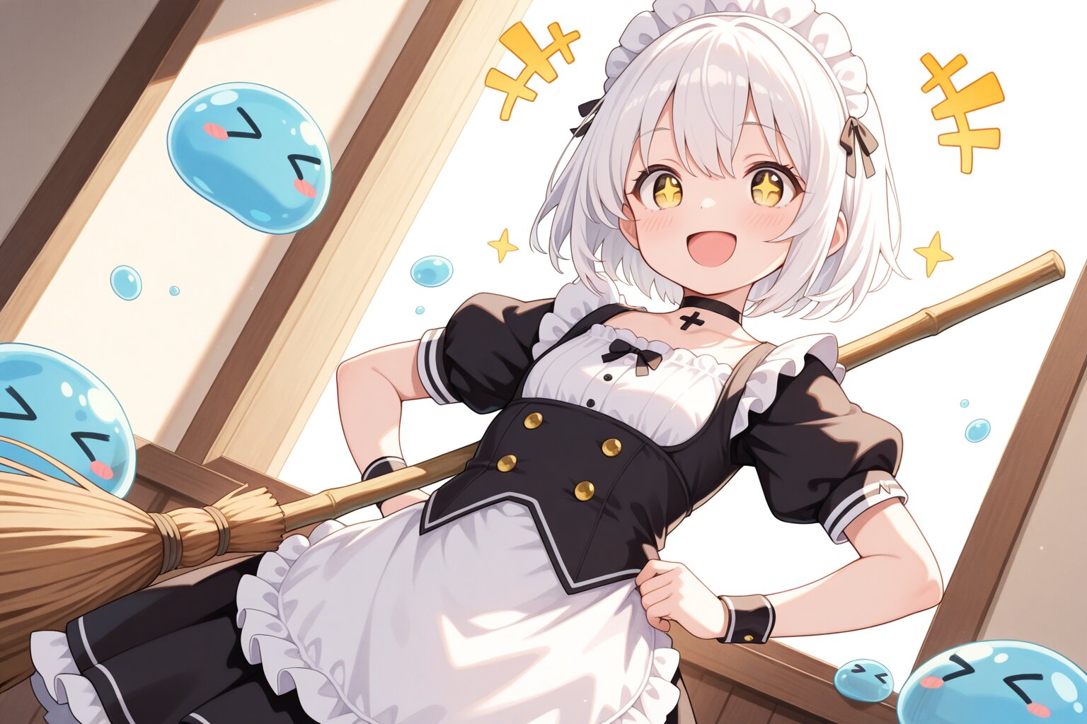 1 little girl, solo, diagonal angle, masterpiece, best quality, amazing quality, very aesthetic, white hair, short hair, yellow eyes, +_+, open mouth, smile, cheerful, +++, notice line, choker, maid outfit, slime, >_<, having a broom and blade,