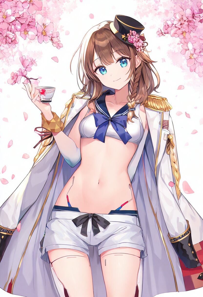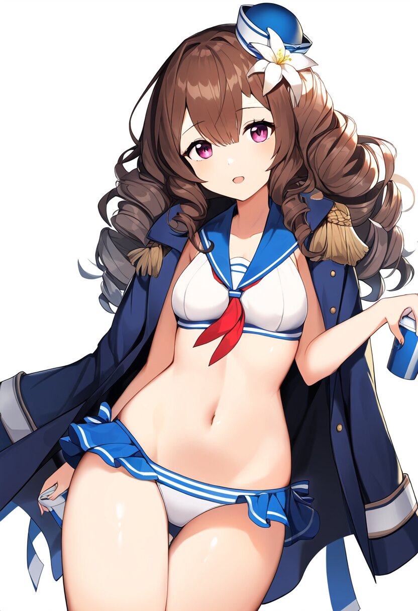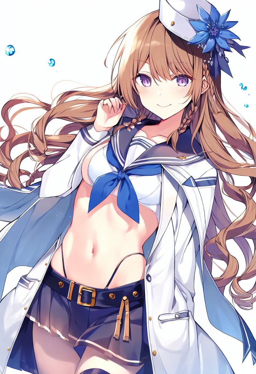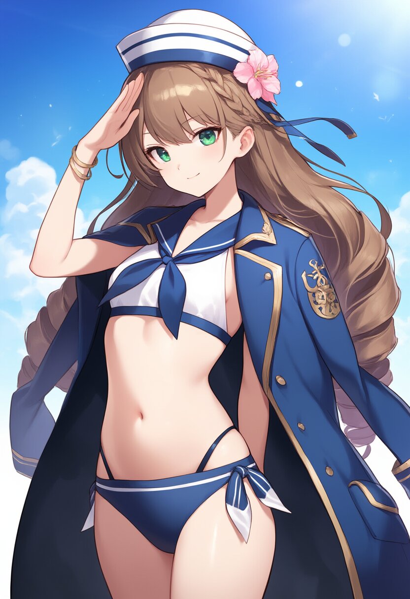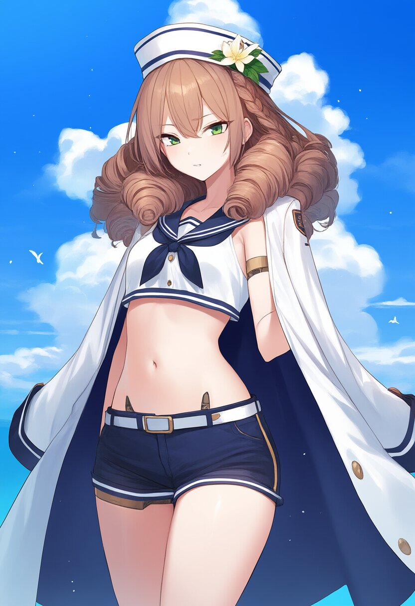 1girl, cowboy shot, android, big hair, side braid, brown hair, ringlets, small breasts, stomach, dixie cup hat, hat flower, sailor, coat on shoulders, , rating:general, best quality, very aesthetic, absurdres