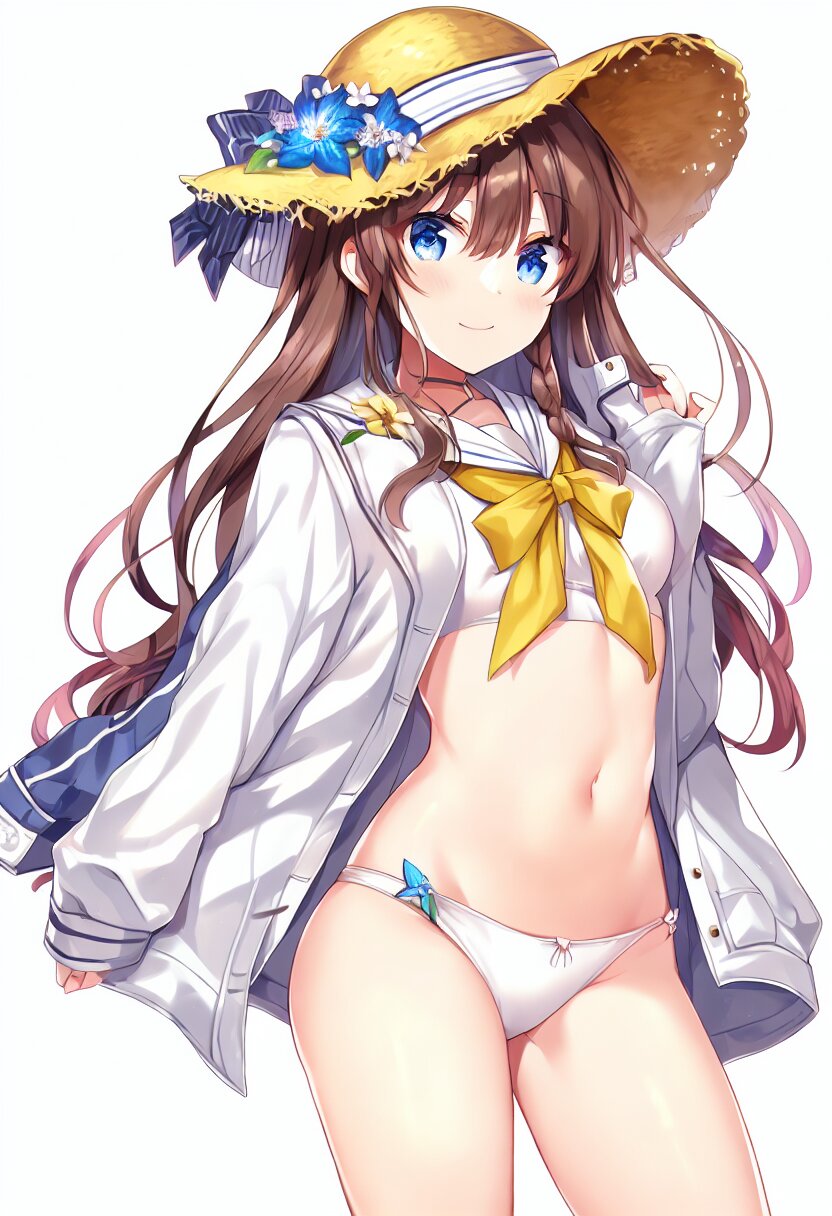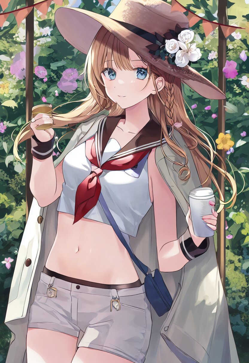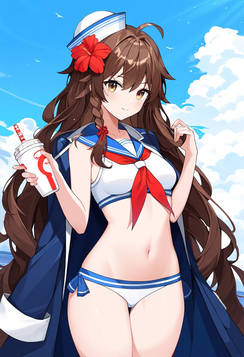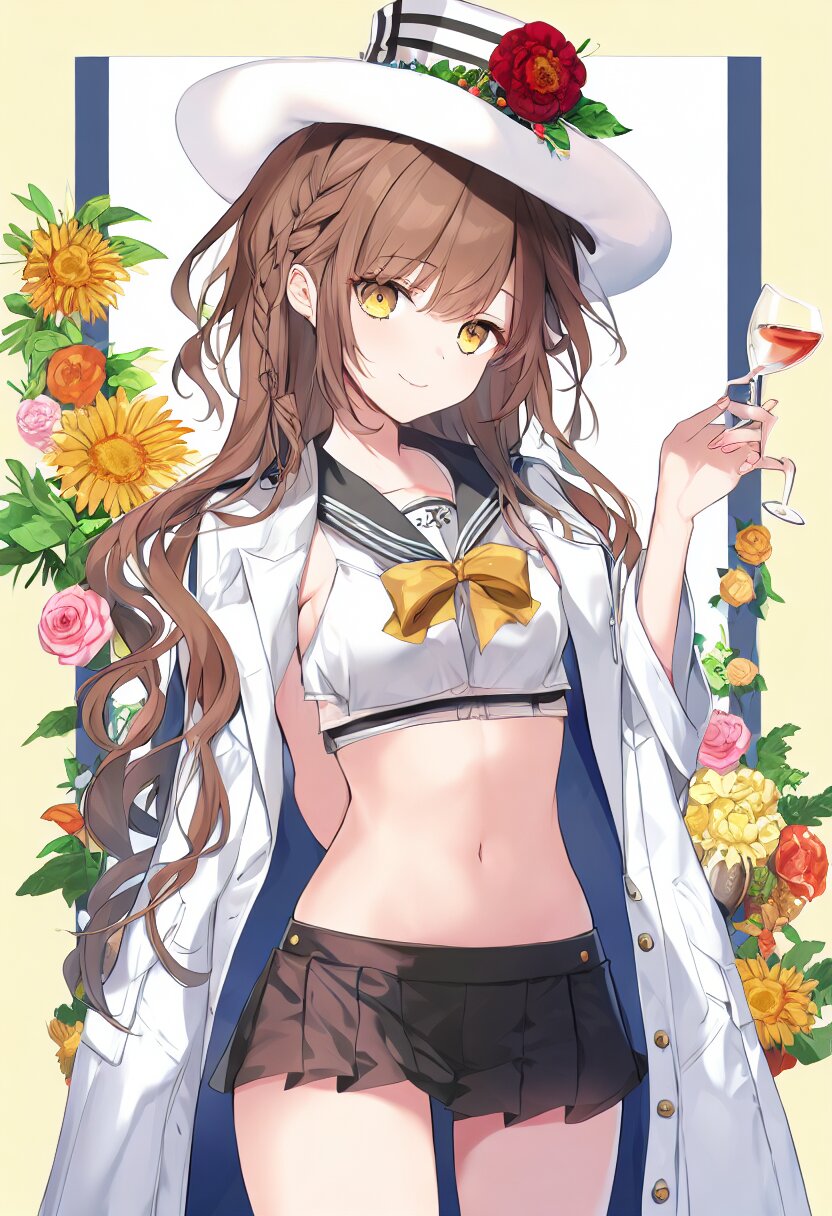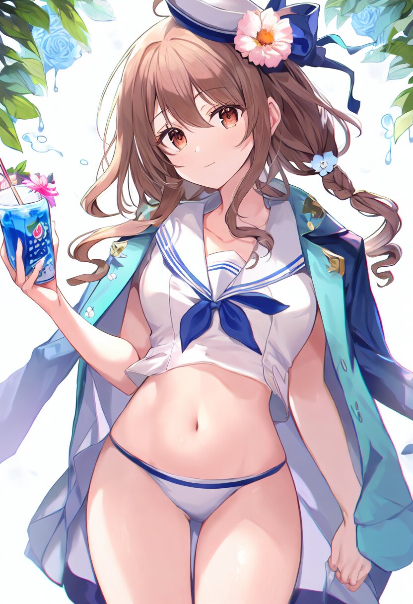 1girl, cowboy shot, android, big hair, side braid, brown hair, ringlets, small breasts, stomach, dixie cup hat, hat flower, sailor, coat on shoulders, , rating:general, best quality, very aesthetic, absurdres