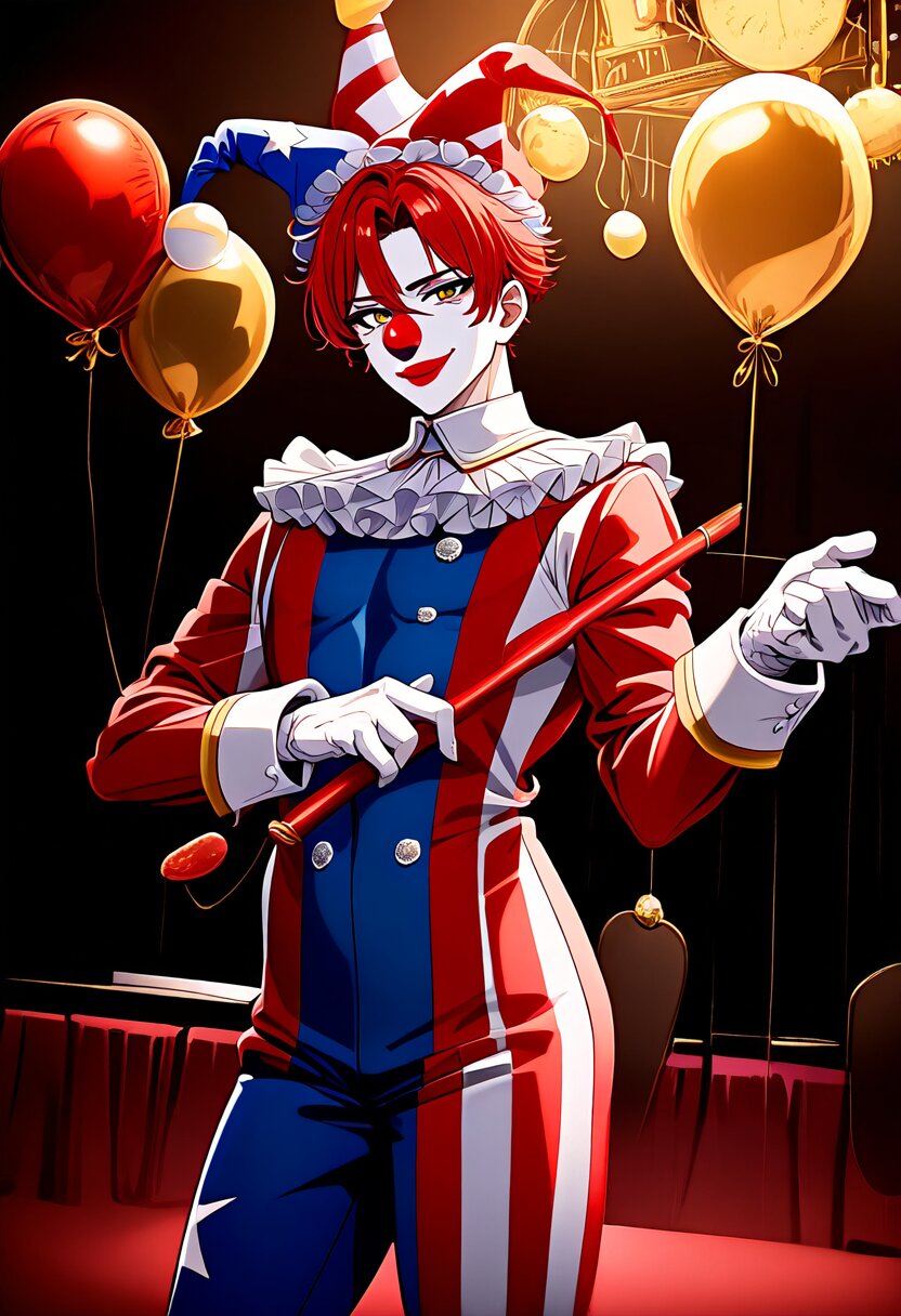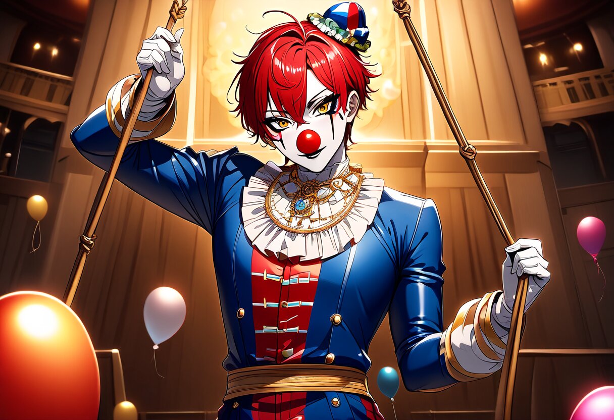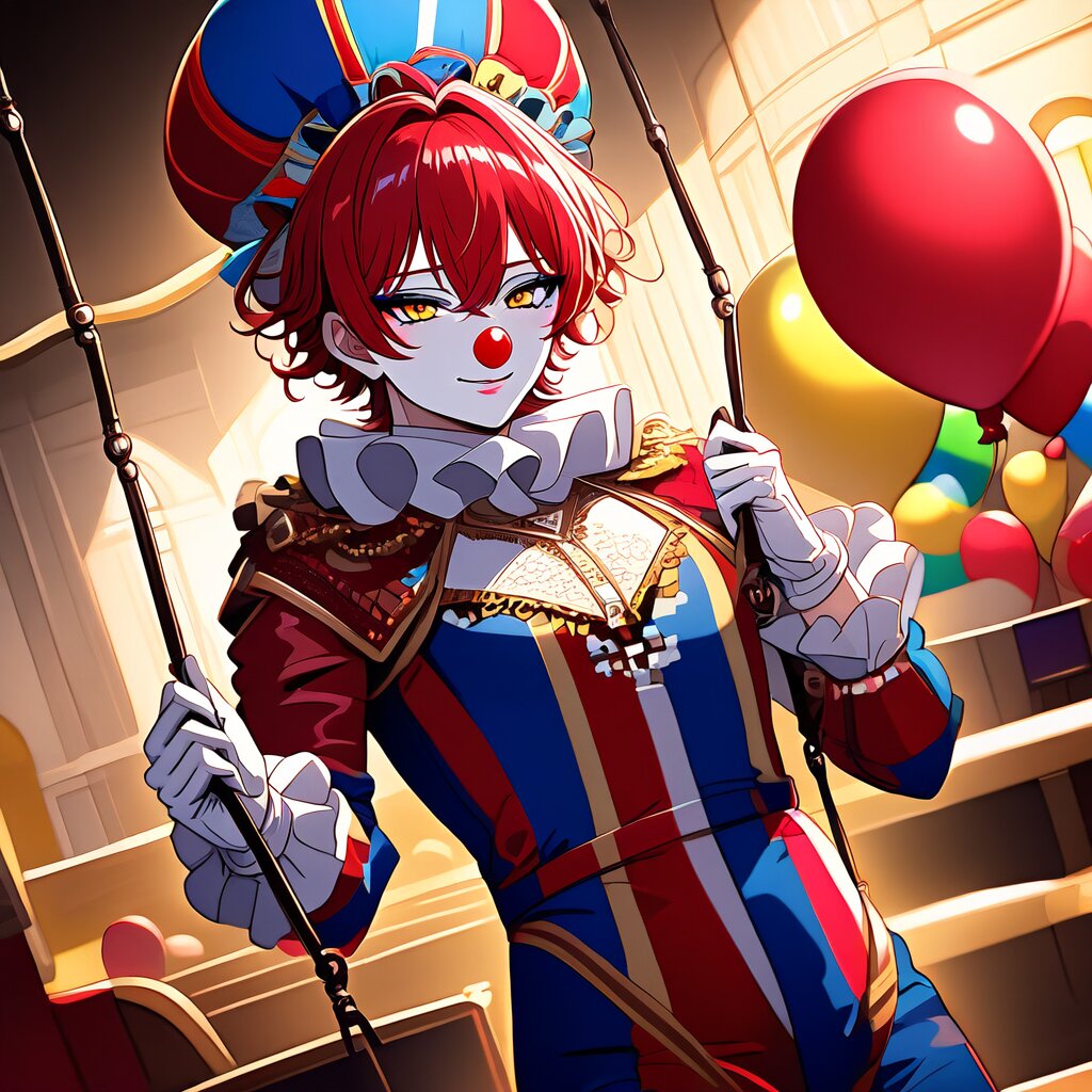{{{highly detailed}}}, {{official style}}, {{game cg}}, {{intricate}}, {{goddess of victory: nikke}}, style of ai-generated, {{adult man}}, {{25 year old male}}, 1boy, solo, yellow eyes, {{{tsurime}}}, red hair, {{{very short hair}}}, messy hair, hair between eyes, flat chest, white skin, light smile, {{{clown, frill, long sleeves, clown costumes, clown hat, red and blue striped jumpsuit, red ruff, red nose, white and black makeup, white gloves}}}, balloon, swing, circus, indoor, cowboy shot, no human, {{{masterpiece}}}, {{{best quality}}}, {{{very aesthetic}}}, {{{ultra-detailed}}}, {illustration}, {{{extremely detailed}}}, {{{an extremely delicate and beautiful}}}