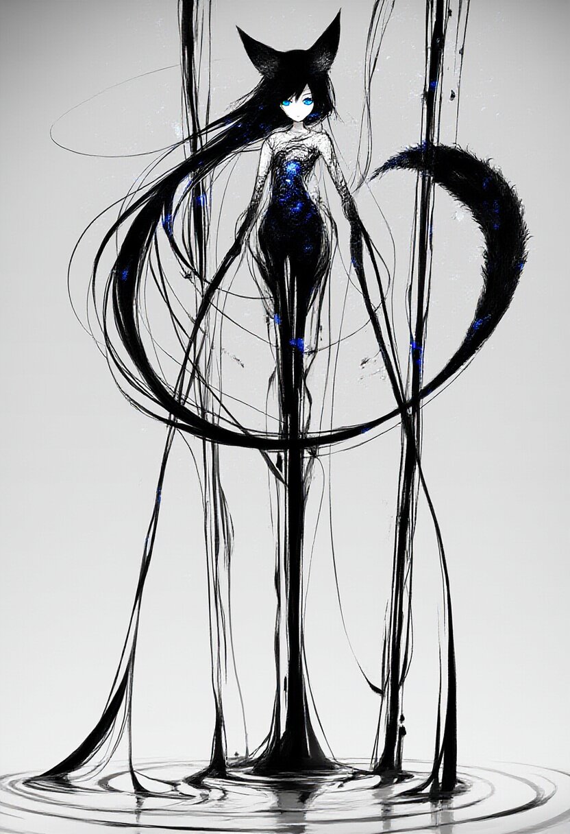 {{{amazing quality}}}, {{{ultra detailed}}}, {{{high resolution}}}, {{{detaild intricate}}}, {{{absurdres}}}, {{{high quality}}}, {{{best quality}}}, {{{8K}}}, {{{very aesthetic shiny skin}}}, {{{very aesthetic smooth skin}}}, {{{very aesthetic silky skin}}}, {{{very aesthetic shiny blue eyes}}}, {{{very aesthetic face}}}, {{{very aesthetic woman}}}, {{{very aesthetic black hair}}}, {{{very aesthetic slender body}}}, 1girl, beautiful detailed illustration, clear, beautiful detailed glow, beautiful detailed illustration, lineart, spot color, fox girl, black fox ears, black fox tail, long straight hair, sumi-e, smooth hair, silky hair, very long arms, very long legs, what,