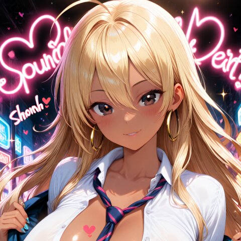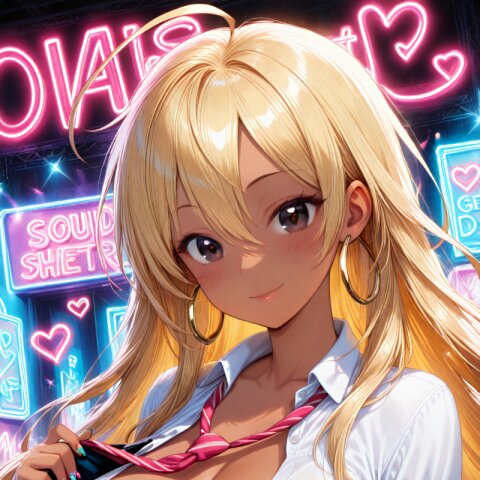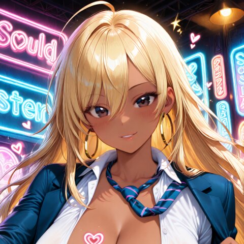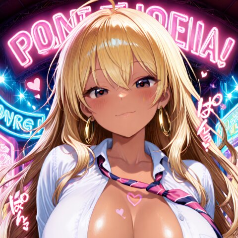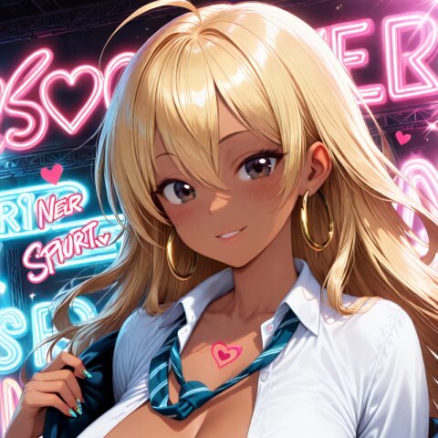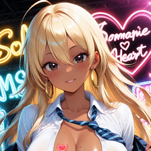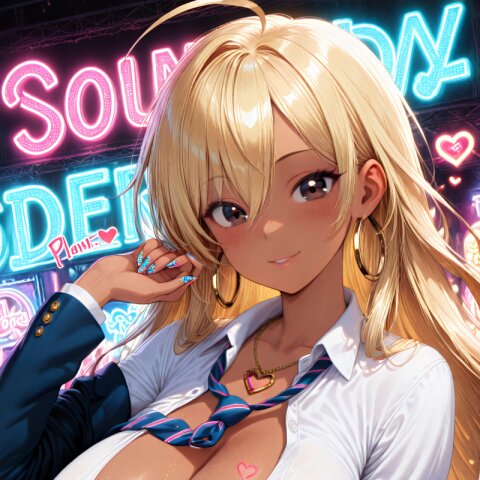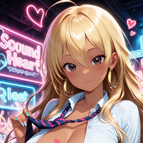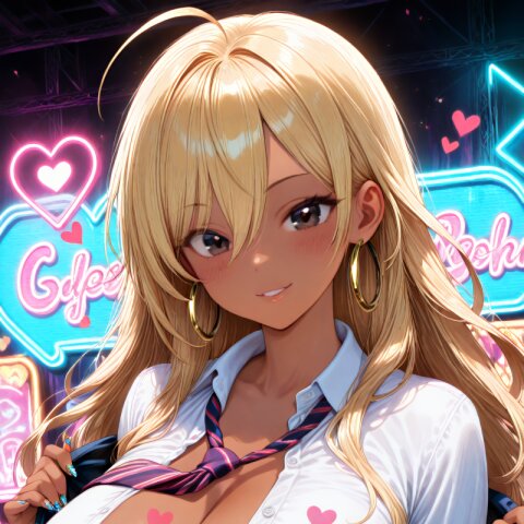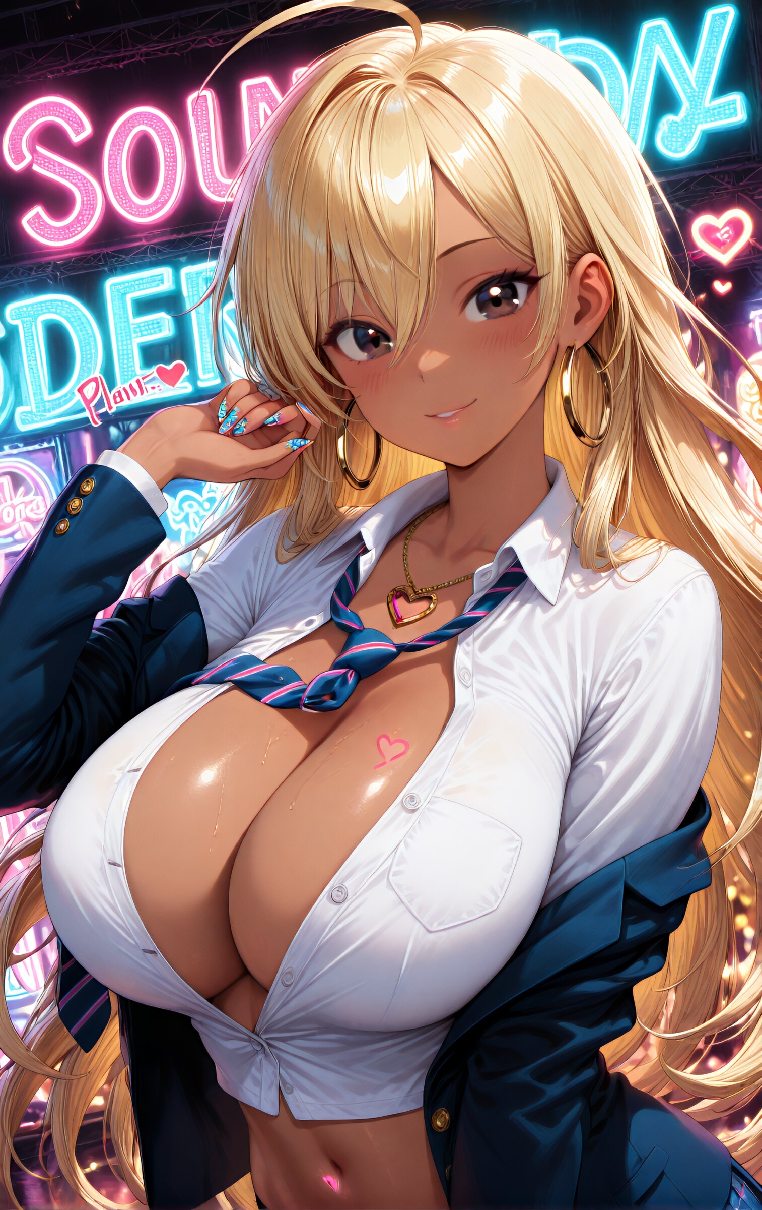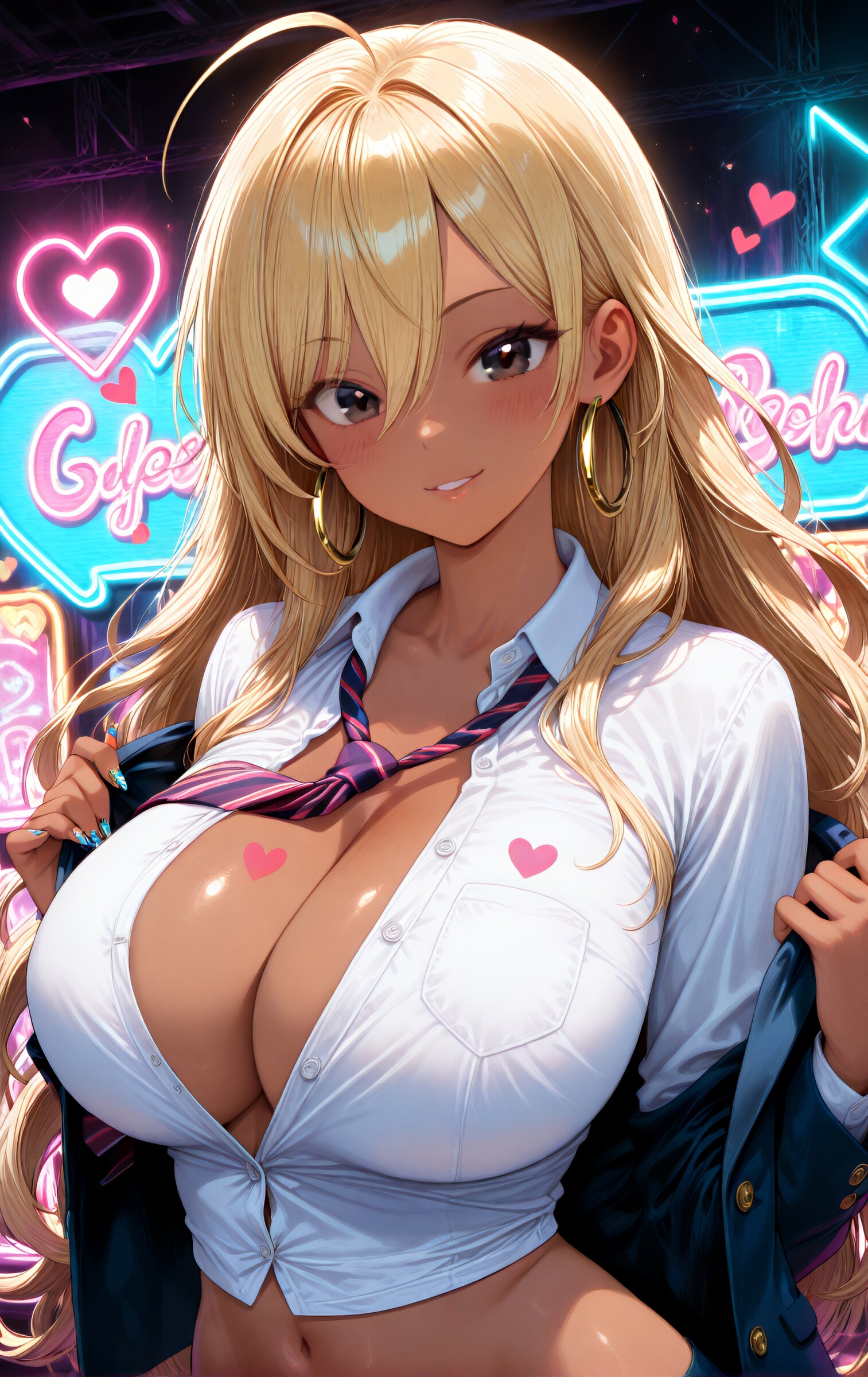 (upper body:1.5), solo, long flowing hair, blond hair, dark copper eyes, ahoge:1.3, large breast and hips, gyaru style, stylish open-top school uniform, (loosely worn blazer:1.2), (partially unbuttoned shirt:1.3), (crop top showing midriff:1.2), visible navel, striped necktie hanging loosely, playful yet confident pose, large hoop earrings, bright nail art, expressive face, soft smile, neon light background, glowing colorful signs, sparkling effects, dynamic lighting, high contrast, vibrant atmosphere, (party vibe:1.1), fashionable street-style backdrop, from side, looking at viewer, (overflowing with heart symbols 💕 💕 💕:1.5), (onomatopoeia:1.5),(sound effects:1.5), dynamic pose, dynamic angle, masterpiece, best quality, very aesthetic, <lora:noobai_ep11_stabilizer_v0.11_fp16:0.7> <lora:StS-Illustrious-Detail-Slider-v1.0:2.> <lora:sdxl-hairdetailer_02:2> <lora:xl_more_art-full_v1:1.5>