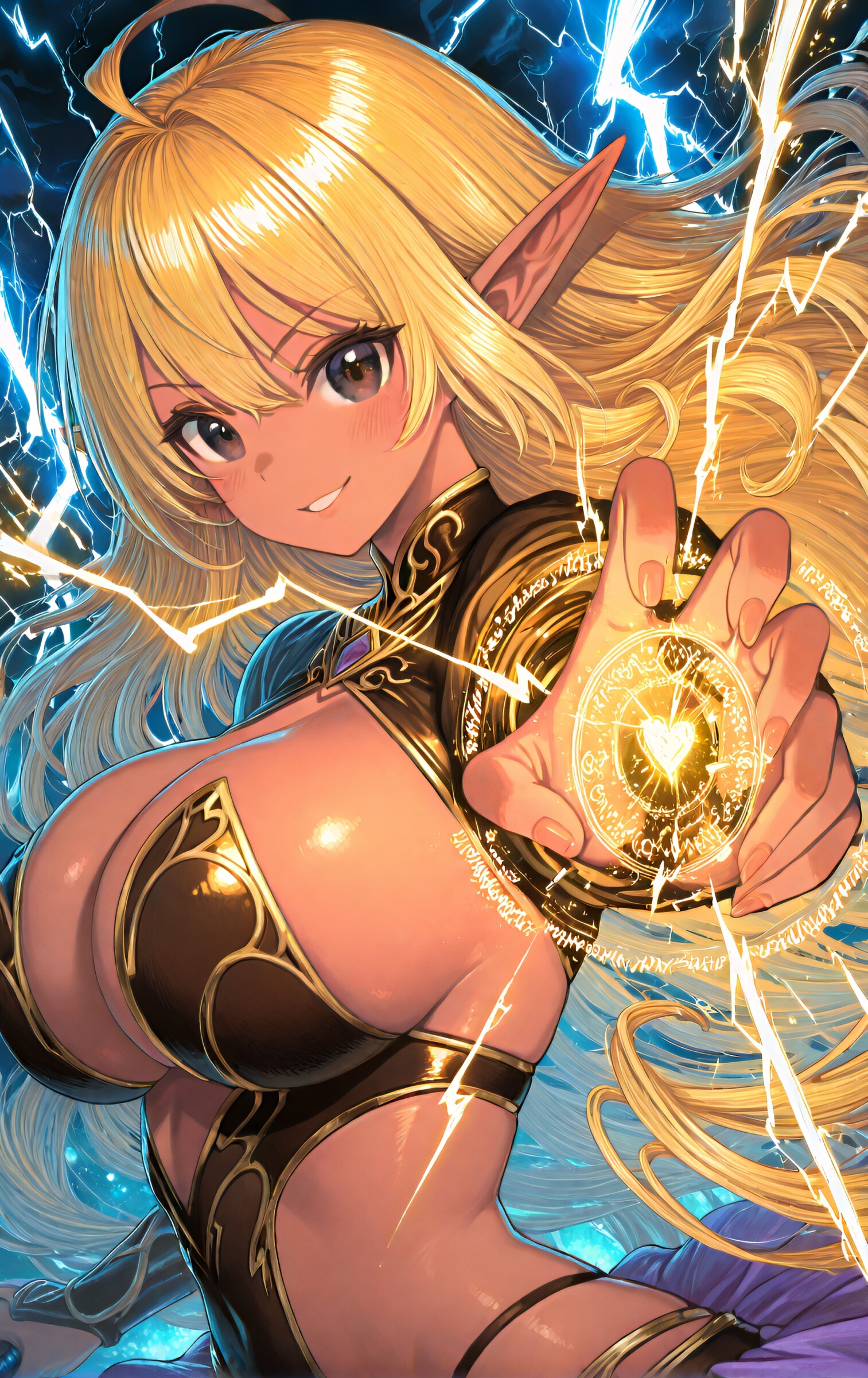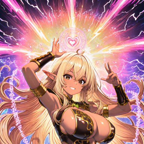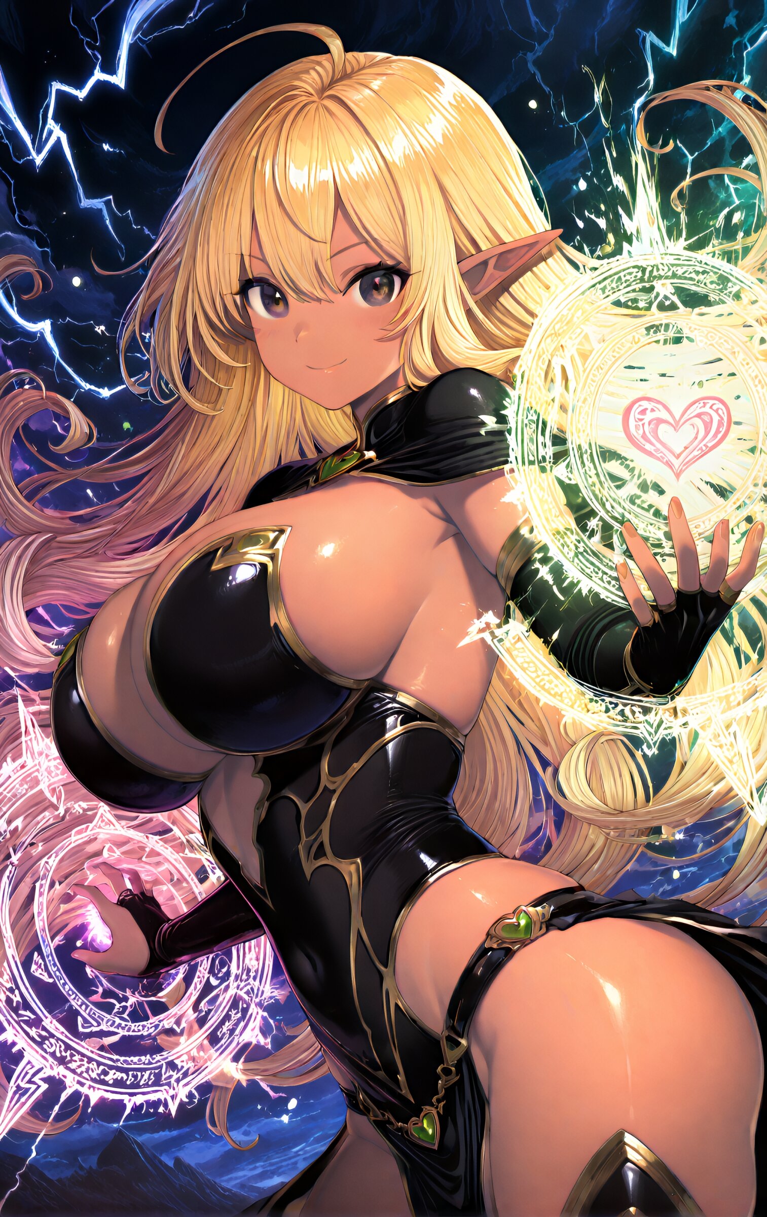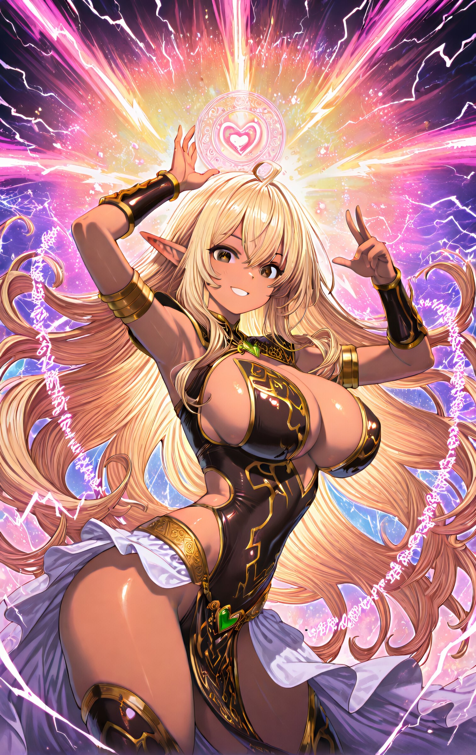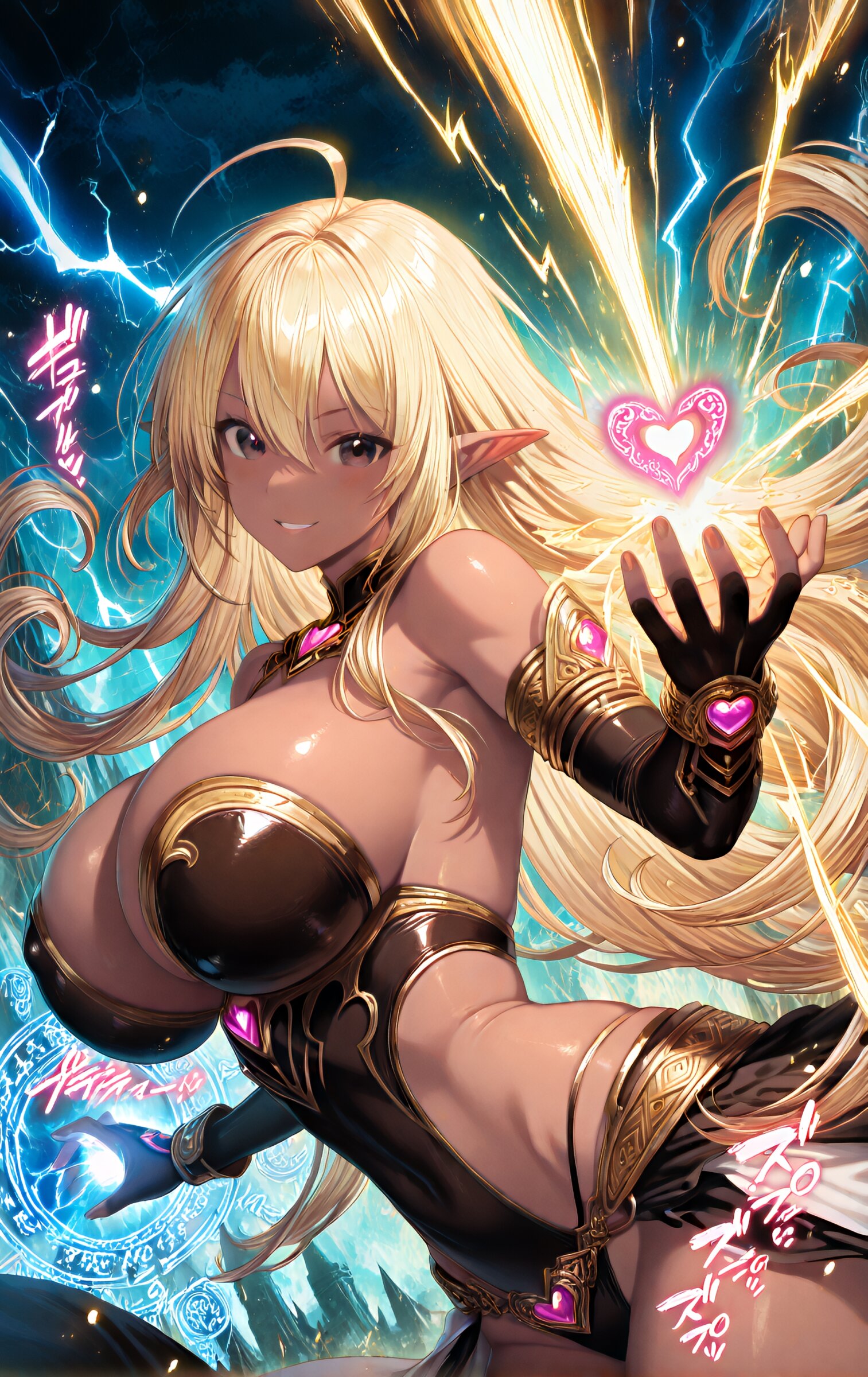 upper body:1.8), long flowing hair, blond hair, dark copper eyes, ahoge:1.3, large breast and hips:1.3, smile, dark elf, magical girl, extravagant magic attack, colorful magical aura, swirling runes, glowing particles, (dynamic pose:1.5), casting powerful magic, vibrant spell effects, neon-like magical lights, detailed energy swirls, lightning sparks, explosive light burst, grand fantasy style, (intense lighting:1.3), spellcasting focus, powerful and confident aura, dramatic fantasy background, from side, looking at viewer, (overflowing with heart symbols 💕 💕 💕:1.5), (onomatopoeia:1.5),(sound effects:1.5), dynamic pose, dynamic angle, masterpiece, best quality, very aesthetic, <lora:noobai_ep11_stabilizer_v0.11_fp16:0.7> <lora:StS-Illustrious-Detail-Slider-v1.0:2.> <lora:sdxl-hairdetailer_02:2> <lora:xl_more_art-full_v1:1.5>