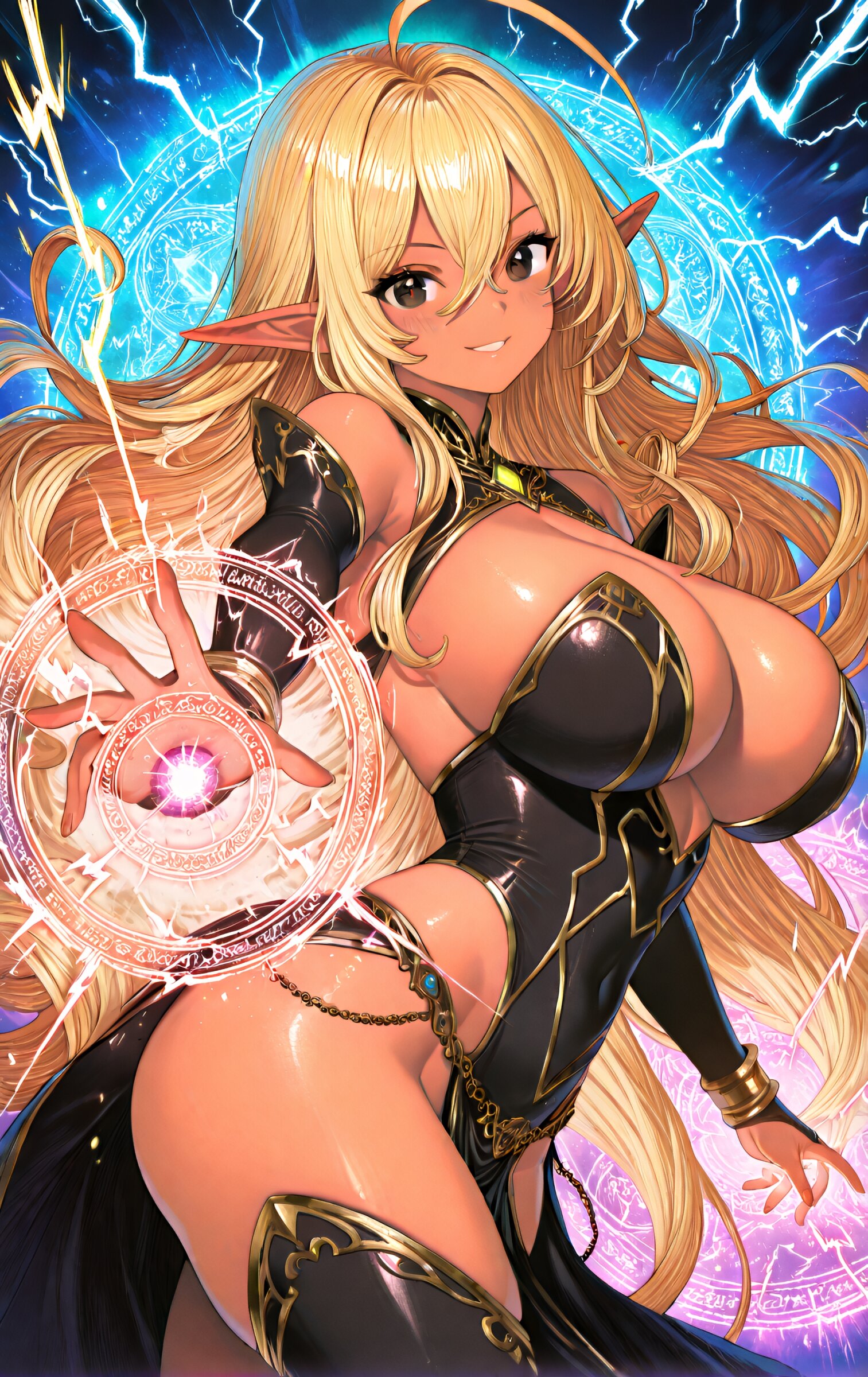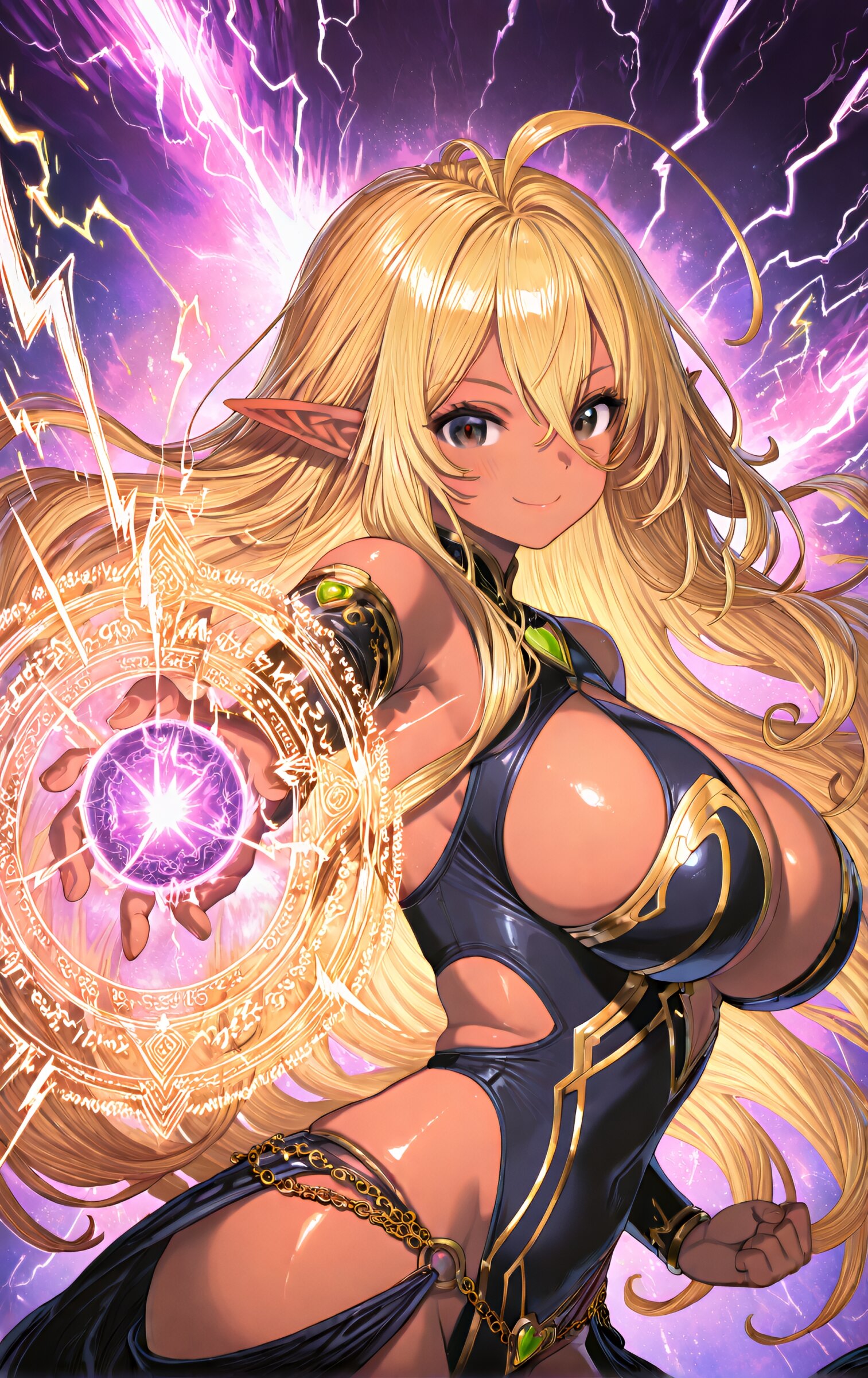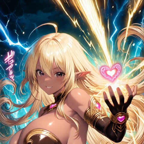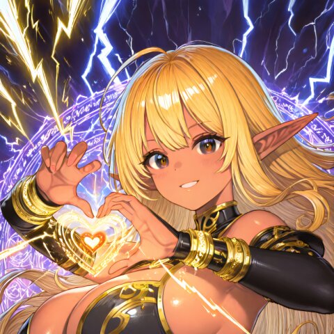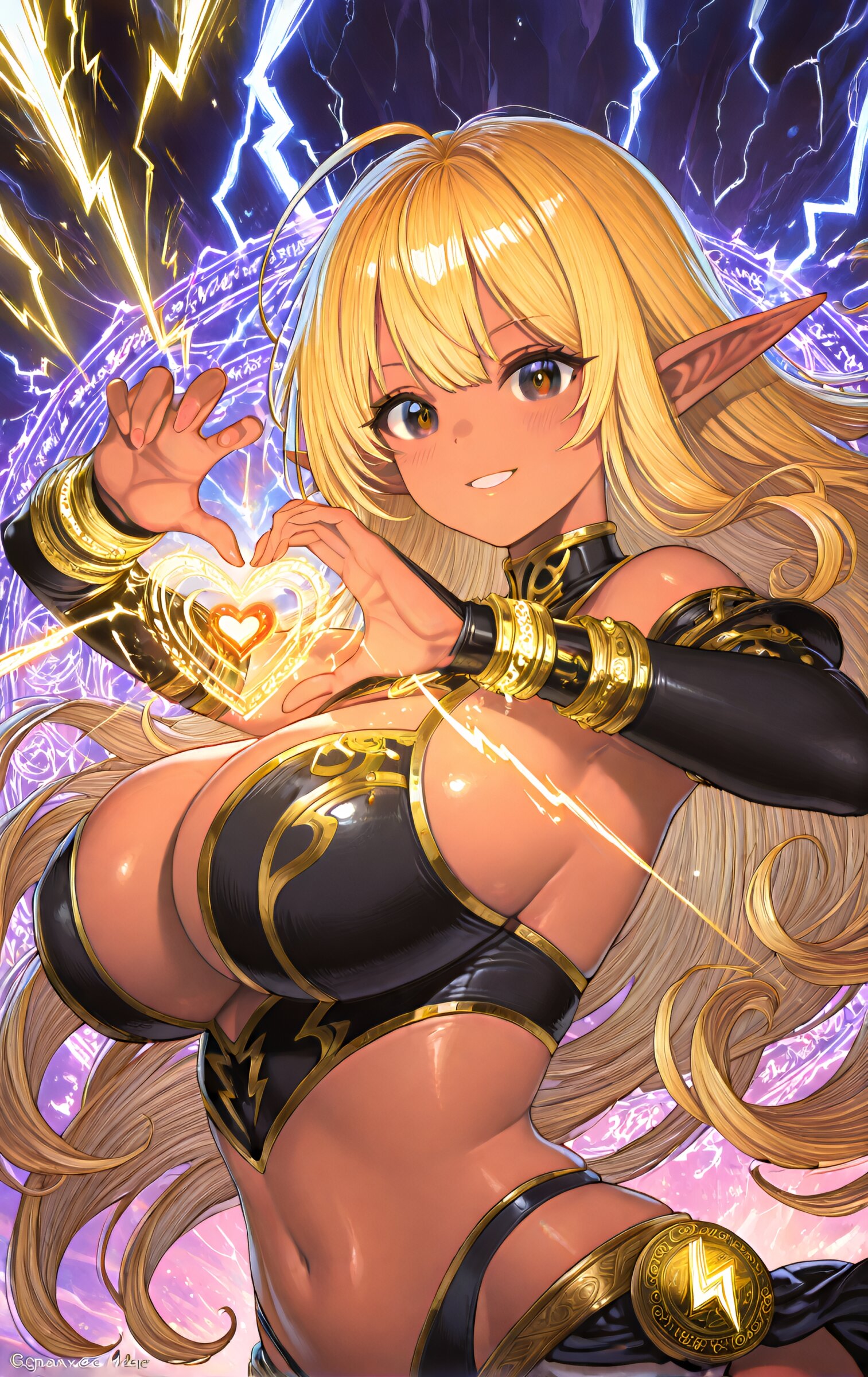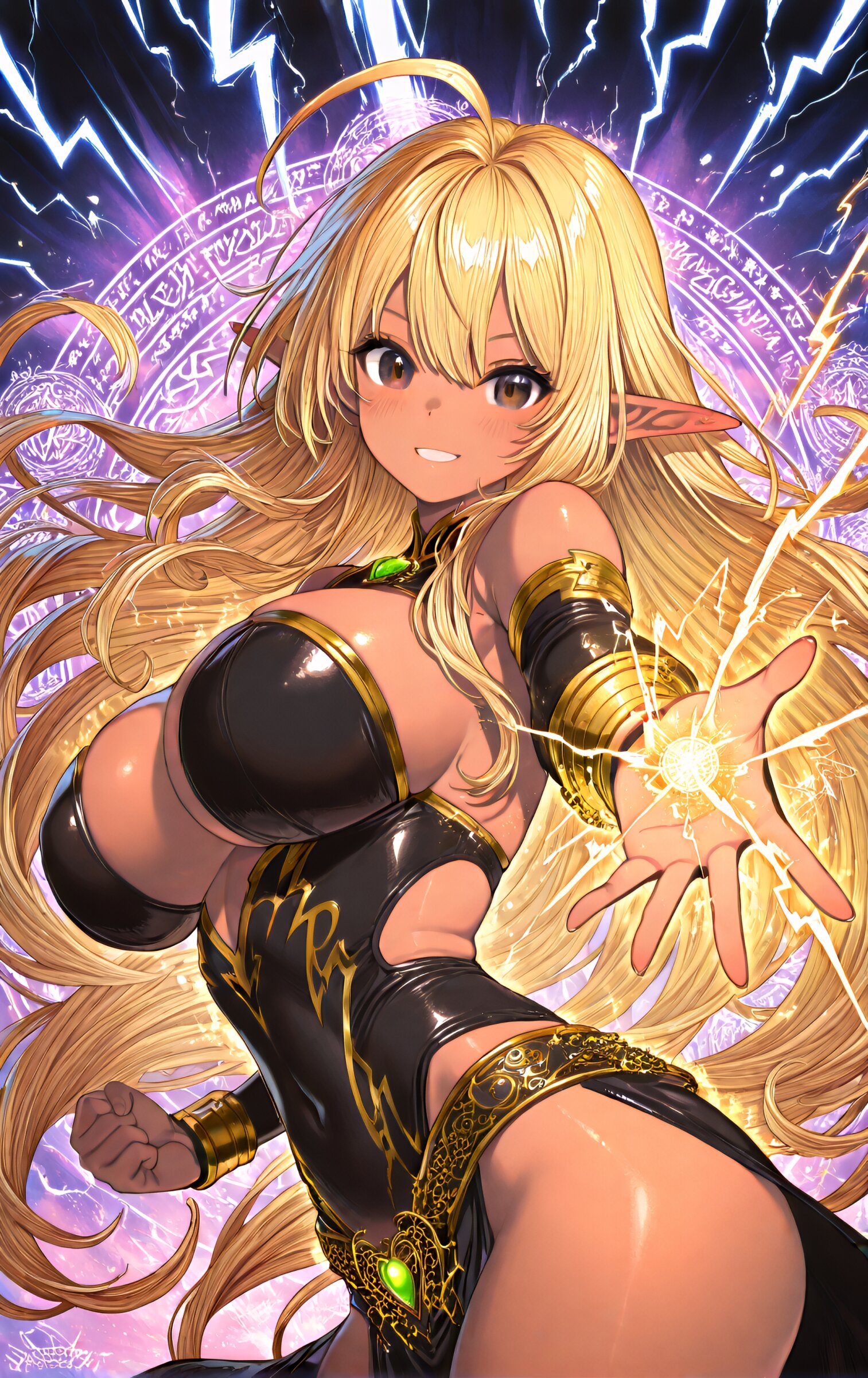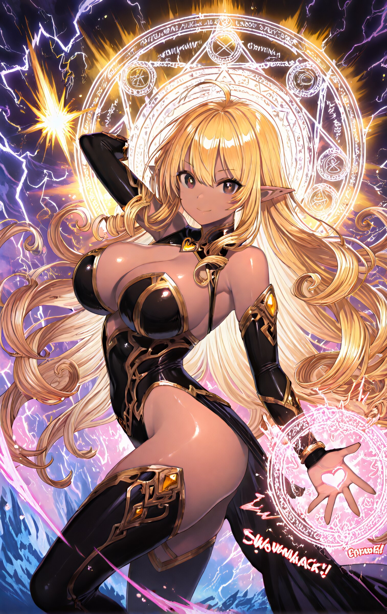 upper body:1.8), long flowing hair, blond hair, dark copper eyes, ahoge:1.3, large breast and hips:1.3, smile, dark elf, magical girl, extravagant magic attack, colorful magical aura, swirling runes, glowing particles, (dynamic pose:1.5), casting powerful magic, vibrant spell effects, neon-like magical lights, detailed energy swirls, lightning sparks, explosive light burst, grand fantasy style, (intense lighting:1.3), spellcasting focus, powerful and confident aura, dramatic fantasy background, from side, looking at viewer, (overflowing with heart symbols 💕 💕 💕:1.5), (onomatopoeia:1.5),(sound effects:1.5), dynamic pose, dynamic angle, masterpiece, best quality, very aesthetic, <lora:noobai_ep11_stabilizer_v0.11_fp16:0.7> <lora:StS-Illustrious-Detail-Slider-v1.0:2.> <lora:sdxl-hairdetailer_02:2> <lora:xl_more_art-full_v1:1.5>