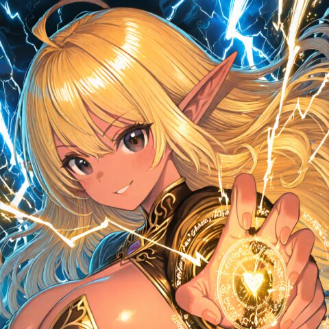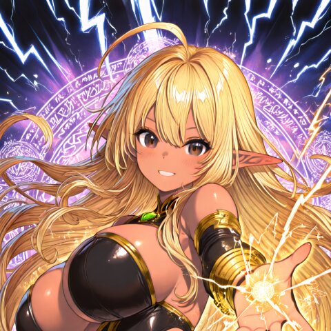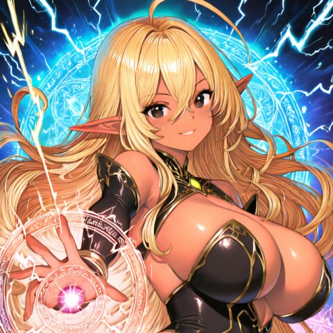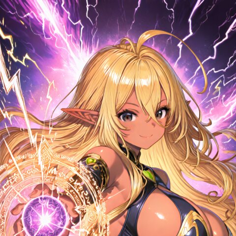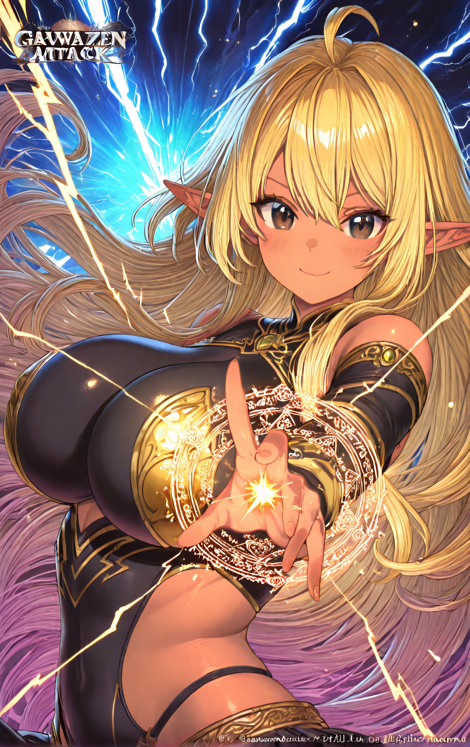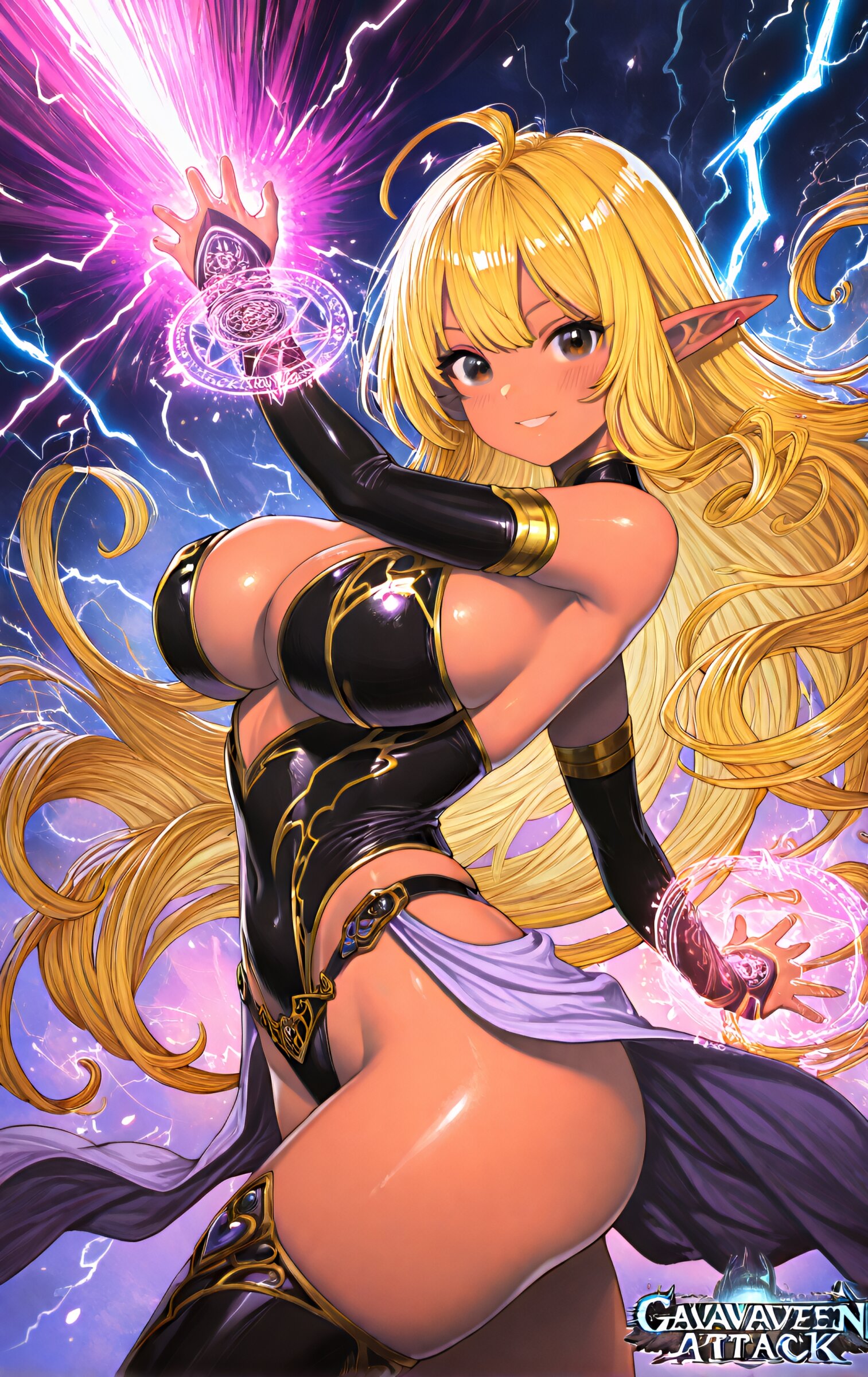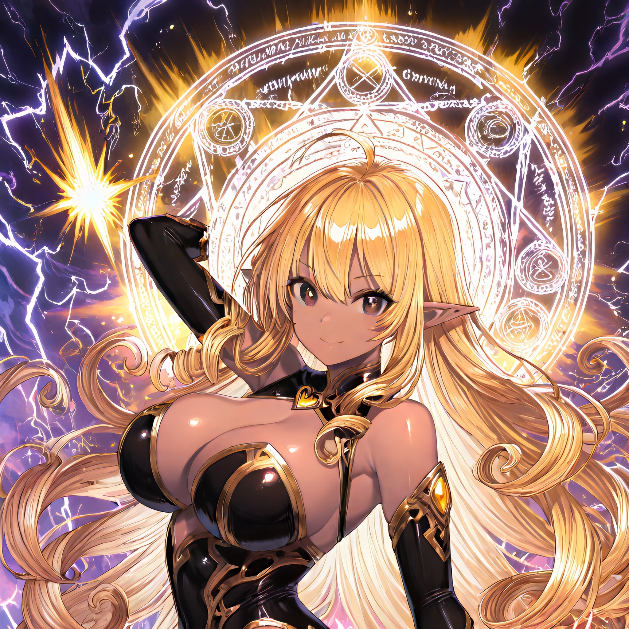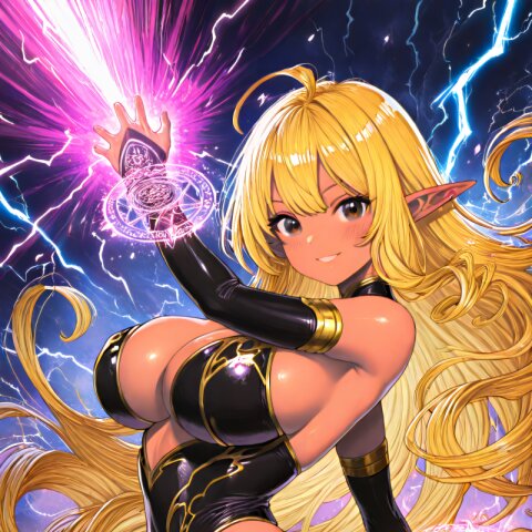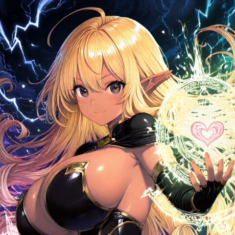 upper body:1.8), long flowing hair, blond hair, dark copper eyes, ahoge:1.3, large breast and hips:1.3, smile, dark elf, magical girl, extravagant magic attack, colorful magical aura, swirling runes, glowing particles, (dynamic pose:1.5), casting powerful magic, vibrant spell effects, neon-like magical lights, detailed energy swirls, lightning sparks, explosive light burst, grand fantasy style, (intense lighting:1.3), spellcasting focus, powerful and confident aura, dramatic fantasy background, from side, looking at viewer, (overflowing with heart symbols 💕 💕 💕:1.5), (onomatopoeia:1.5),(sound effects:1.5), dynamic pose, dynamic angle, masterpiece, best quality, very aesthetic, <lora:noobai_ep11_stabilizer_v0.11_fp16:0.7> <lora:StS-Illustrious-Detail-Slider-v1.0:2.> <lora:sdxl-hairdetailer_02:2> <lora:xl_more_art-full_v1:1.5>