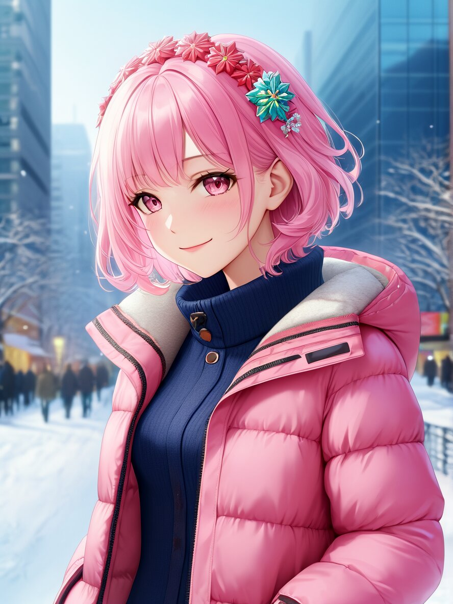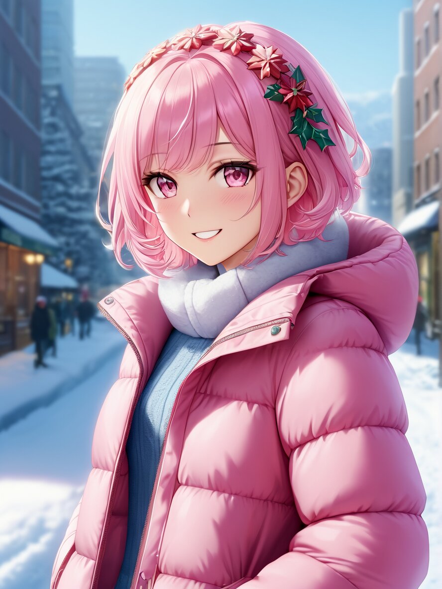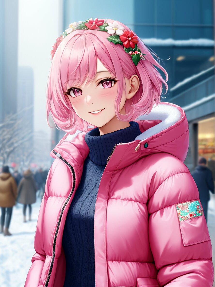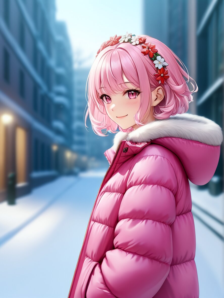 absurdres, incredibly absurdres, huge filesize, highres, best quality, high quality, professional quality, intricate, highly detailed, extremely detailed CG, illustration, outdoor, winter, city, BREAK 1girl, light pink hair, light pink eyes, loose wavy hairstyle, short bob cut, floral hair accessory, happy smile, winter fashion, down jacket,