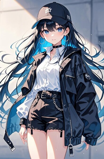 1girl, black hair, long hair, blue inner hair, one eye is hidden by bangs, expressionless, wearing a white collared shirt and black poncho, she is wearing black shorts, hoop earrings, looking at viewer, wearing snapback cap, anime illustration,