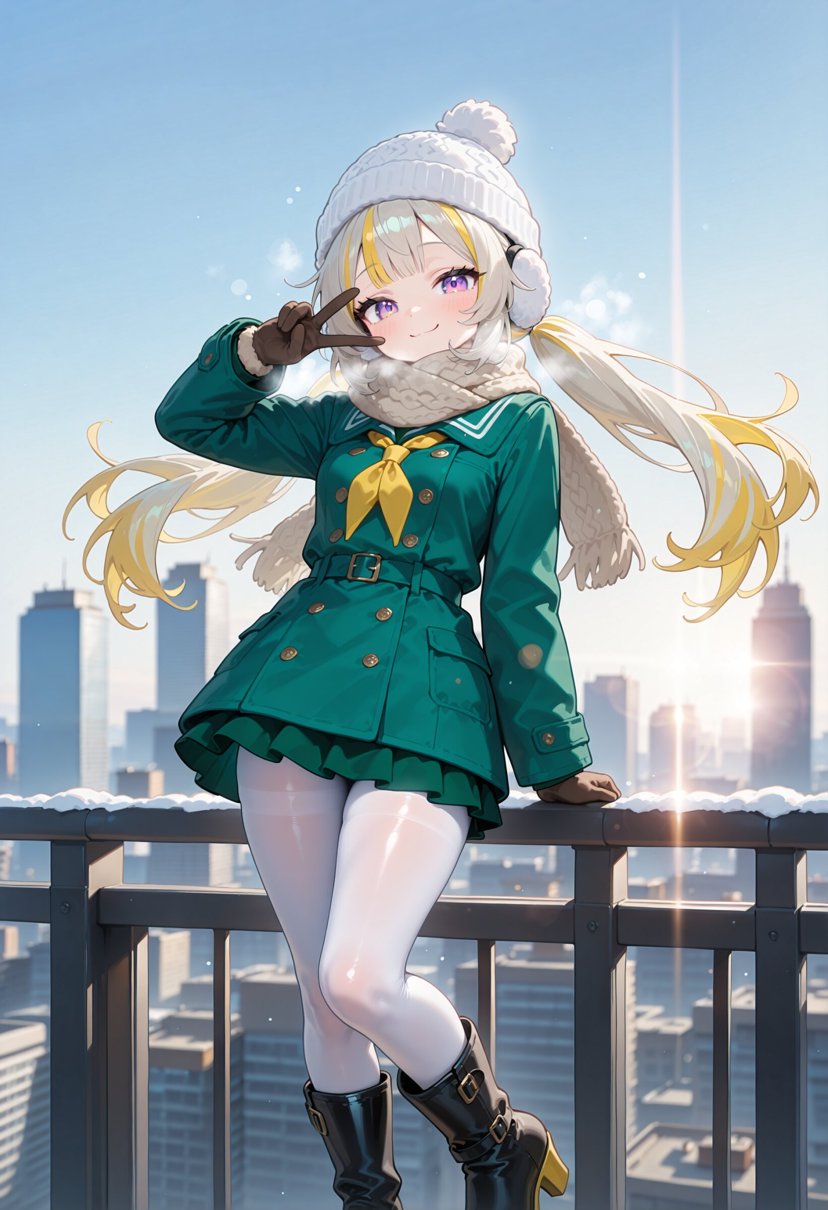 foreshortening, (face:1.0) looking at viewer, 1girl, beautiful detailed eyes, cute face, cool, shiny skin, skindentation, beautiful indigo eyes, , , multicolored hair, ivory hair, skyblue and bisque and yellow hair cute, shoulder length hair, twintails choppy bangs , soft hair, first-rate female body perfect body beautiful small breasts, smart hips,, warm comfy (soft smile:1.1) happy and laughing, seductive smile (wearing winter clothes, winter scarf, , black fur gloves, pea coat:1.1), earmuffs winter hat, cobalt green school uniform in pea coat, long sleeves, neckerchief short plated skirt boots, long sleeves, white pantyhose, high heel boots (smile absently:1.0), depth of field, bokeh, morning street, cityscape, City skyscraper district Tall buildings reflecting the morning sun., winter sunlight, morning, sunshine, direct lighting, v over eye, (simple background:1.0) super fine concept art, hard surface, 8K, unreal engine, masterpiece, best quality, amazing quality, very aesthetic, absurdres, you can add scenery, (volumetric lighting), To make the background more distinctive. professional art lots of details, , overexposure, shiny-glistening, (watercolor style:0.0), (pastel color style:1.0) <lora:noline (1):-0.5> <lora:sdxl2-flat2-512b:0.15> <lora:facelightup_xl_v10:0.5>