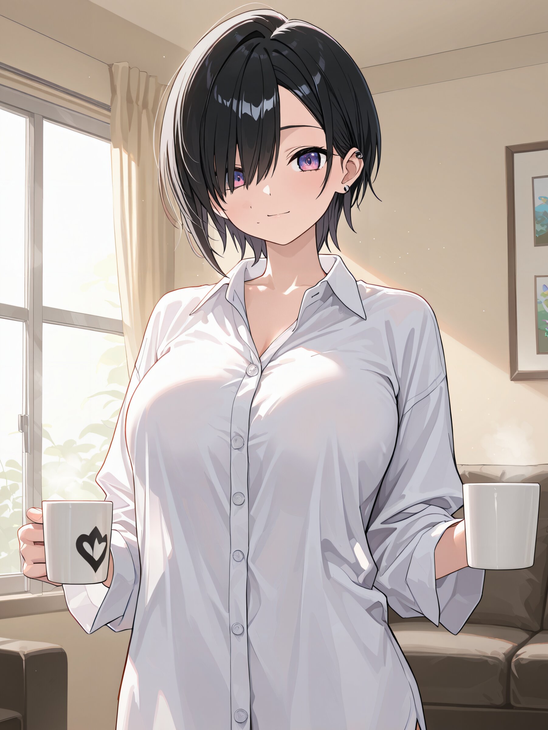 rating explicit,masterpiece,best quality,amazing quality,very aesthetic,high detailed skin,alluring high resolution,anime style,digital cel-shaded anime,(line art:1.2),intricate detail,absurdres,8k,smooth line, BREAK living room, 1girl,solo,standing,upper body,looking at viewer,light smile, holding cups, collared shirt,naked shirt,oversized shirt,