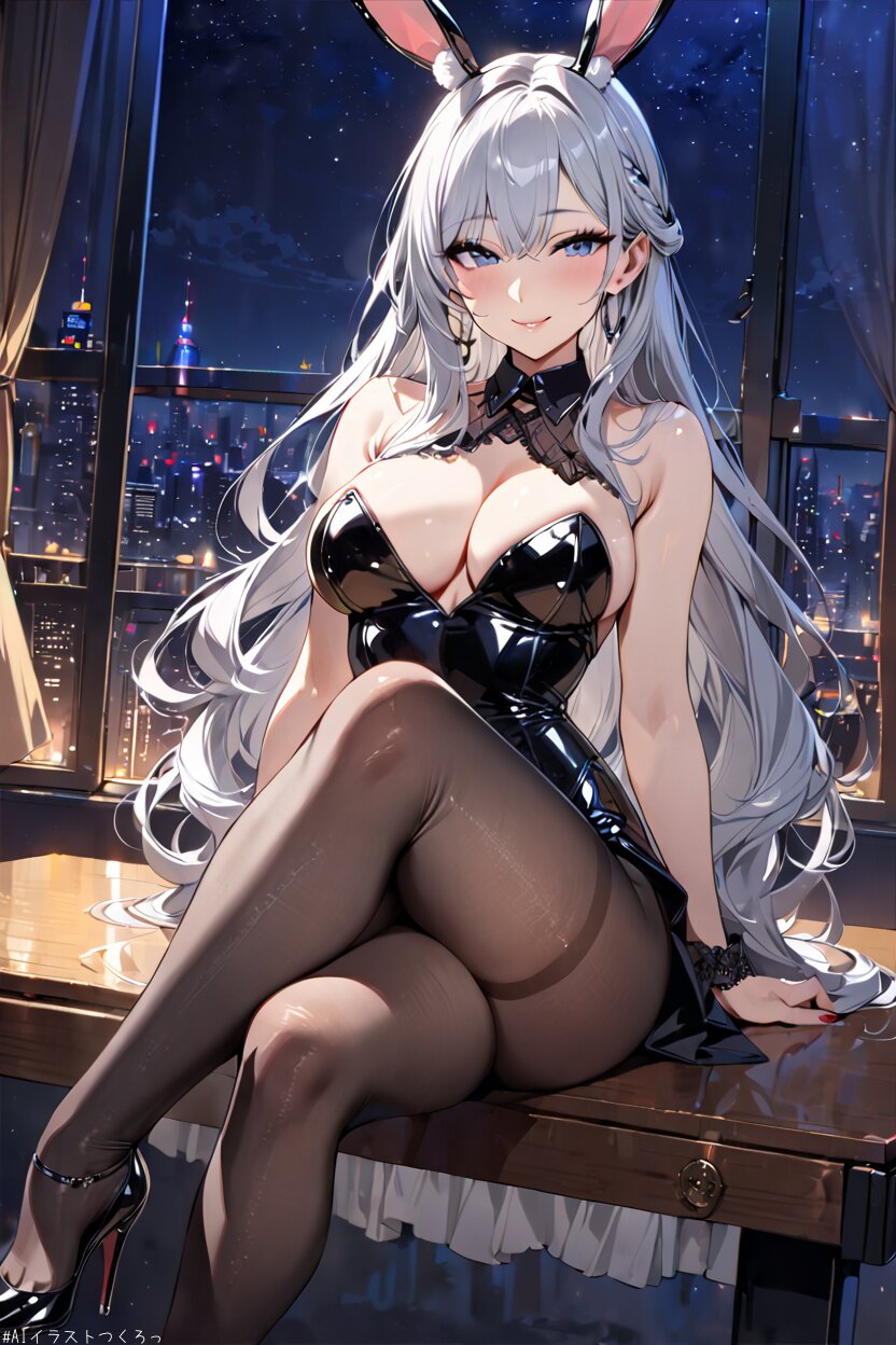 (best quality),(masterpiece),(ultra detailed),1 lady, long hair, silver hair, night, seductive smile, sitting on table, breasts, bunny, black pantyhose, crossed legs