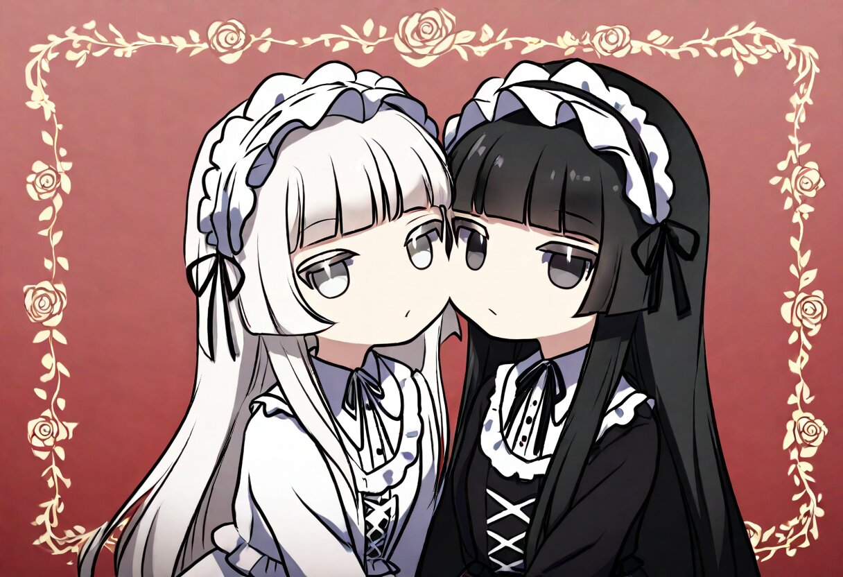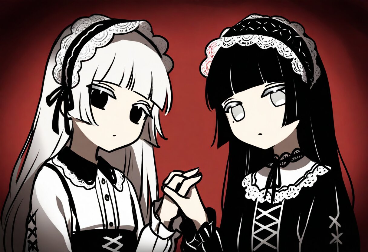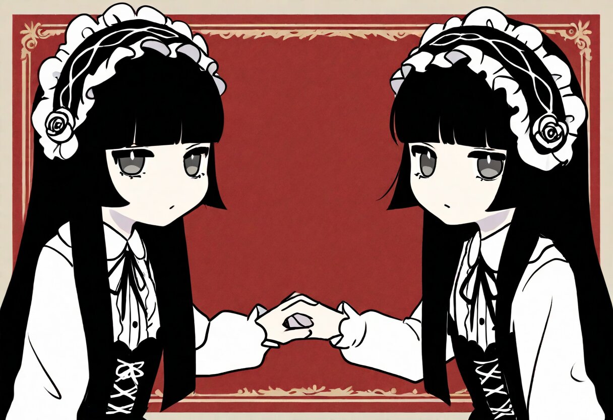 <lora:inmnsylexl4:1>2girls, child, holding hands, looking at viewer, gthic lolita fashion, long sleeves dress, lace-up corset, long hair, hime cut, upper body, (decorative border:1.4), (surround red rose:1.2), cheek to cheek, red background, (1girl is black hair, white eyes, black dress, white head dress), and (1girl is white hair, black eyes, white dress, black head dress)