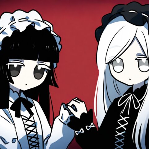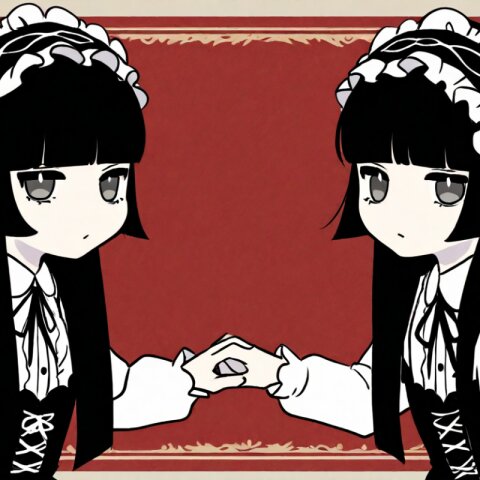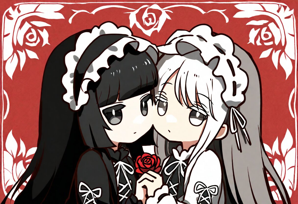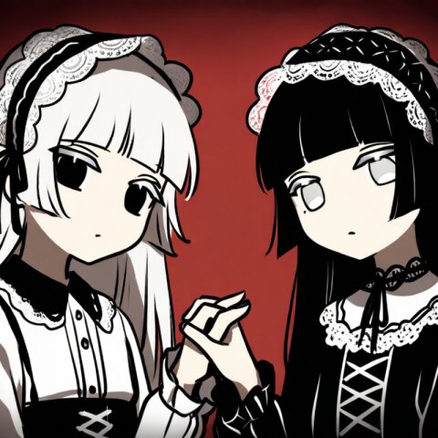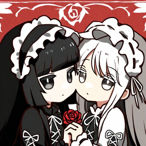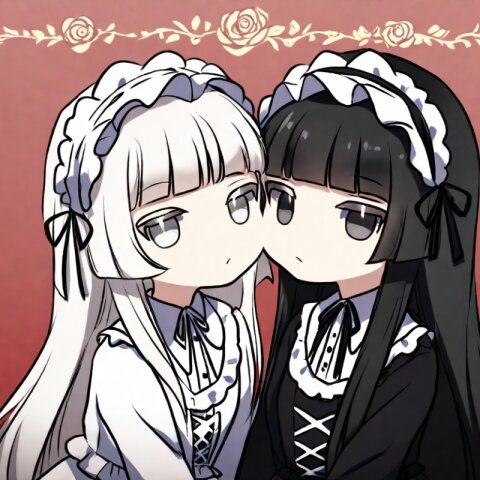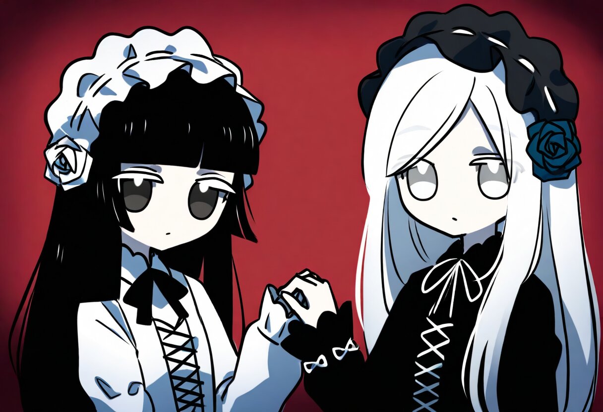 <lora:inmnsylexl4:1>2girls, child, holding hands, looking at viewer, gthic lolita fashion, long sleeves dress, lace-up corset, long hair, hime cut, upper body, (decorative border:1.4), (surround red rose:1.2), cheek to cheek, red background, (1girl is black hair, white eyes, black dress, white head dress), and (1girl is white hair, black eyes, white dress, black head dress)