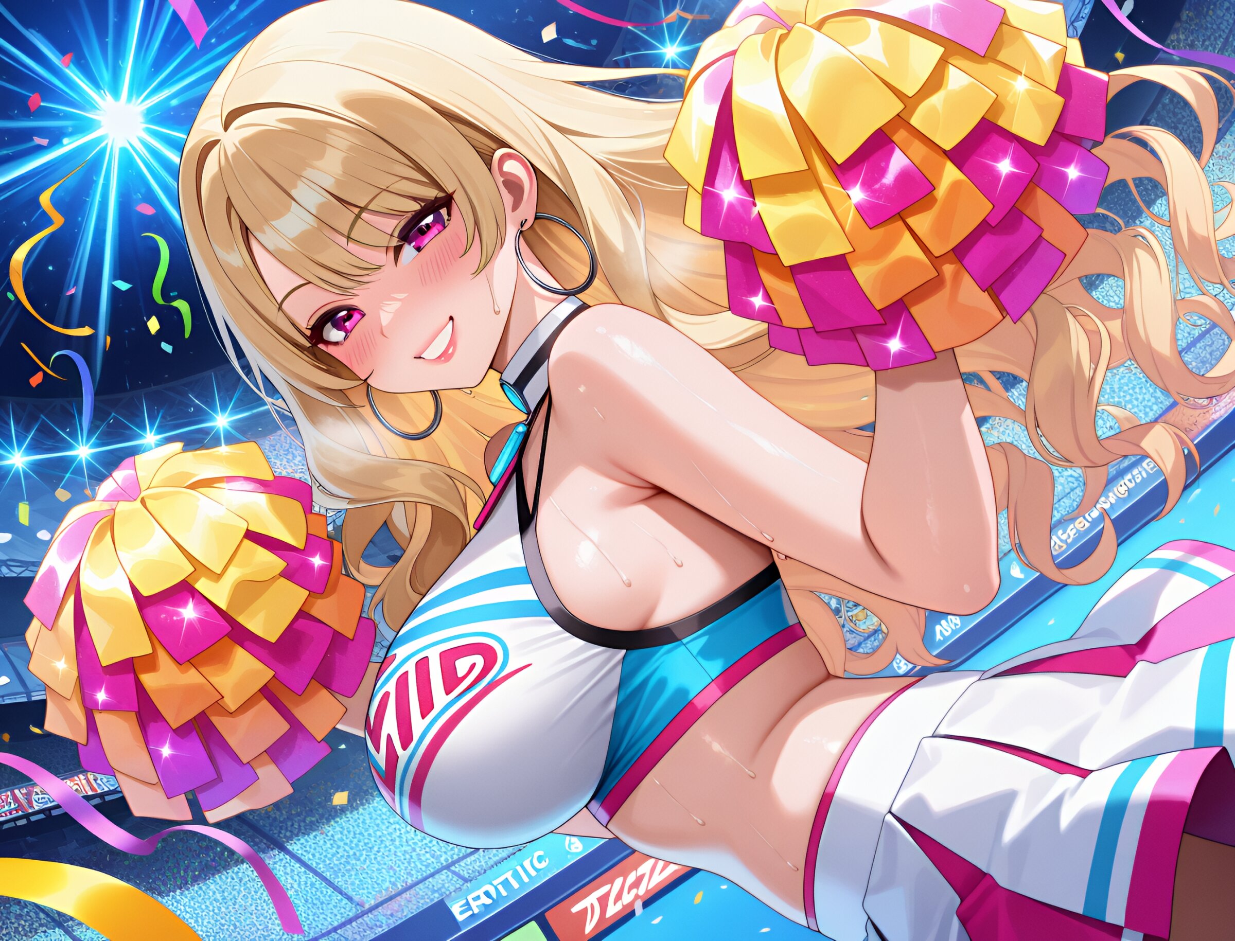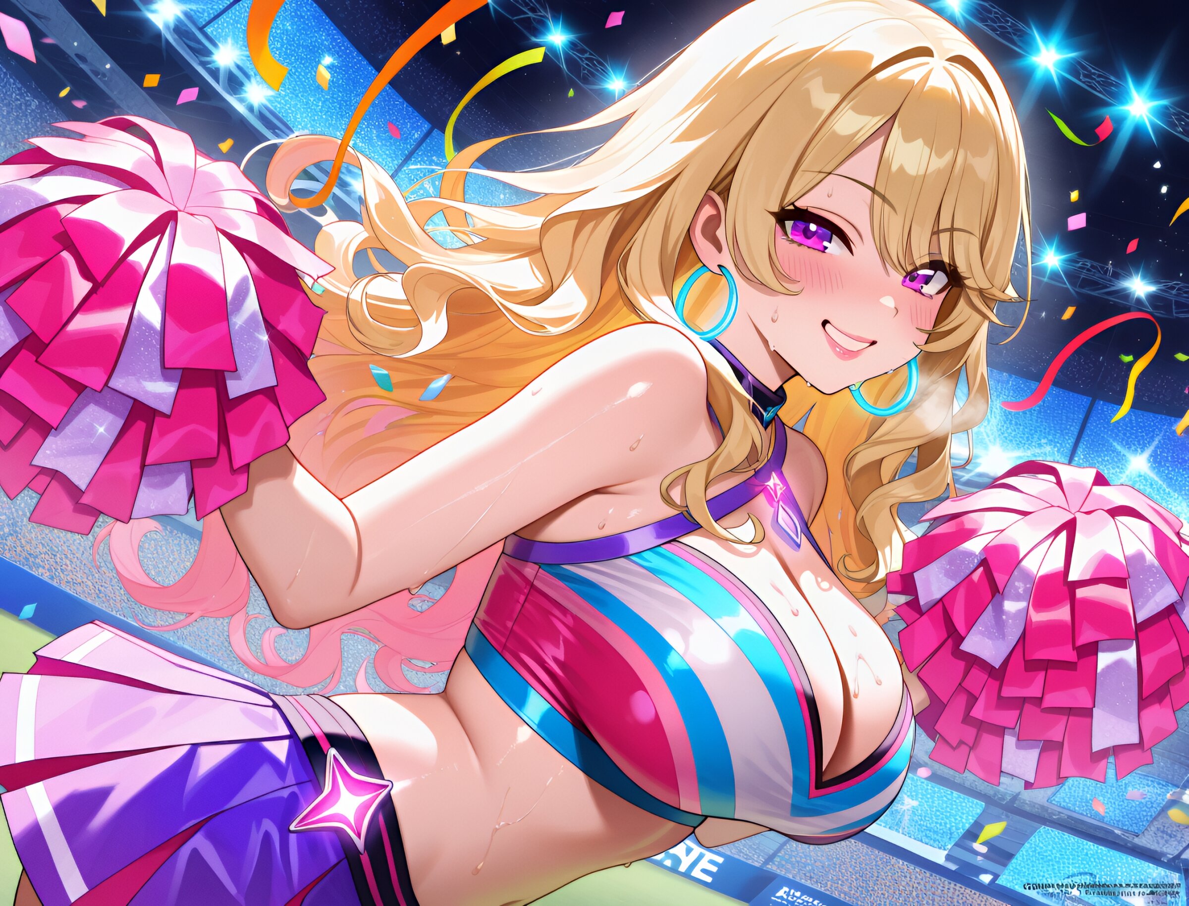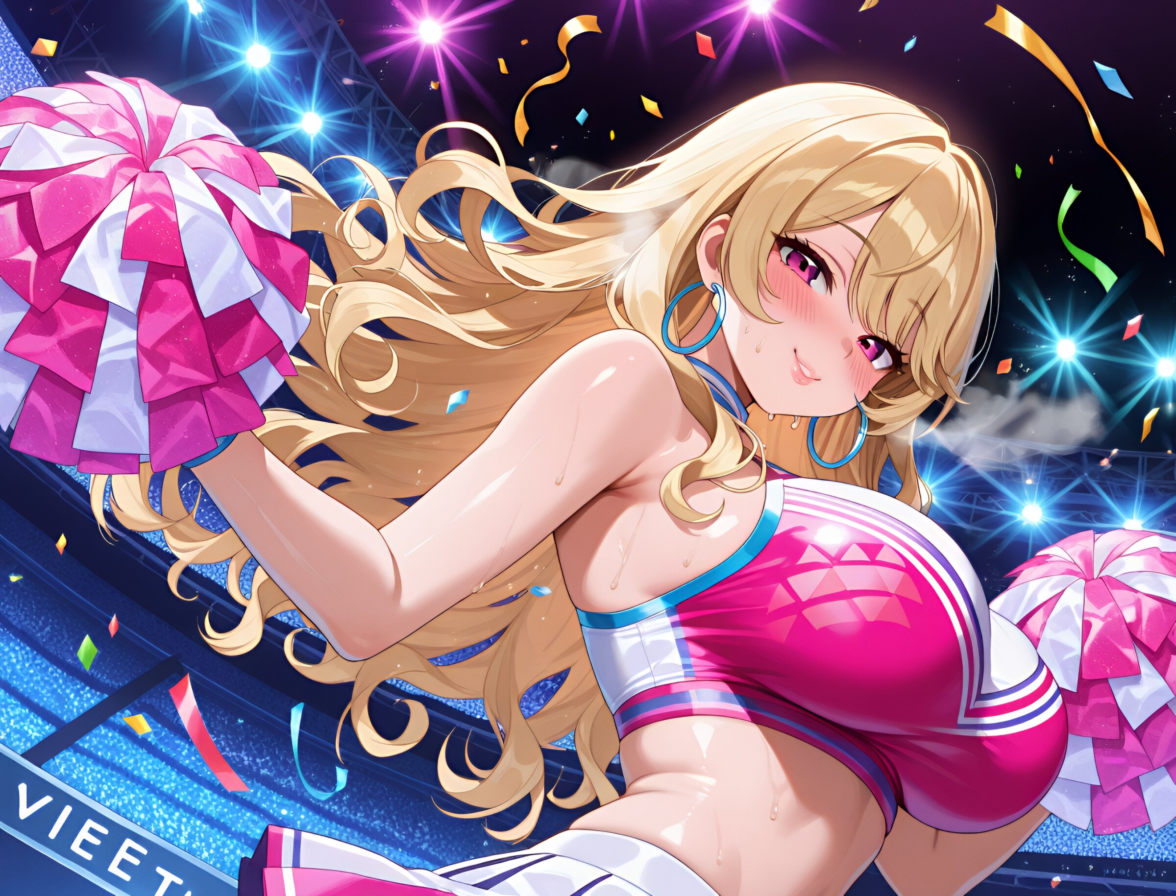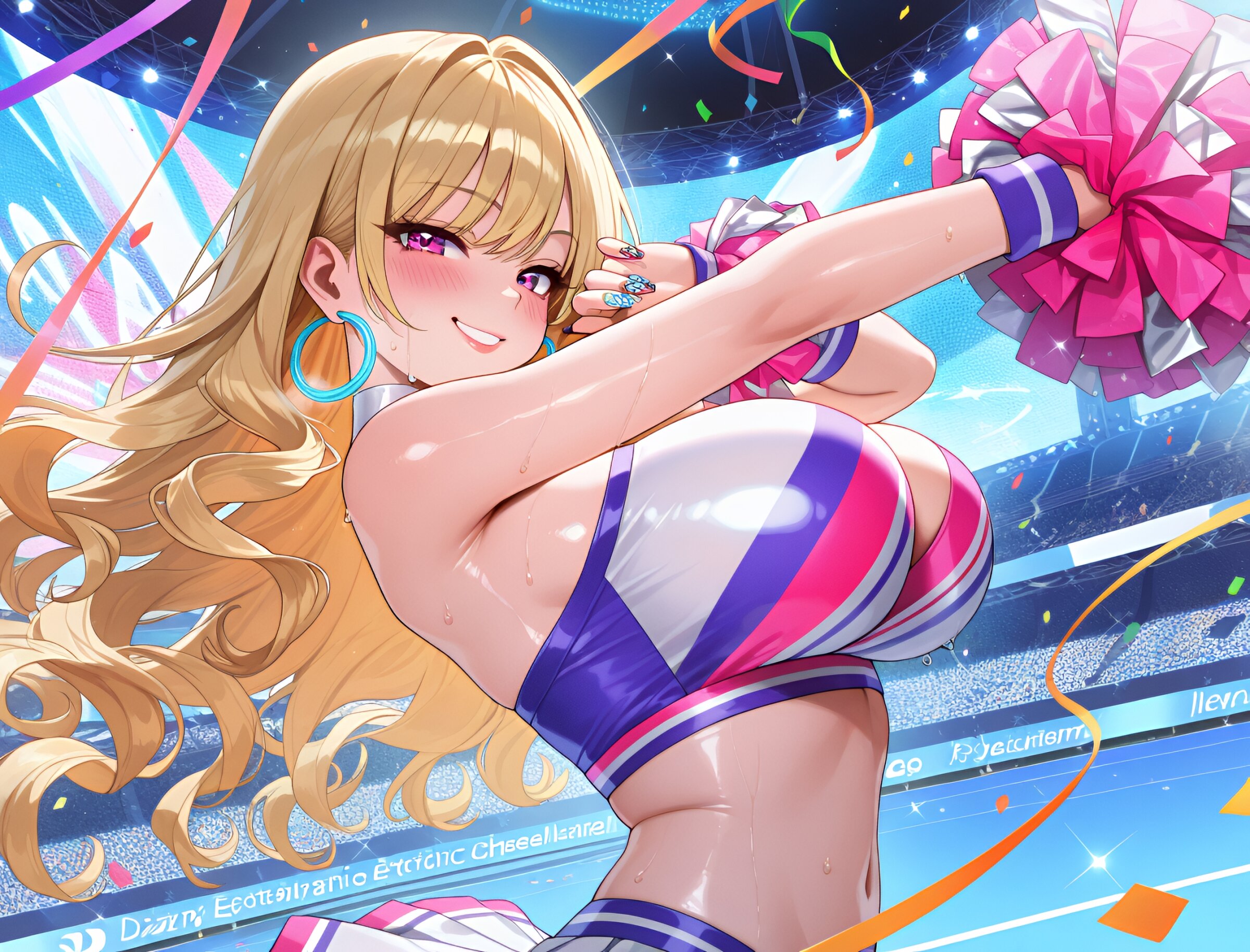 (upper body:1.5), solo, long wavy blond hair, gyaru style, colorful layered cheerleader outfit, vibrant top, flashy pleated skirt, oversized accessories, shiny lips, large hoop earrings, bright nail art, (playful cheering pose:1.2), holding detailed pom-poms with thin and dense ribbons, (blush and flushed cheeks:1.3), (sweat dripping on skin:1.2), (glistening skin with sheen), high-fashion magazine vibe, (confident and cheerful smile), expressive face, long manicured nails, sparkling effects, confetti-filled background, dramatic lighting, vibrant stadium scene, (dynamic angle:1.3), posing confidently, glowing jewelry, dazzling performance atmosphere, vivid decorations, (increased background streamers and colorful tapes), masterful use of layers and contrast highlights,(large breast and hips), from side, looking at viewer, (steamy heat effect:1.2),(erotic:1.8), from side, looking at viewer, dynamic pose, dynamic angle, masterpiece, best quality, very aesthetic, <lora:noobai_ep11_stabilizer_v0.11_fp16:0.7> <lora:StS-Illustrious-Detail-Slider-v1.0:2.> <lora:sdxl-hairdetailer_02:2> <lora:xl_more_art-full_v1:1.1.4>
