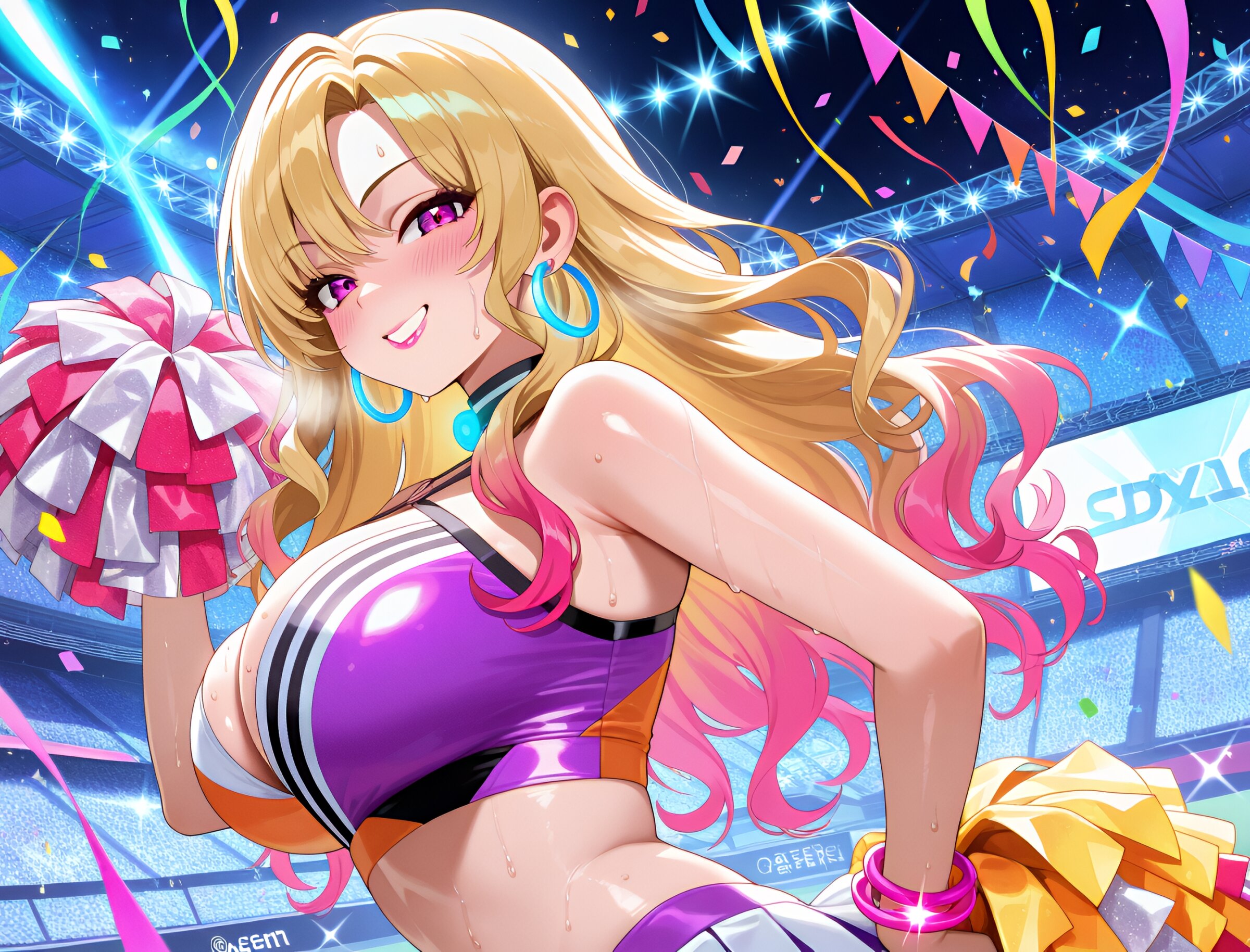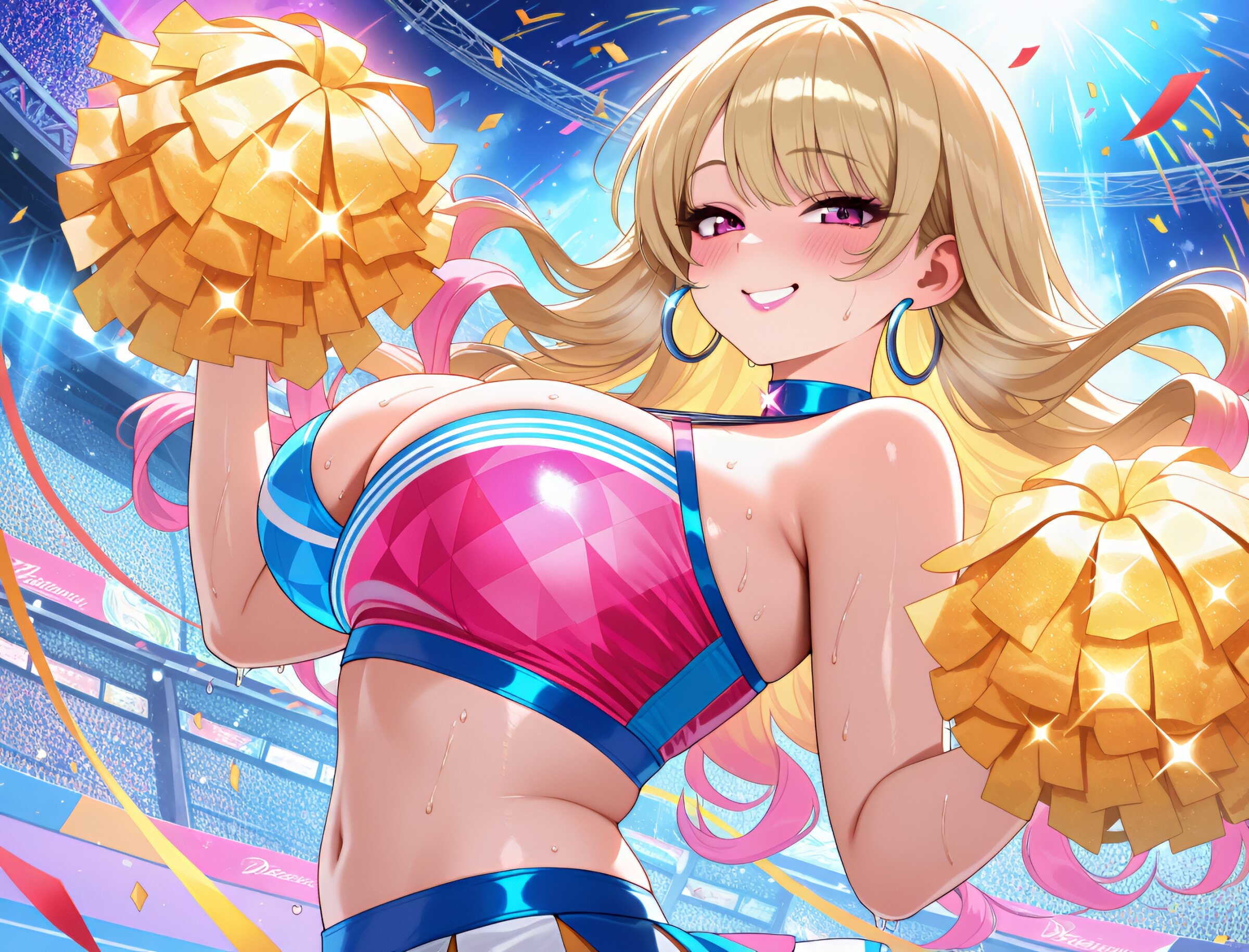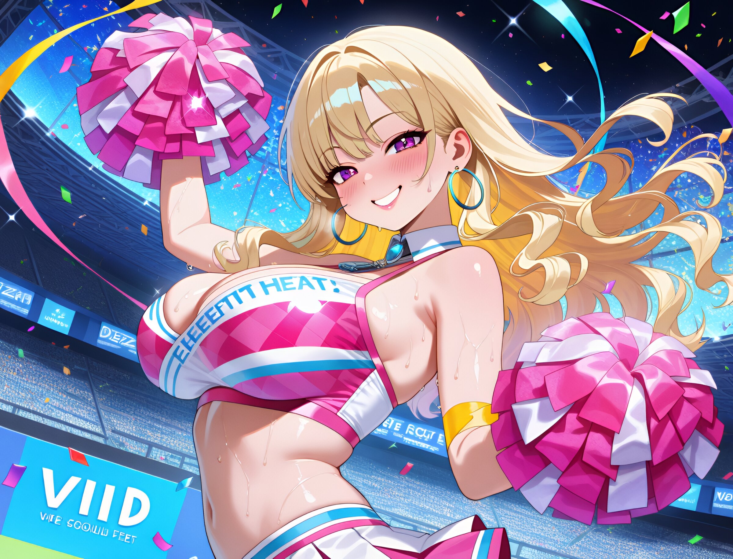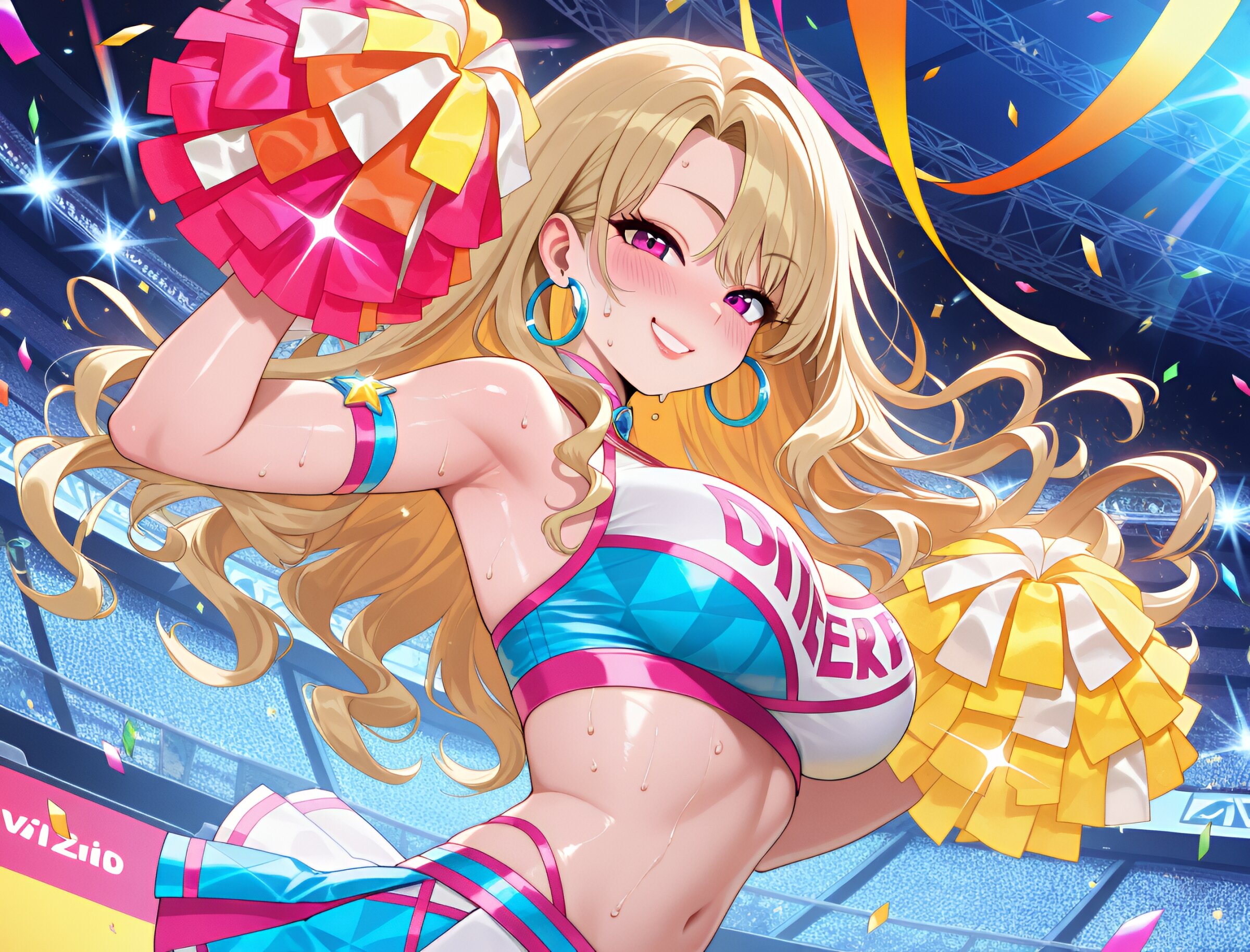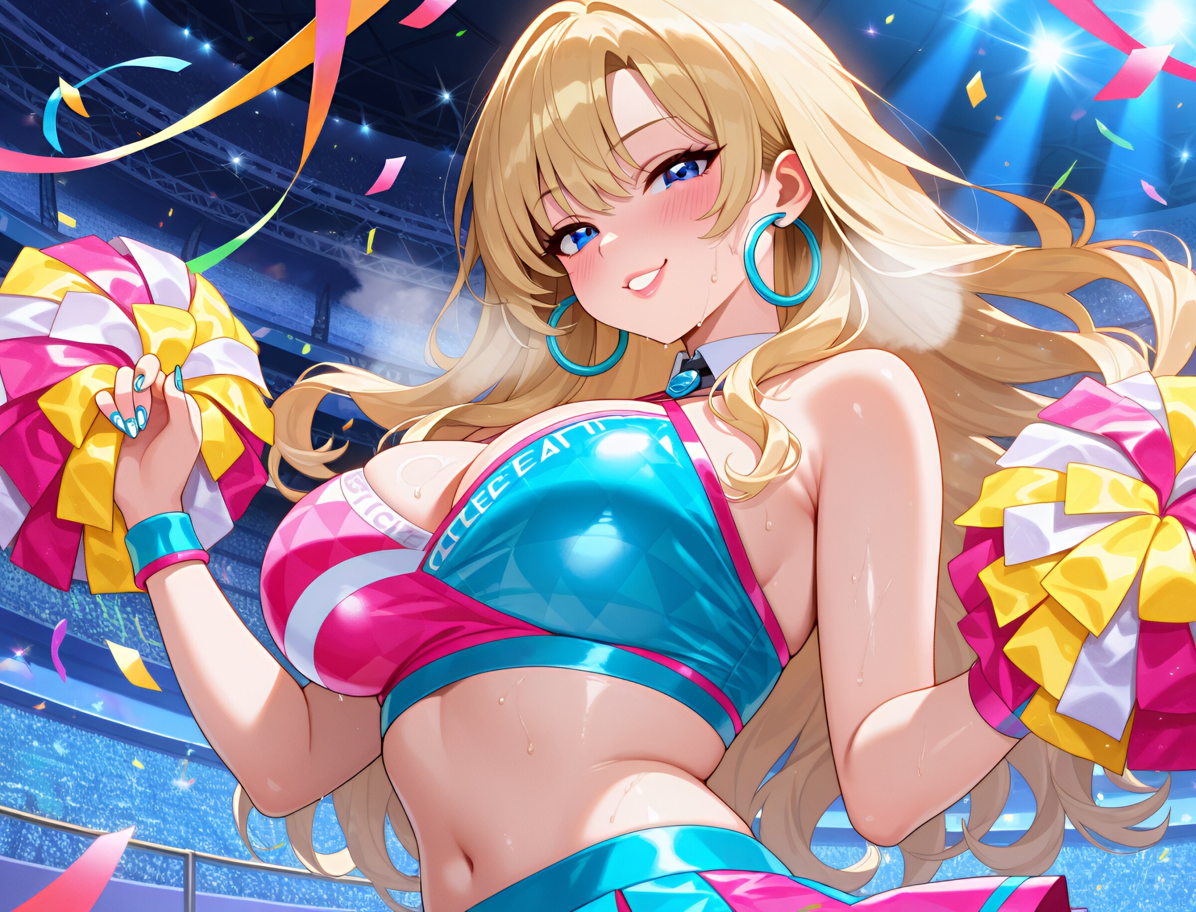(upper body:1.5), solo, long wavy blond hair, gyaru style, colorful layered cheerleader outfit, vibrant top, flashy pleated skirt, oversized accessories, shiny lips, large hoop earrings, bright nail art, (playful cheering pose:1.2), holding detailed pom-poms with thin and dense ribbons, (blush and flushed cheeks:1.3), (sweat dripping on skin:1.2), (glistening skin with sheen), high-fashion magazine vibe, (confident and cheerful smile), expressive face, long manicured nails, sparkling effects, confetti-filled background, dramatic lighting, vibrant stadium scene, (dynamic angle:1.3), posing confidently, glowing jewelry, dazzling performance atmosphere, vivid decorations, (increased background streamers and colorful tapes), masterful use of layers and contrast highlights,(large breast and hips), from side, looking at viewer, (steamy heat effect:1.2),(erotic:1.8), from side, looking at viewer, dynamic pose, dynamic angle, masterpiece, best quality, very aesthetic, <lora:noobai_ep11_stabilizer_v0.11_fp16:0.7> <lora:StS-Illustrious-Detail-Slider-v1.0:2.> <lora:sdxl-hairdetailer_02:2> <lora:xl_more_art-full_v1:1.1.4>