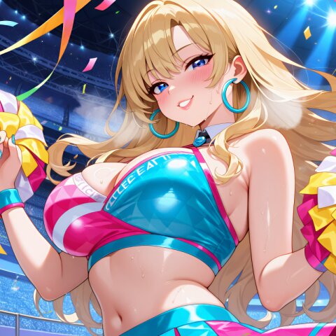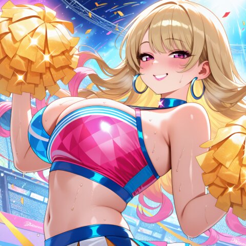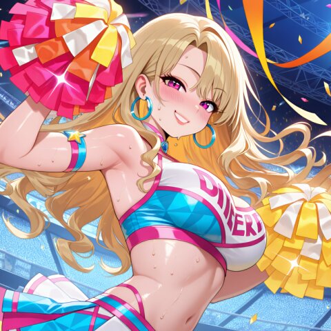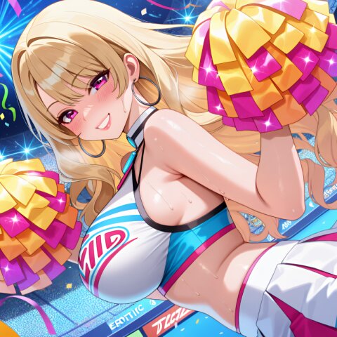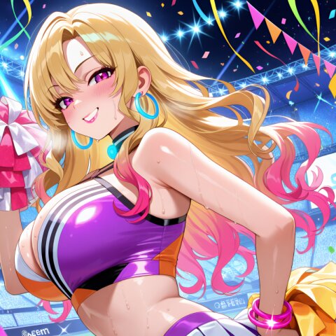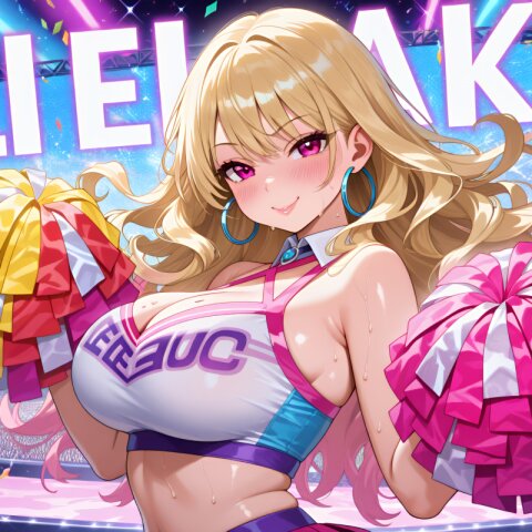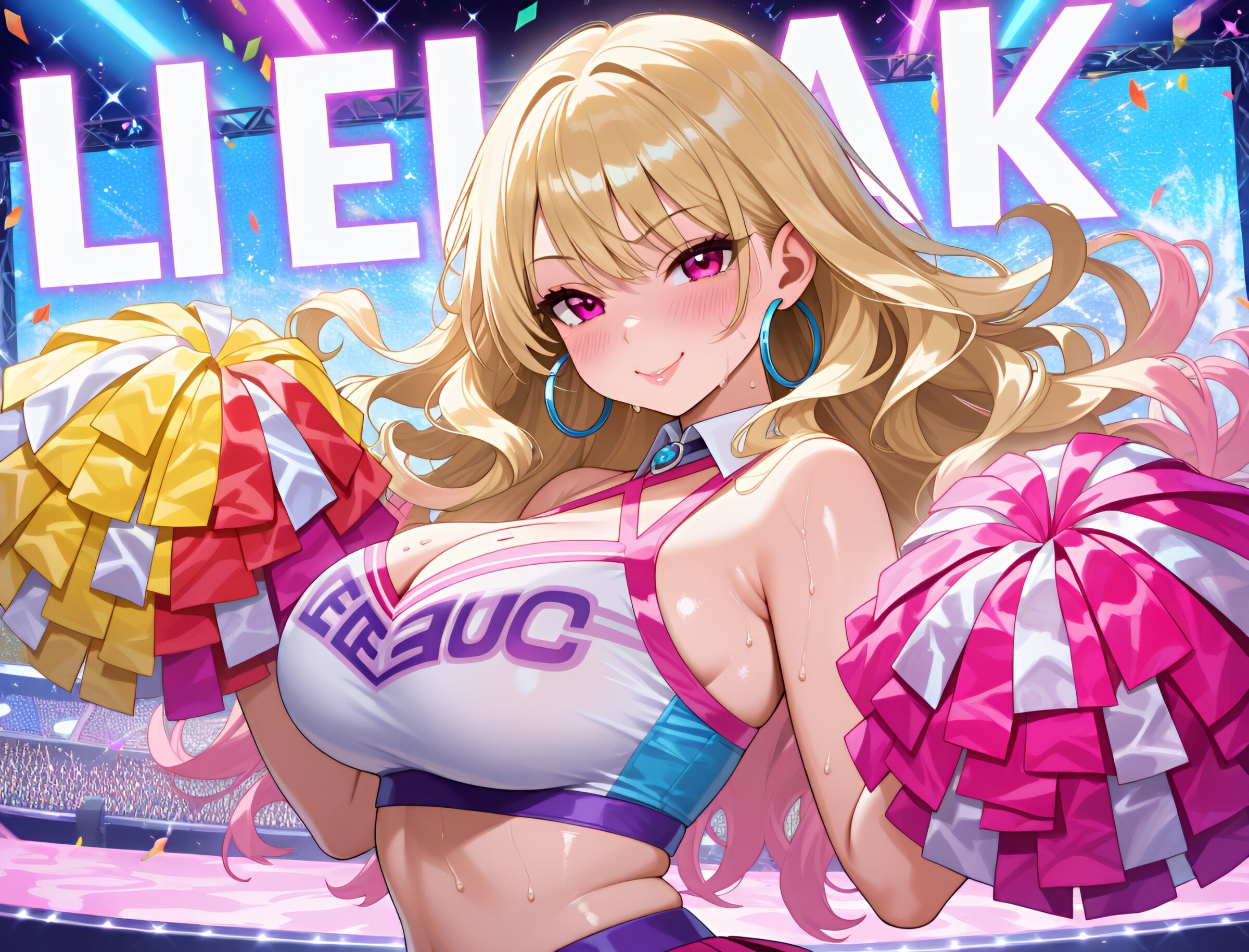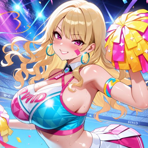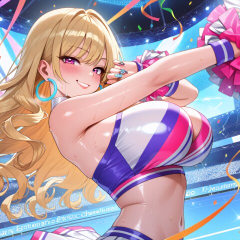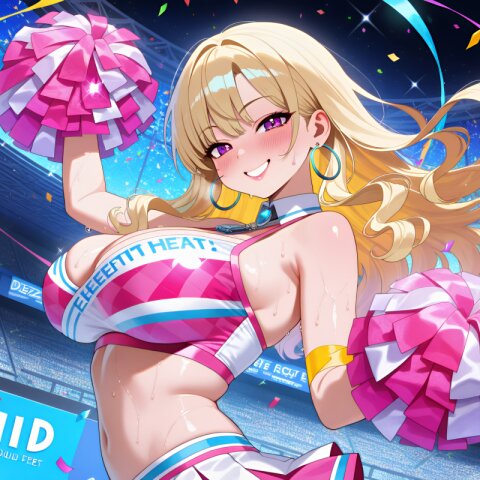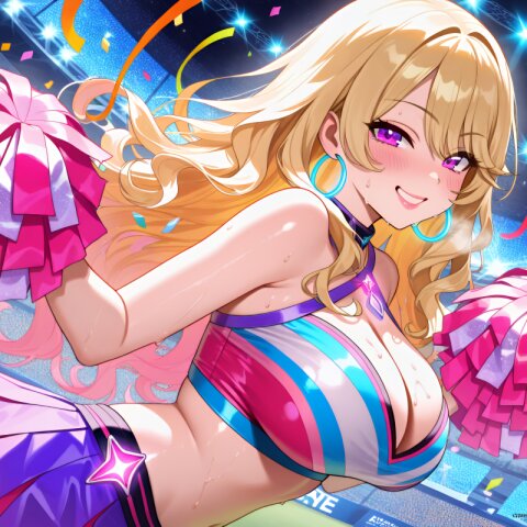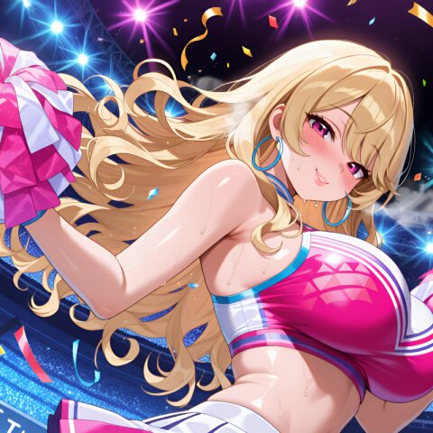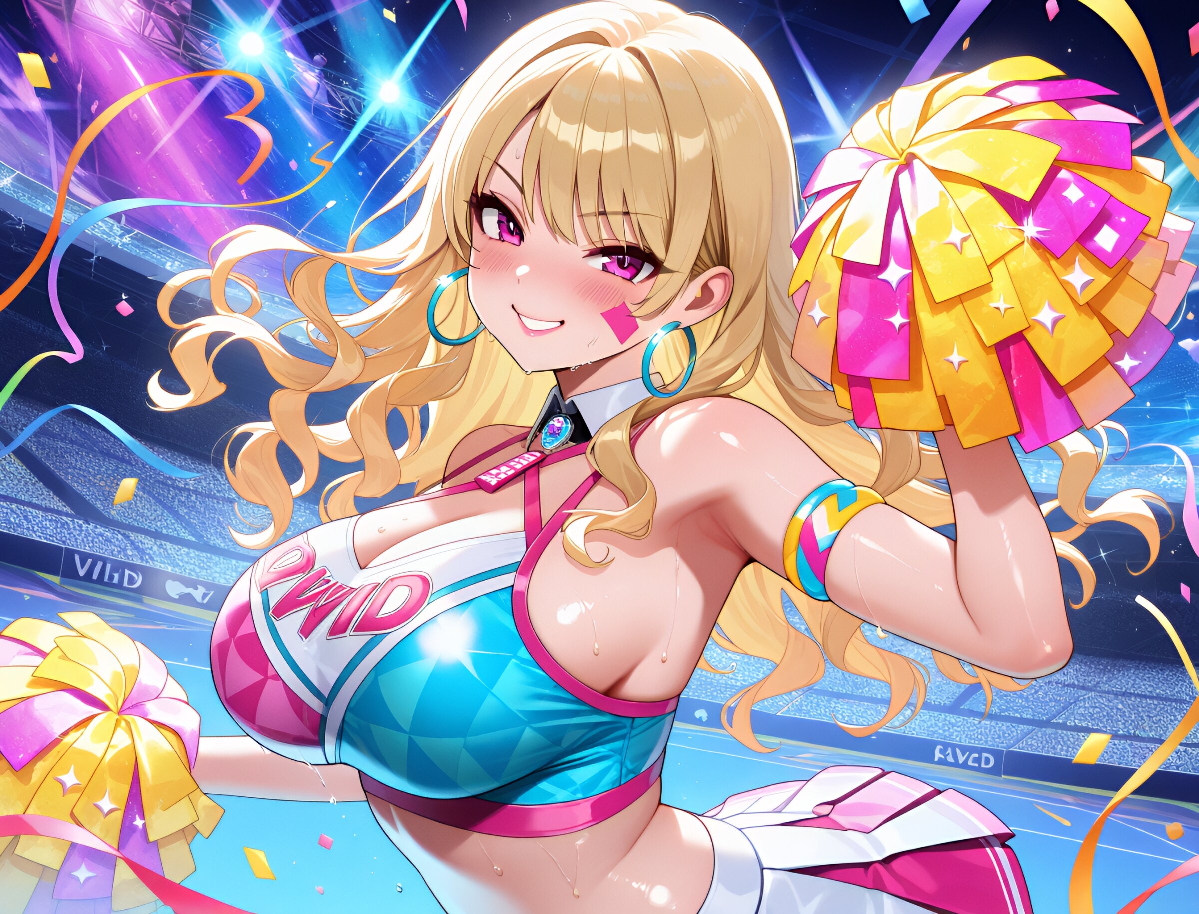 (upper body:1.5), solo, long wavy blond hair, gyaru style, colorful layered cheerleader outfit, vibrant top, flashy pleated skirt, oversized accessories, shiny lips, large hoop earrings, bright nail art, (playful cheering pose:1.2), holding detailed pom-poms with thin and dense ribbons, (blush and flushed cheeks:1.3), (sweat dripping on skin:1.2), (glistening skin with sheen), high-fashion magazine vibe, (confident and cheerful smile), expressive face, long manicured nails, sparkling effects, confetti-filled background, dramatic lighting, vibrant stadium scene, (dynamic angle:1.3), posing confidently, glowing jewelry, dazzling performance atmosphere, vivid decorations, (increased background streamers and colorful tapes), masterful use of layers and contrast highlights,(large breast and hips), from side, looking at viewer, (steamy heat effect:1.2),(erotic:1.8), from side, looking at viewer, dynamic pose, dynamic angle, masterpiece, best quality, very aesthetic, <lora:noobai_ep11_stabilizer_v0.11_fp16:0.7> <lora:StS-Illustrious-Detail-Slider-v1.0:2.> <lora:sdxl-hairdetailer_02:2> <lora:xl_more_art-full_v1:1.1.4>