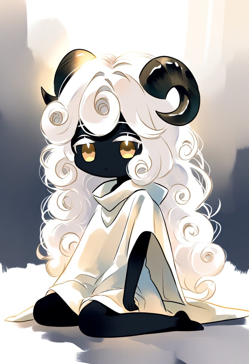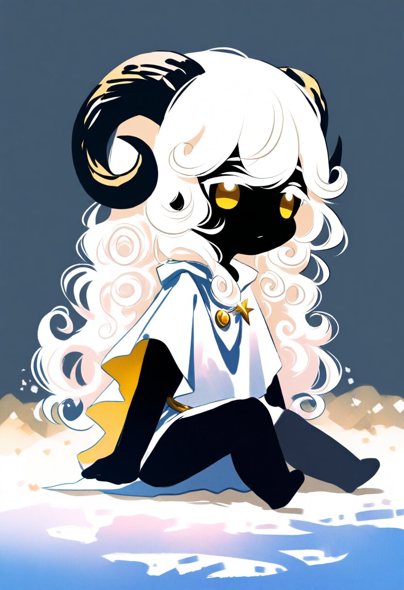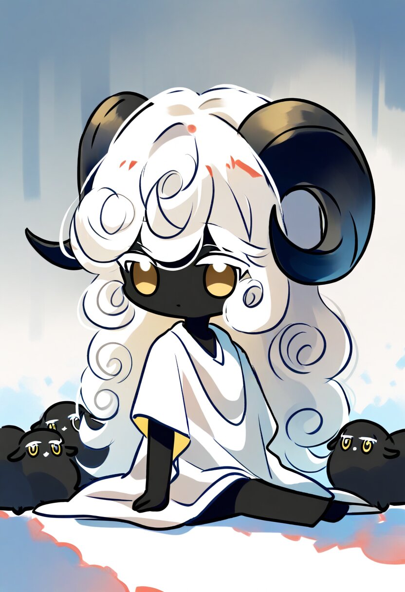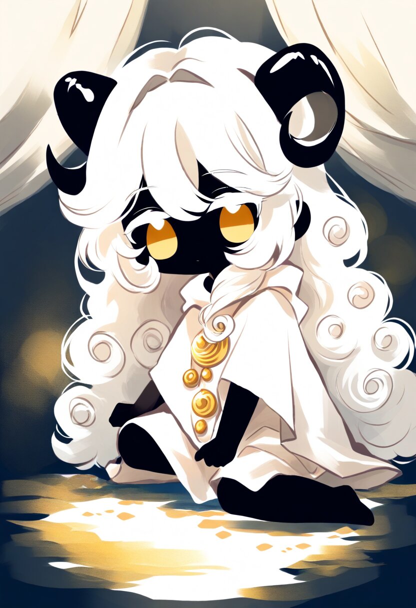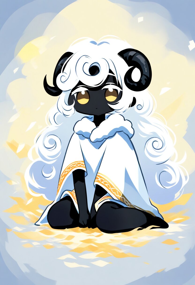 <lora:inmnsylexl4:1>best quality, masterpiece, very aesthetic, general, watercolor painting, chibi, 1girl, white hair, curly hair, long hair, black skin, black sheep horns, white poncho, white short drawers, golden eyes, sitting on floor