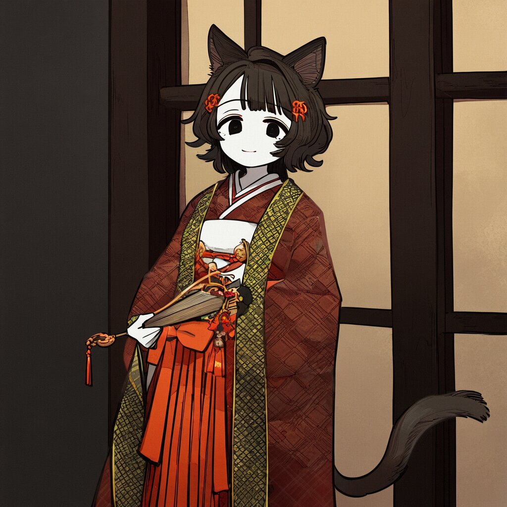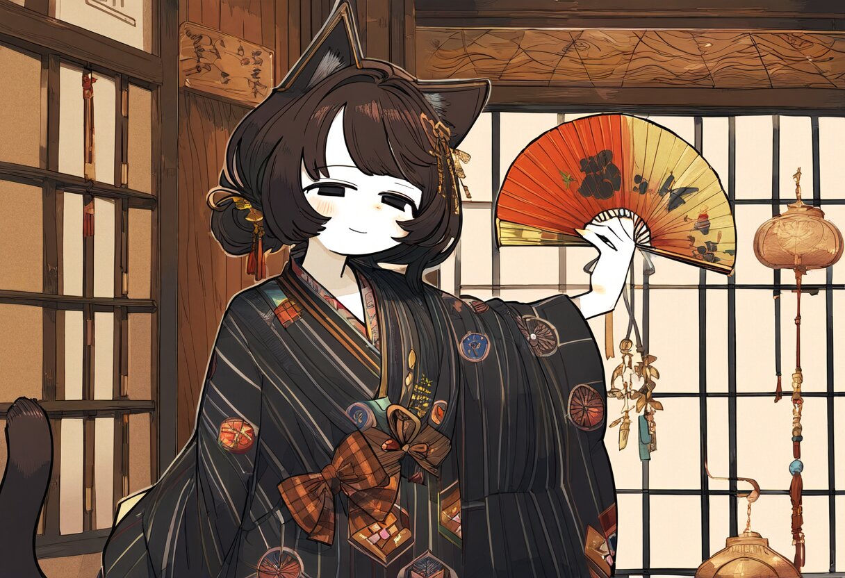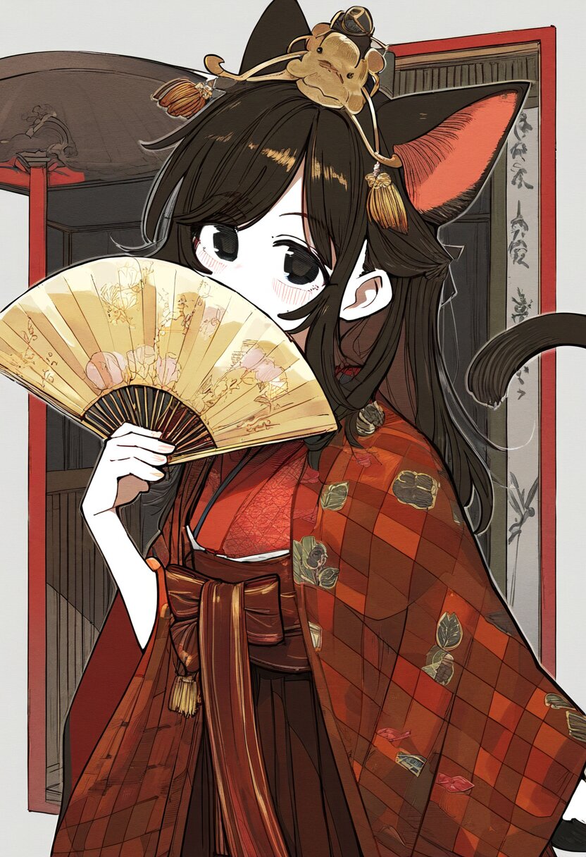 {{{highly detailed}}}, {{{interspecies}}}, {{{beautiful detailed}}}, {{{{{{nihonga}}}}}}, {{loli, adult woman}}, 1girl, solo, black eyes, {{{{tareme}}}}, small breasts, white skin, light smile, dark brown hair, cat ears, cat tail, kimono with brown checked pattern, {{{hold a fan}}}, {{{upper body, standing}}}, divine and gorgeously decorated oiran, her face is gorgeously decorated, indoor, {{{masterpiece}}}, {{{best quality}}}, {{{very aesthetic}}}, {{{ultra-detailed}}}, {illustration}, {{{extremely detailed}}}, {{{an extremely delicate and beautiful}}}