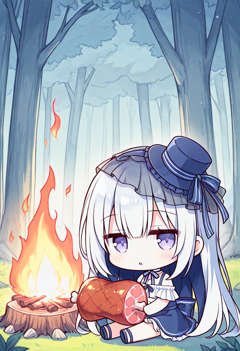 best quality, (pale color:0.6), clear theme, portrait, simple background, (chibi:1.3), (chibi girl:1.1), (solo:1.3), (facing the front:0.8), looking at viewer, parted lips,(Expressionless:0.8), big eyes,(half-closed eyes:0.8), (tareme:0.9),pale purple eyes, (silver hair:1.1), (dark blue hair colored inner hair:0.8), long hair,very long hair, eyebrows visible through hair, mini hat,strapping ribbon, white off-shoulder and dark blue skirt, see-through veil, mini hat, blue strapping ribbon and bow, frills, holding boned meat,, meat, boned meat, sitting,tree stump, hungry, cooking, fire, campfire,camp,tree, from side, <lora:noline-16oa:-1.3> <lora:chibi_paru:-1.05> <lora:sdxl2-flat2-512b:-1.0>
