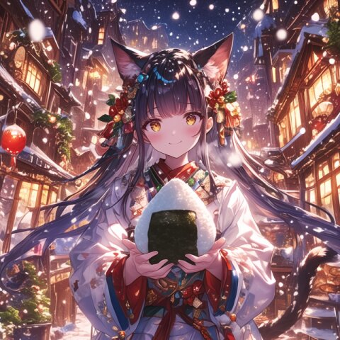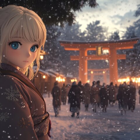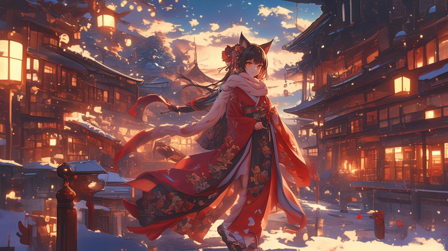 この作品は、幻想的な和の風景の中に佇む狐耳の少女を描いた一枚です。夕暮れ時の柔らかな光が街並みを包み込み、温かな灯りが雪景色に映えることで、幻想的でありながらもどこか懐かしい雰囲気を醸し出しています。