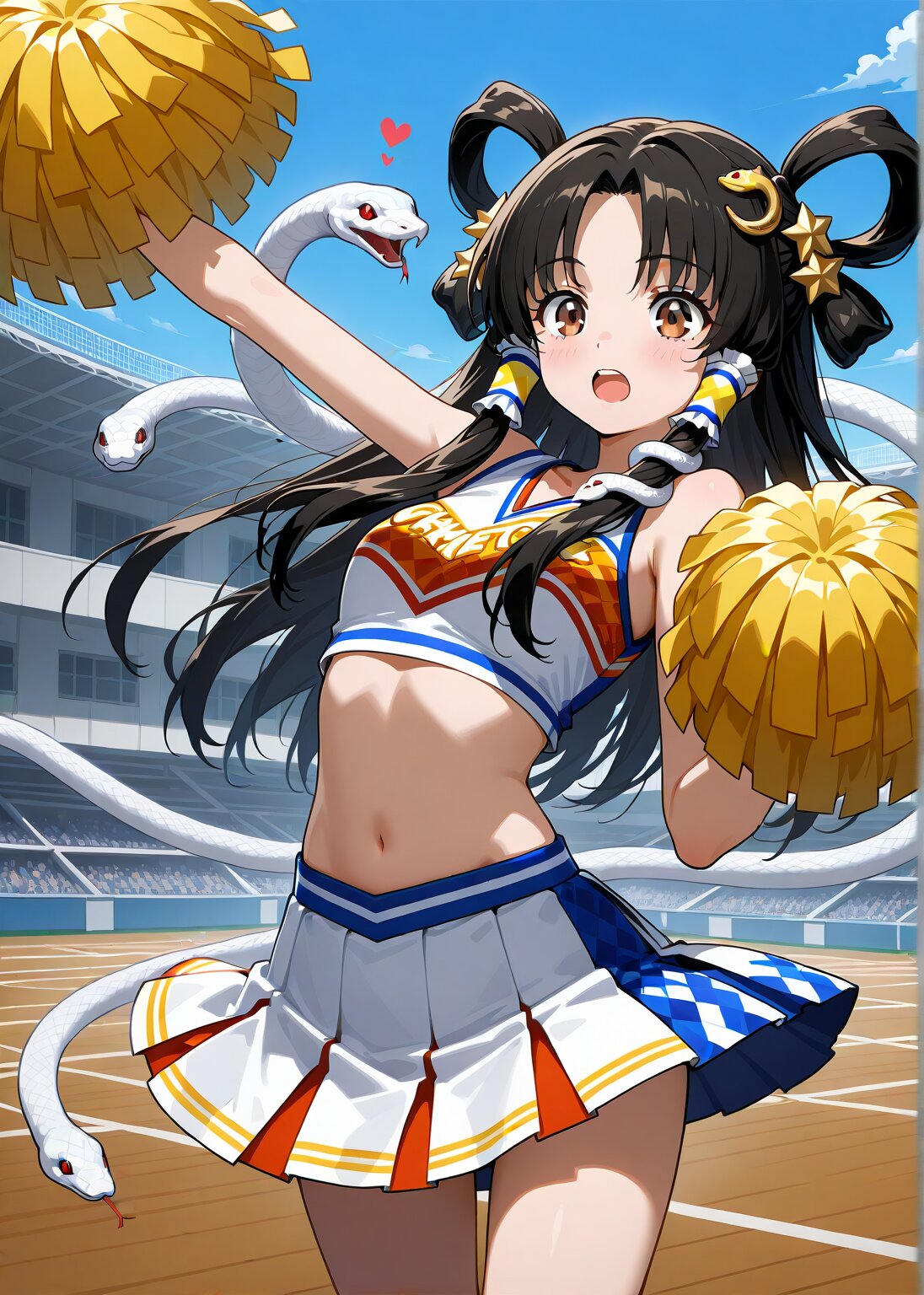 1girl, solo, perfect center part, parted bangs, hair rings. hair tubes, black hair, brown eyes, long hair, white snake, shide, ribbon trim, cheerleader, cheer dance, winter, , , argyle , , , , , cheerleader, , , heart, , , open mouth, , pleated skirt, polka dot, , pom pom \(cheerleading\), skirt, , star \(symbol\), school gymnasium, huge golden hair ornament, snake hair ornament, , , , sacred hair ornament,