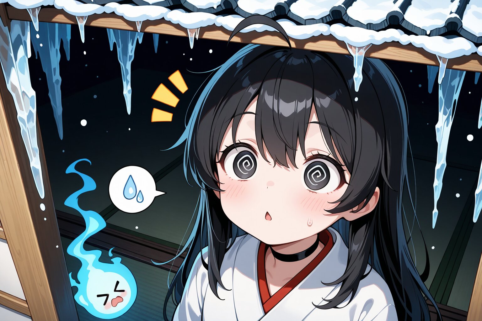 1 little girl, solo, diagonal angle, upper body looking at above, masterpiece, best quality, amazing quality, very aesthetic, black hair, long hair, ahoge, (hair over one eys:1.2), black eyes, @_@, chestnut mouth, surprised, confused, troubled, (^^^:1.2), spoken sweatdrop, comedic sweatdrop, cold sweat, choker, white kimono, hitodama, huge Icicle, snow on the japanese roof, many snow, tatami,