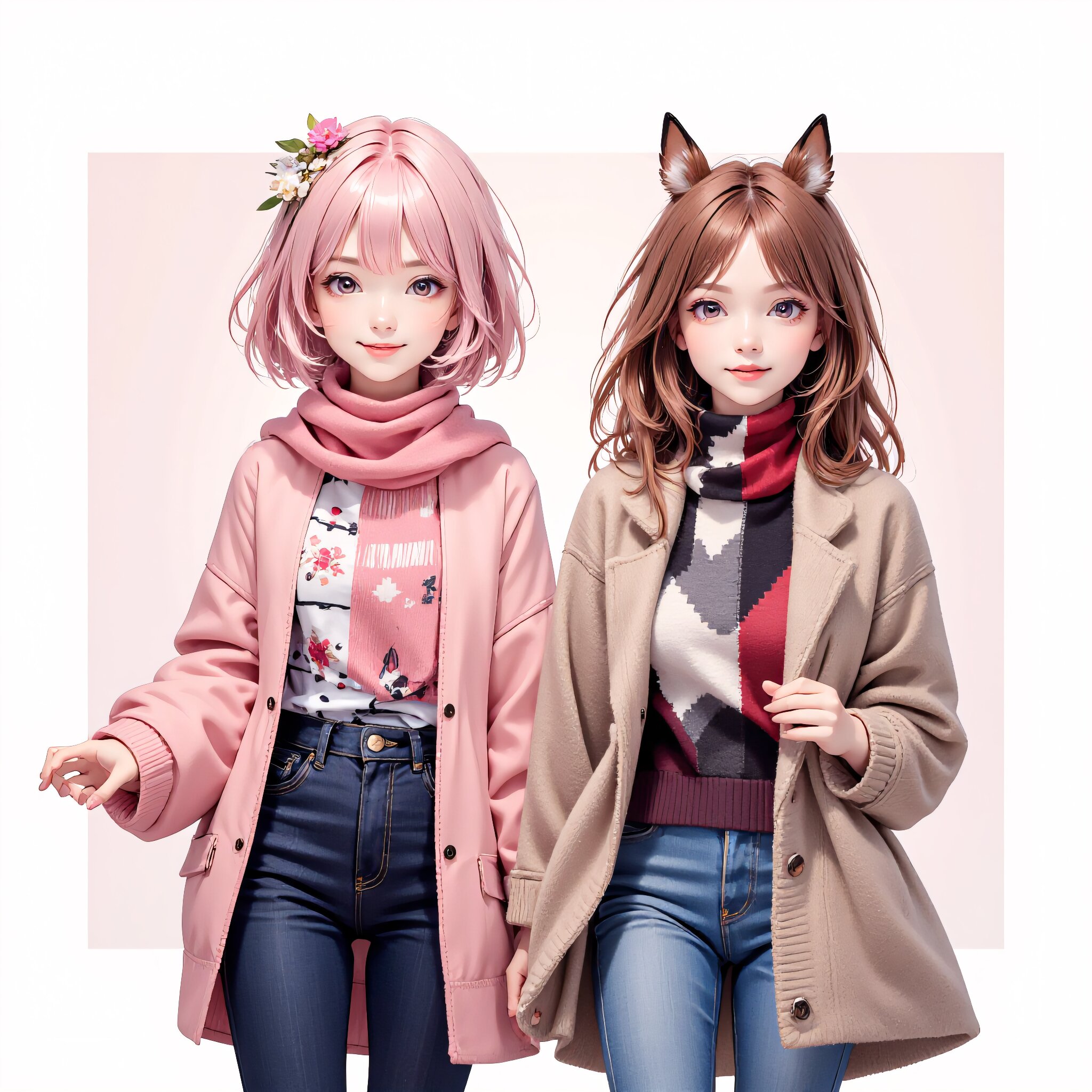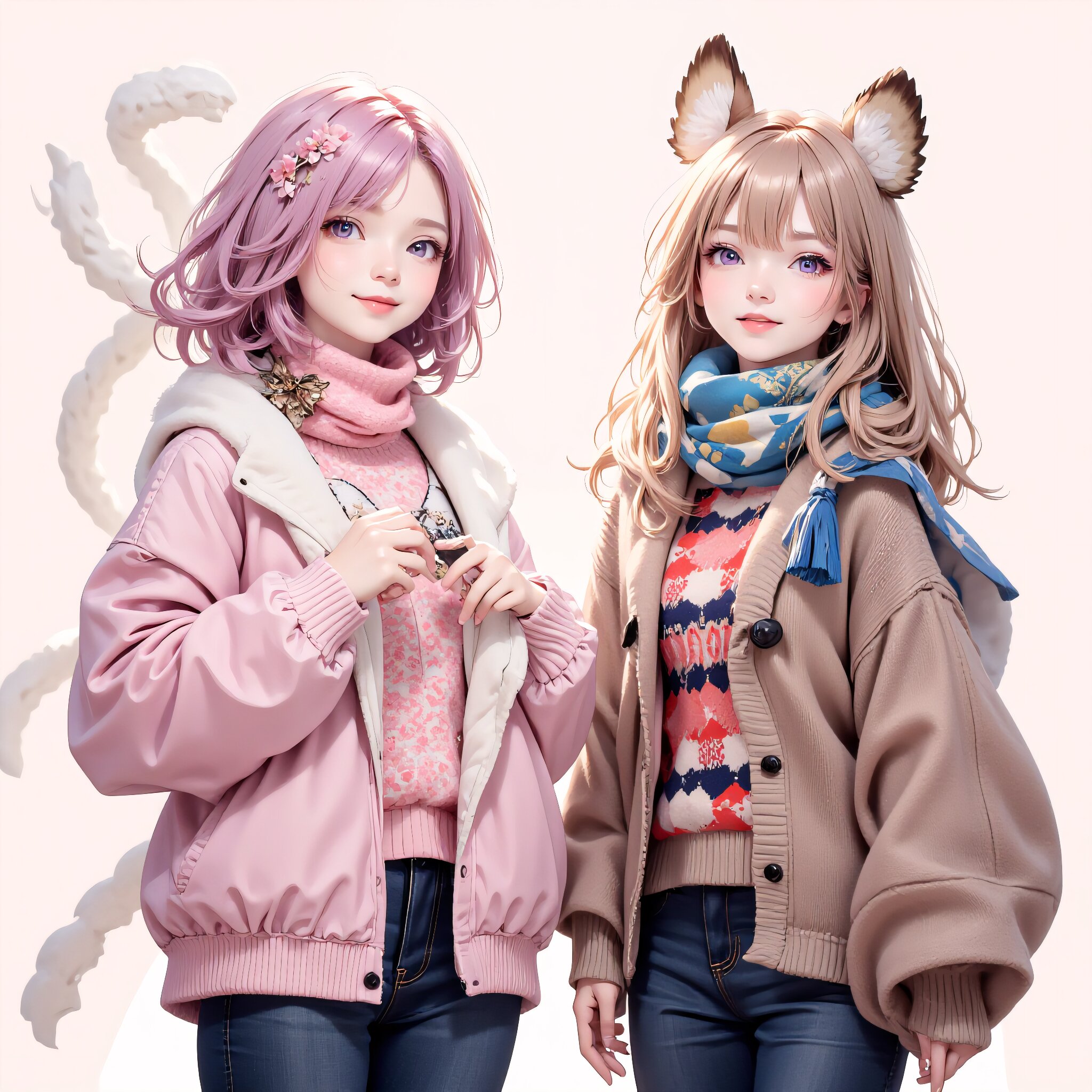 2 girls HINAKO is 1 girl,light pink hair,light pink eyes,loose wavy hairstyle,short bob cut,floral hair accessory,happy smile,,pink Open coat,Jeans pants, color pattern sweater,Check pattern muffler,white snake,winter town RIRIA is 1 girl,light brown hair, long hair, amber eyes, wild boar's ears,color patttern Sweater, color patttern muffler, coat, jeans, mouton shoes,