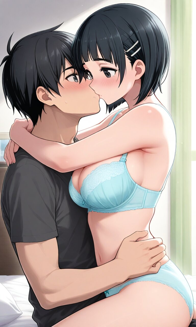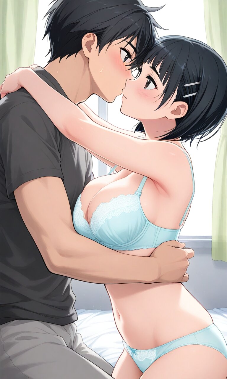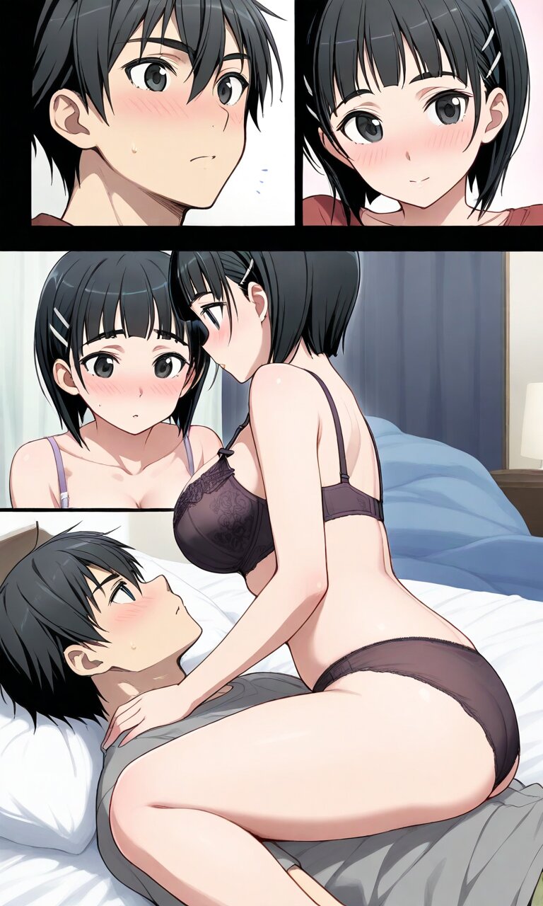 Couple, boy and girl, two people only,absurdres, ultra-detailed, master piece, high resolution, 8k, Boy, girl, couple,a comic strip showing a couple kissing on the bed together in the bedroom, 1girl, 1boy, underwear, hetero, couple, bra, breasts, panties, blush, underwear only, bra BREAK the boy(original boy,black hair,short hair, black eyes) BREAK the girl(suguha, short hair, hairclip, large breasts,, )