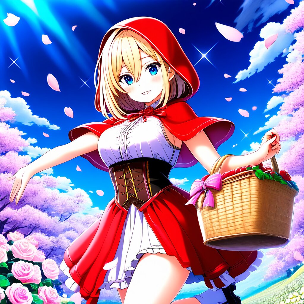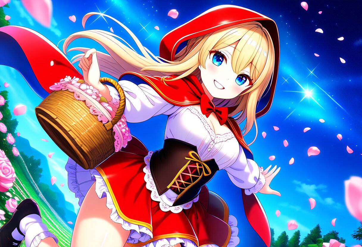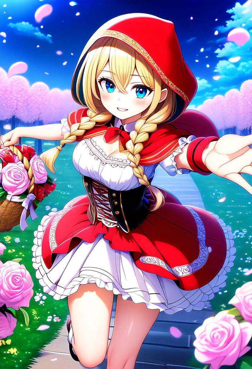 {{{highly detailed}}}, {{official style}}, {{game cg}}, style of ai-generated, {{kenka hyakken, girlfriend (kari)}}, 1girl, solo, blue eyes, hair between eyes, blonde hair, little red riding hood, little red riding hood (grimm), medium breasts, standing, outstretched arms, {{{{running}}}}, cowboy shot, {{smile, happy}}, holding a basket with fruit in it, parted lips, wide open eyes, white and sky blue, check socks, beautiful girl, colorful garden, vivid anime style, elaborate costume, night core, ultra hd, glamorous, gloss and shine, light effect, colorful flower dance, flat color, {{falling blossoms, fields of roses, roses of various colors, colorful roses}}, {{{masterpiece}}}, {{{best quality}}}, {{{very aesthetic}}}, {{{ultra-detailed}}}, {illustration}, {{{extremely detailed}}}, {{{an extremely delicate and beautiful}}}